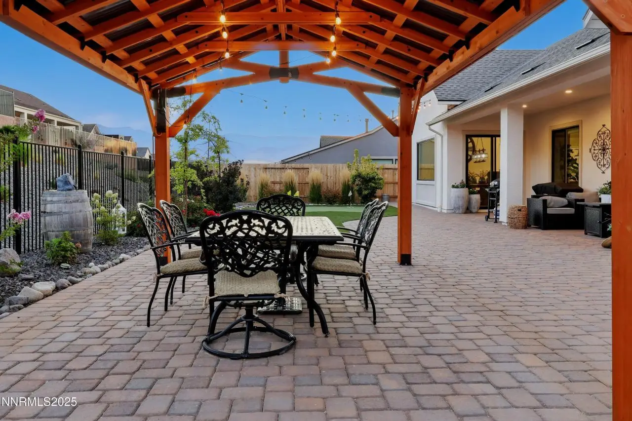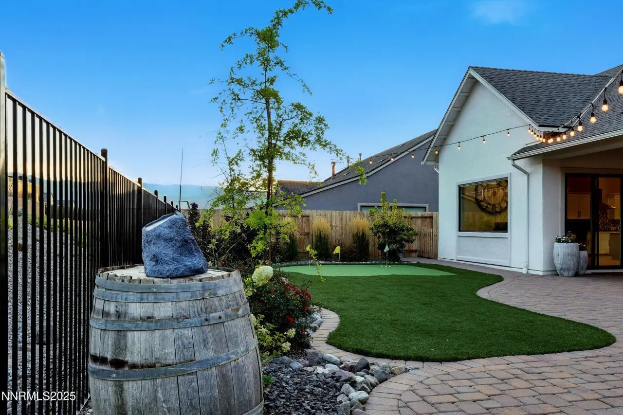 Welcome to Ridgeline at Carmella Ranch! This gated community home features 12' ceilings, European Oak hardwood floors, and upgraded soft-close kitchen cabinetry with a farmhouse sink, double ovens, and walk-in pantry. The primary suite offers an oversized shower and expansive closet. Enjoy multiple outdoor spaces: a front porch with scenic views, a covered back patio, gazebo, and private patio off the primary suite. The low-maintenance yard includes artificial turf and a personal putting green. Experience elevated living in the prestigious gated enclave of Ridgeline at Carmella Ranch. This beautifully appointed home blends timeless design with sophisticated upgrades to create an atmosphere of refined comfort and effortless style. Step inside and be greeted by soaring 12-foot ceilings and wide-plank European Oak hardwood flooring that flows gracefully throughout the main living areas. Elegant 8-foot, six-panel doors and thoughtfully selected high-end fixtures elevate each space, while plush premium carpeting adds warmth to the bedrooms. The chef's kitchen is a true showstopper - designed for both functionality and entertaining. Enjoy upgraded soft-close cabinetry, an oversized island, farmhouse sink, double ovens, and a generous walk-in pantry. The adjacent dining area is accented by a custom shiplap feature wall, adding texture and charm to the open-concept layout. Every wall in the home showcases a hand-troweled, imperfect smooth finish, creating a clean and artful aesthetic. Retreat to the expansive primary suite - a serene sanctuary offering a spa-inspired ensuite with a large walk-in shower, dual vanities, and an oversized walk-in closet. Step out onto your private covered patio for peaceful morning coffee or quiet evenings under the stars. Outdoor living is just as inviting with multiple spaces designed to relax and entertain. From the welcoming front porch with mountain views to the large covered patio, a charming gazebo, and a separate seating area off the primary suite - there's a perfect spot for every moment. The front and rear yards are fully landscaped with high-quality artificial turf for year-round greenery and water efficiency, while the backyard also features a personal putting green for added enjoyment. Every secondary bedroom includes its own walk-in closet and plantation shutters, with two sharing a stylish Jack and Jill bathroom. The floorplan is thoughtfully arranged to provide both comfort and privacy throughout. As a resident of Ridgeline, you'll also enjoy access to exceptional community amenities including a full-sized gym, outdoor pool and spa, indoor/outdoor entertaining spaces, locker rooms, and more. This is more than a home?it's a lifestyle. Schedule your private showing today. Note: Audio and video surveillance systems are in use on the property.