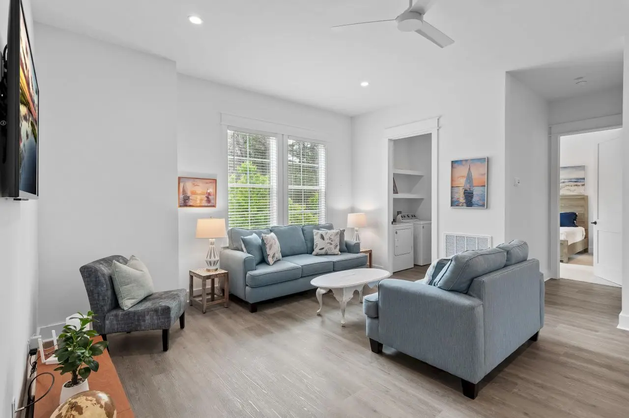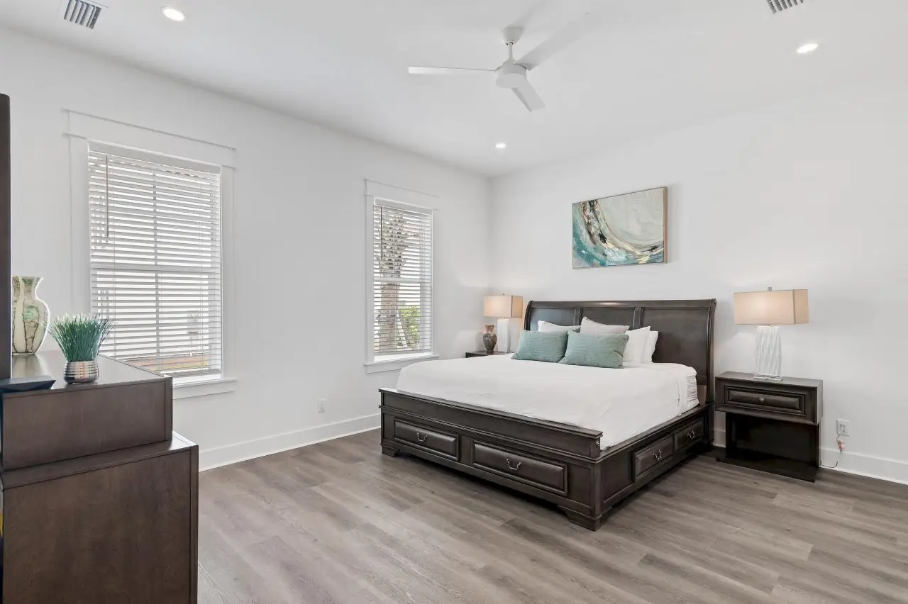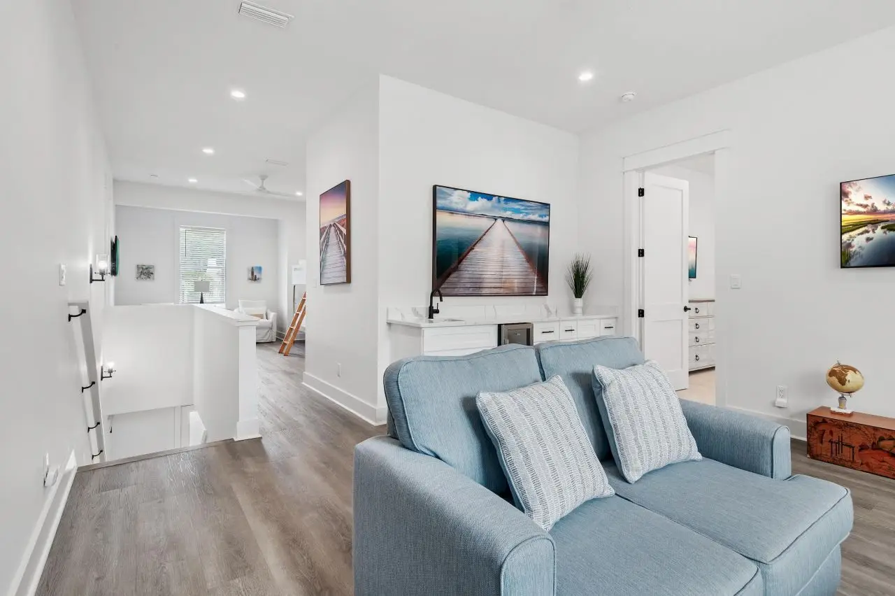 Step into modern coastal elegance in this thoughtfully crafted residence, located in the exclusive gated community of Tops'l Beach and Racquet Resort. This newly constructed 4-bedroom, (plus bonus room), 4.5-bathroom home in Grand Villas, offers a harmonious blend of luxury and comfort across 3,454 square feet of thoughtfully designed living space. Enjoy the convenience of primary suites on both the first and second floors, each featuring spa-like bathrooms for ultimate relaxation. The open-concept kitchen is equipped with top-of-the-line stainless steel appliances, custom cabinetry, and a spacious island, making it perfect for entertaining guests. Step outside to a screened patio featuring a built-in grill, perfect for alfresco dining and enjoying the Florida breeze. A home theater that doubles as an additional bedroom and twin bunks in the upstairs sitting area provide ample space for family and guests. The upstairs sitting area also includes a wet bar. Dual laundry rooms on each floor add to the home's convenience. Situated within the exclusive Grand Villas at Tops'l Beach Club, residents have access to a private community pool, as well as, state-of-the-art fitness center, tennis courts, additional swimming pools, and deeded beach access. Tops'l offers a laid-back coastal vibe with proximity to beautiful beaches and a variety of recreational amenities. Experience the perfect blend of luxury, comfort, and convenience in this exceptional beach retreat. Whether you're seeking a primary residence, vacation home, or investment property, 33 Palm Ridge Road offers an unparalleled coastal living experience.