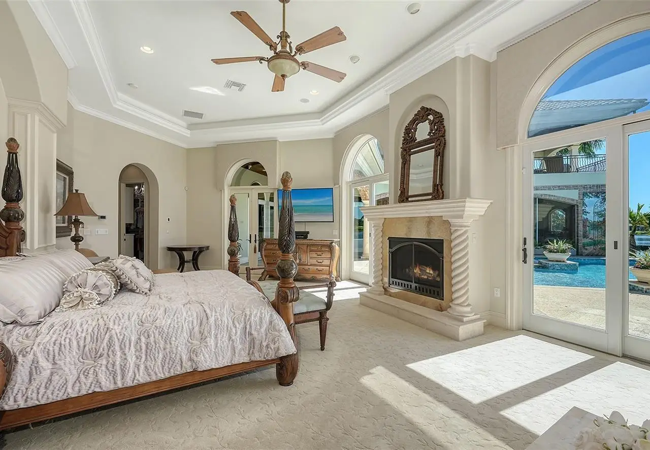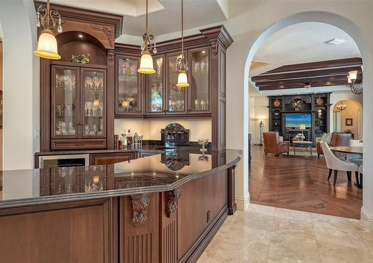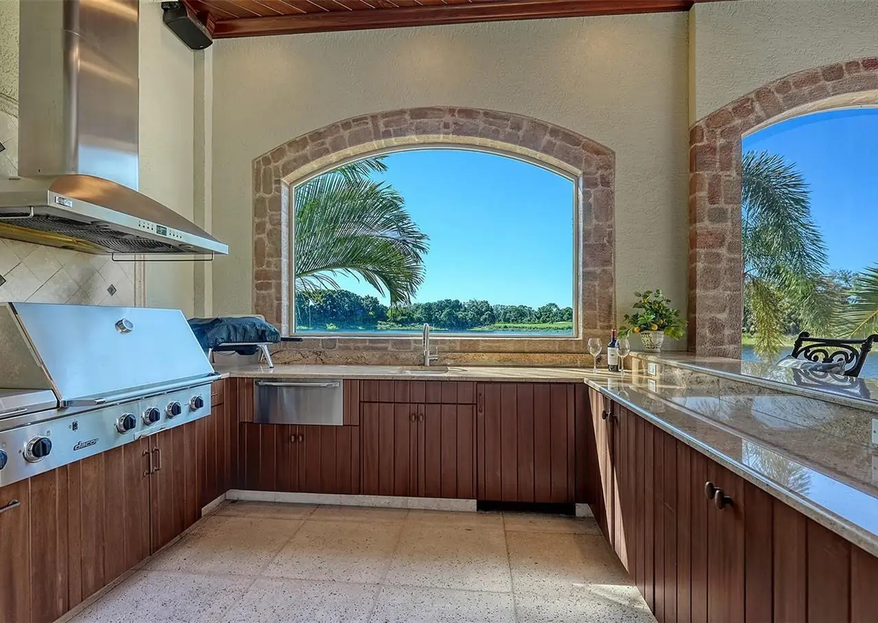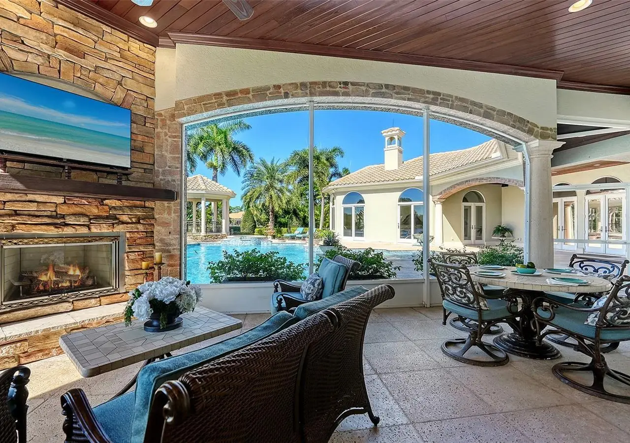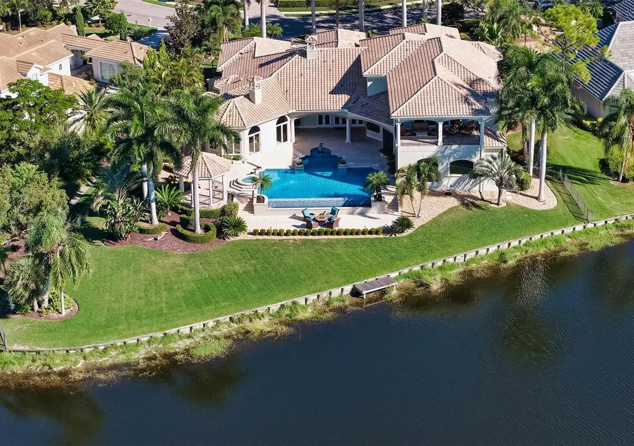 Inside the gates of University Park Country Club in the coveted enclave of Knightsbridge, this notable residence pairs timeless architecture with thoughtful modern UPDATES. Set on ¾ acre and the largest lakefront lot in the Park, the home enjoys complete privacy with sweeping water views and backdrop of the golf course in the distance. Built by one of Sarasota’s premier builders, the home is distinguished by an open-air infinity pool and spa (RE-SURFACED AND NEW TILE), fountains, a detached gazebo, and landscaping groomed to the hilt. The interior with travertine and walnut-plank flooring and custom millwork throughout is a testament of the finest craftsmanship. The everlasting finishes are enhanced with freshly painted walls, updated window treatments and other refinements throughout. The chef’s kitchen is a true centerpiece, recently enhanced with new quartz countertops. Custom cabinetry, a Butler’s Pantry and premium appliances include a six-burner Wolf range, separate wall oven, two Sub-Zero refrigerators, three dishwashers, and a built-in Miele coffee bar—ideal for entertaining on any scale. For those who pine for excellence in construction and everlasting elegance – the talent in this craft of fine carpentry has become more precious with time. The first-floor primary suite features custom closets, updated lighting and electronic shades, a dramatic fireplace, Anderson doors to the pool, and access to a private courtyard. Second level, accessed by ELEVATOR or a grand staircase, you’ll find a theater room for 8, a large bonus room with built-in media wall, full bar, sumptuous guest suite and a covered terrace. Additional highlights include a side entry 4-CAR AIR CONDITIONED GARAGE plus golf cart bay and a separate air-conditioned storage room. A whole house GENERATOR, water filtration and RO, smart lighting system, newer aluminum fencing to secure the entire rear side boundary lines, screened and full outdoor kitchen with stone fireplace, and updated audio system. This is resort-style living in one of Sarasota’s premier gated country club settings that continues to enjoy a reputation of the finest (optional) golf, tennis and racquet sports around. Social mixes and club dining is part of the lifestyle. Appreciate the unequivocal convenience to University Park’s shopping mecca nearby, fine dining, SRQ International Airport and downtown Sarasota just a short 20 minute drive.