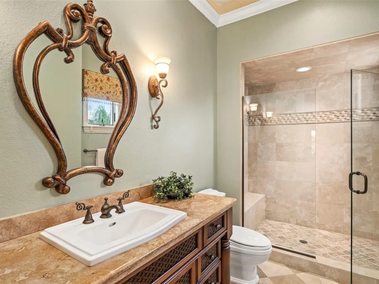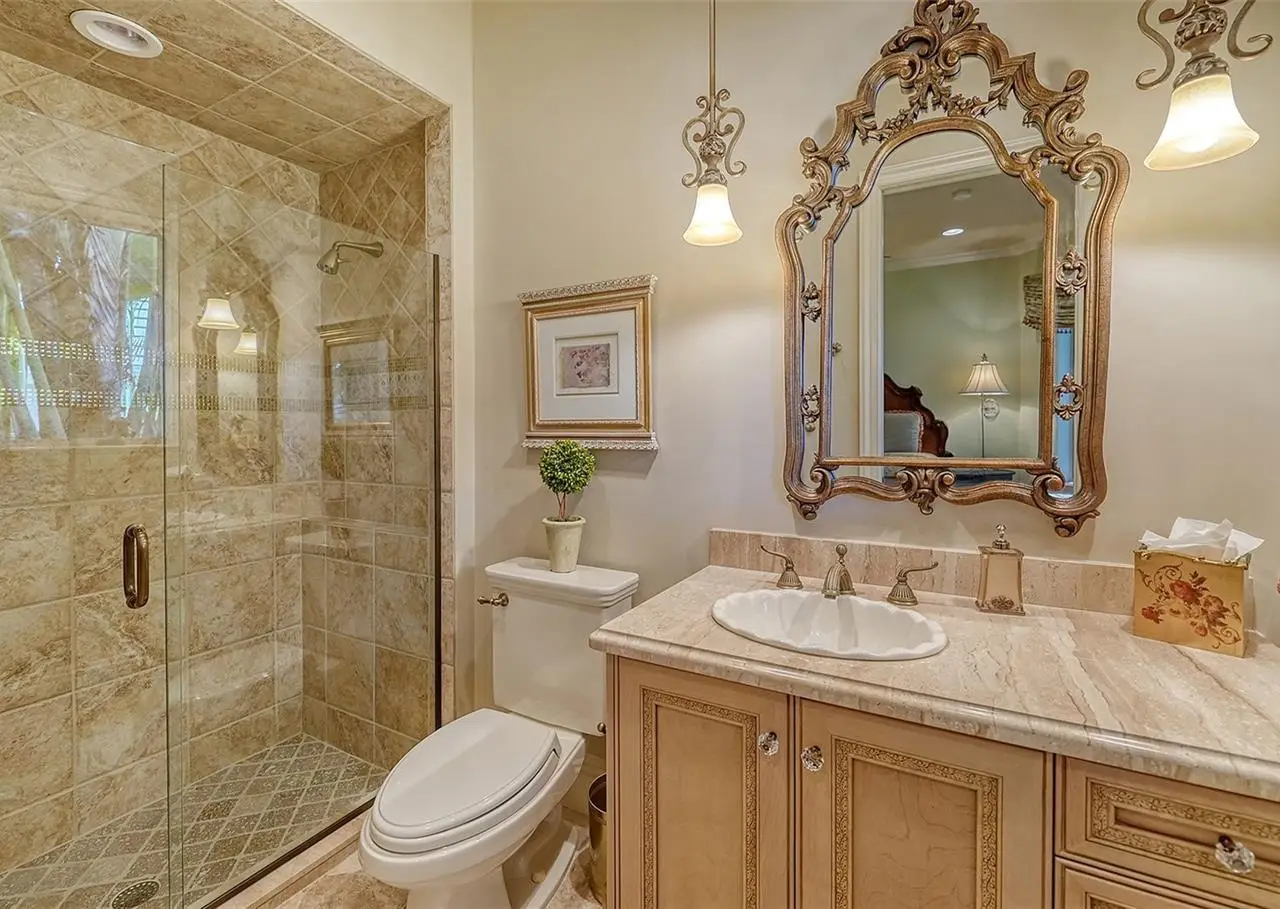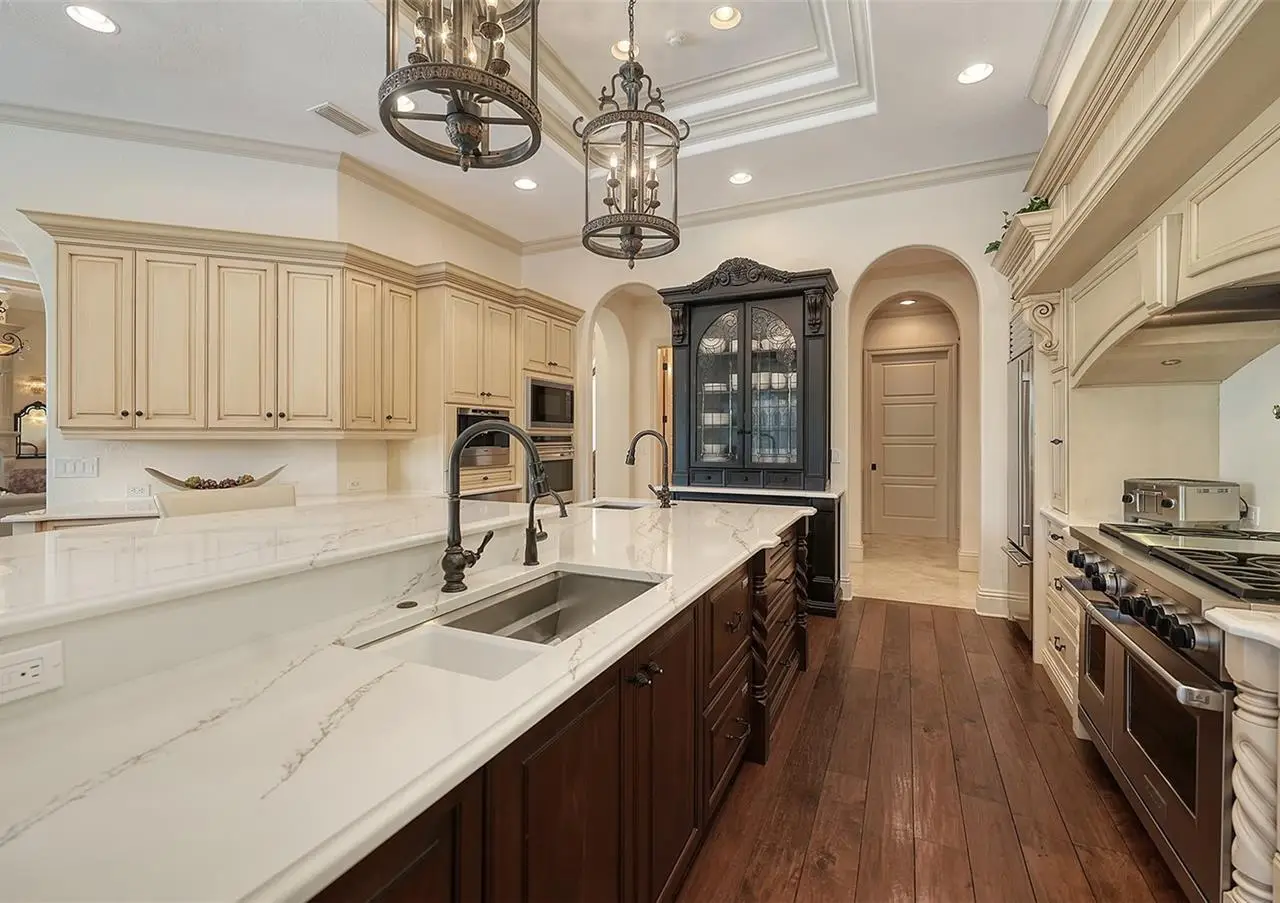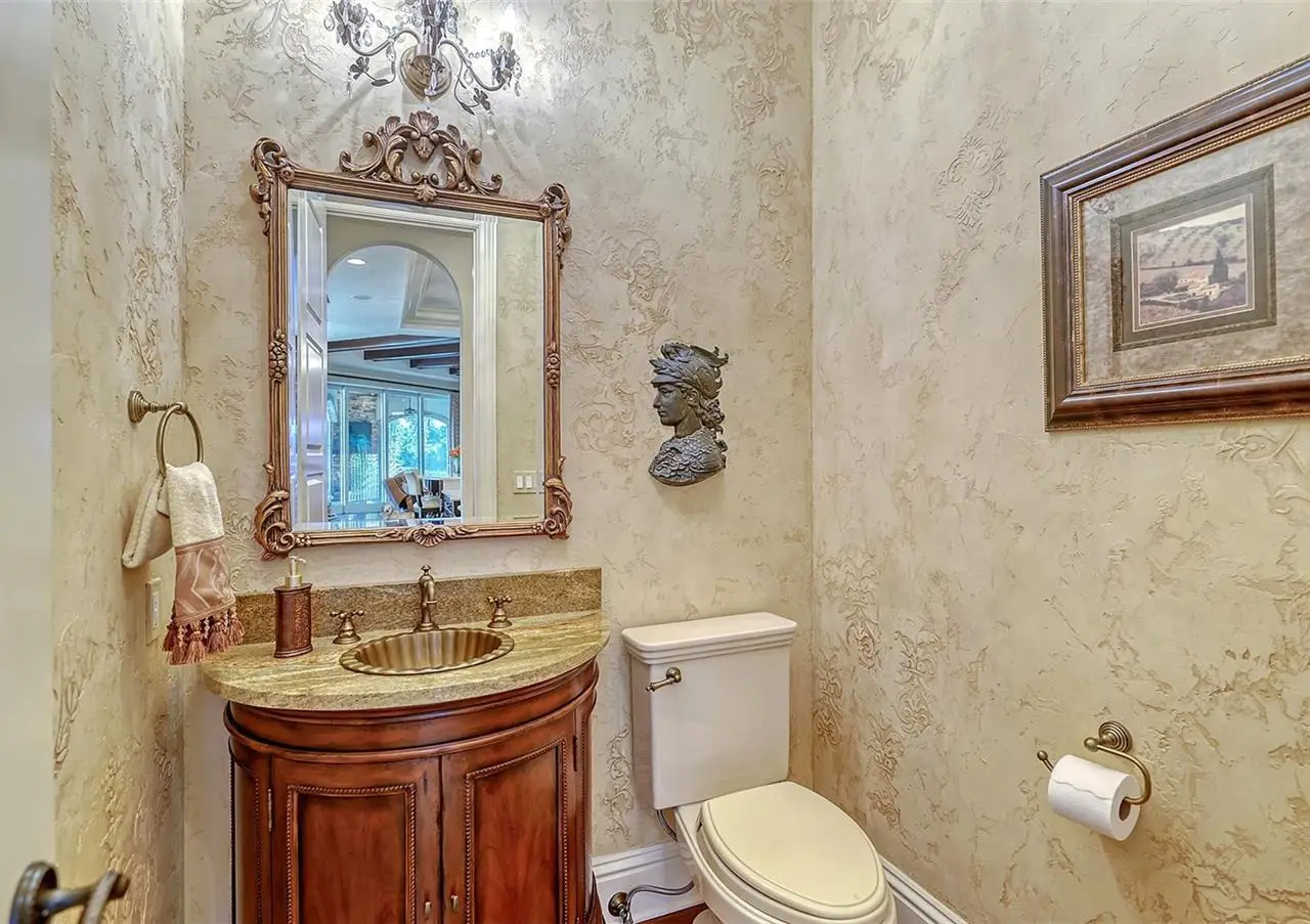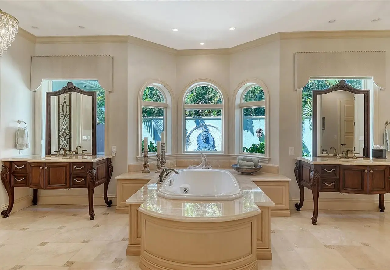 Inside the gates of University Park Country Club in the coveted enclave of Knightsbridge, this notable residence pairs timeless architecture with thoughtful modern UPDATES. Set on ¾ acre and the largest lakefront lot in the Park, the home enjoys complete privacy with sweeping water views and backdrop of the golf course in the distance. Built by one of Sarasota’s premier builders, the home is distinguished by an open-air infinity pool and spa (RE-SURFACED AND NEW TILE), fountains, a detached gazebo, and landscaping groomed to the hilt. The interior with travertine and walnut-plank flooring and custom millwork throughout is a testament of the finest craftsmanship. The everlasting finishes are enhanced with freshly painted walls, updated window treatments and other refinements throughout. The chef’s kitchen is a true centerpiece, recently enhanced with new quartz countertops. Custom cabinetry, a Butler’s Pantry and premium appliances include a six-burner Wolf range, separate wall oven, two Sub-Zero refrigerators, three dishwashers, and a built-in Miele coffee bar—ideal for entertaining on any scale. For those who pine for excellence in construction and everlasting elegance – the talent in this craft of fine carpentry has become more precious with time. The first-floor primary suite features custom closets, updated lighting and electronic shades, a dramatic fireplace, Anderson doors to the pool, and access to a private courtyard. Second level, accessed by ELEVATOR or a grand staircase, you’ll find a theater room for 8, a large bonus room with built-in media wall, full bar, sumptuous guest suite and a covered terrace. Additional highlights include a side entry 4-CAR AIR CONDITIONED GARAGE plus golf cart bay and a separate air-conditioned storage room. A whole house GENERATOR, water filtration and RO, smart lighting system, newer aluminum fencing to secure the entire rear side boundary lines, screened and full outdoor kitchen with stone fireplace, and updated audio system. This is resort-style living in one of Sarasota’s premier gated country club settings that continues to enjoy a reputation of the finest (optional) golf, tennis and racquet sports around. Social mixes and club dining is part of the lifestyle. Appreciate the unequivocal convenience to University Park’s shopping mecca nearby, fine dining, SRQ International Airport and downtown Sarasota just a short 20 minute drive.