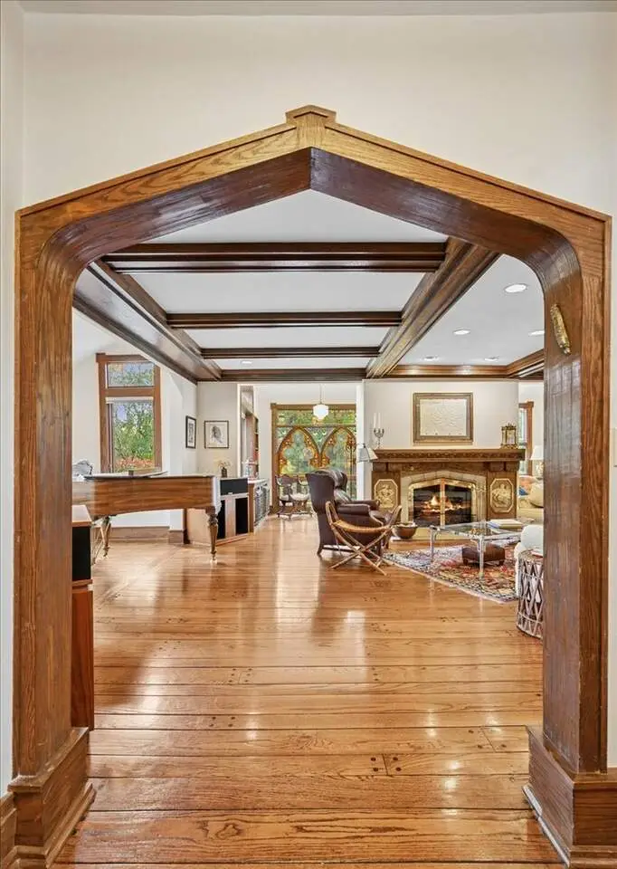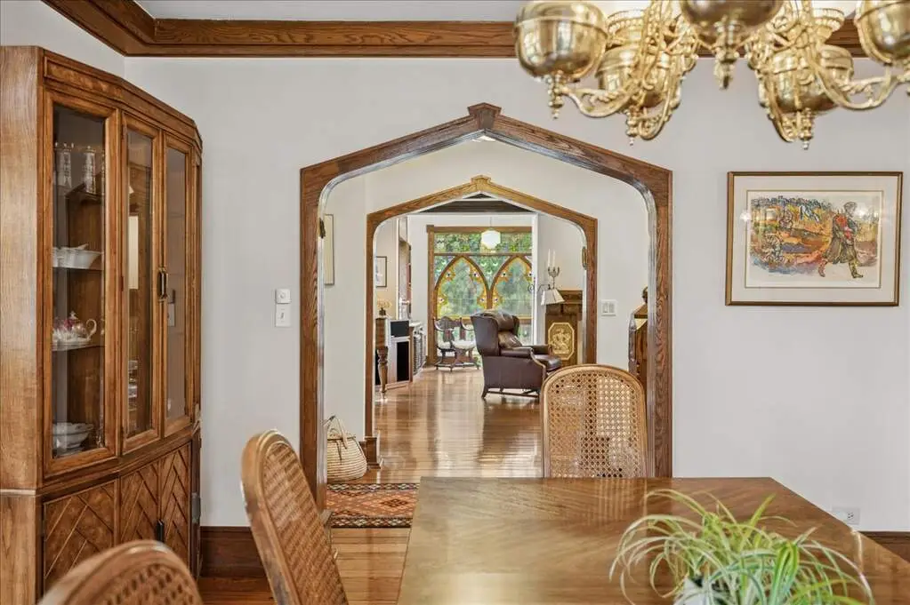 Nestled on a spacious corner lot in Glencoe, this exceptional three-story home is a rare architectural treasure where history, craftsmanship, and livability come together in perfect harmony. Filled with warmth and character, the residence showcases stunning stained glass and beveled glass windows throughout, along with custom carved detailing and one-of-a-kind architectural features that give each room its own special moment. Offering 5 bedrooms plus two additional rooms ideal as offices or flexible guest/bedroom space-perfect for working from home-the layout provides remarkable versatility. The elegant living room is a true showpiece, featuring heavy oak beams and a hand-carved fireplace mantle designed by famed architect George Maher, and it flows into a sunroom wrapped in stained glass; both spaces feature pegged wide-plank oak floors. A large dining room with plank flooring and two stained-glass bay windows sets an inviting stage for gatherings and entertaining. The kitchen, thoughtfully designed with the cook in mind, includes Sub-Zero refrigeration, numerous back-lit stained glass cabinets, and a uniquely carved beveled-glass pocket door opening into a warm and welcoming family room. The primary suite offers built-in cabinetry and closets, along with a large full bath featuring an enclosed shower, whirlpool tub, pedestal sink, built-in medicine cabinetry, and linen storage, plus an additional private half bath with custom vanity. A cozy TV/game room with built-ins provides a comfortable spot for relaxation, while additional finished rooms across the three floors allow for a dedicated exercise room or hobby space. Comfort is paramount with a whole-house electrostatic dust collection system, humidity control, four-zone heating with newer boiler for clean and quiet warmth, and whole-house two-zone air conditioning. Outdoors, enjoy a beautiful garden with auto sprinklers, a greenhouse/atrium with UV lighting, a large attached storage room for gardening and bikes, and a two-car garage. Loaded with charm, warmth, and everyday livability-and truly exceptional for both entertaining and working from home-this lovingly maintained architectural gem offers a lifestyle that is timeless, inspiring, and uniquely special. A security system adds peace of mind to this extraordinary home.