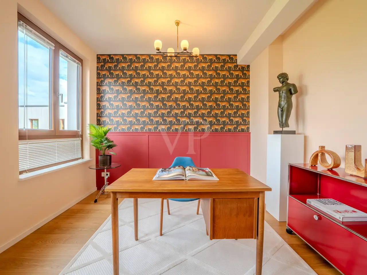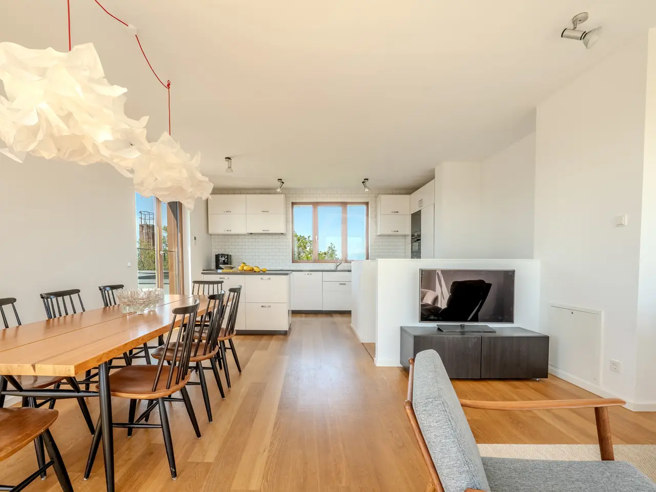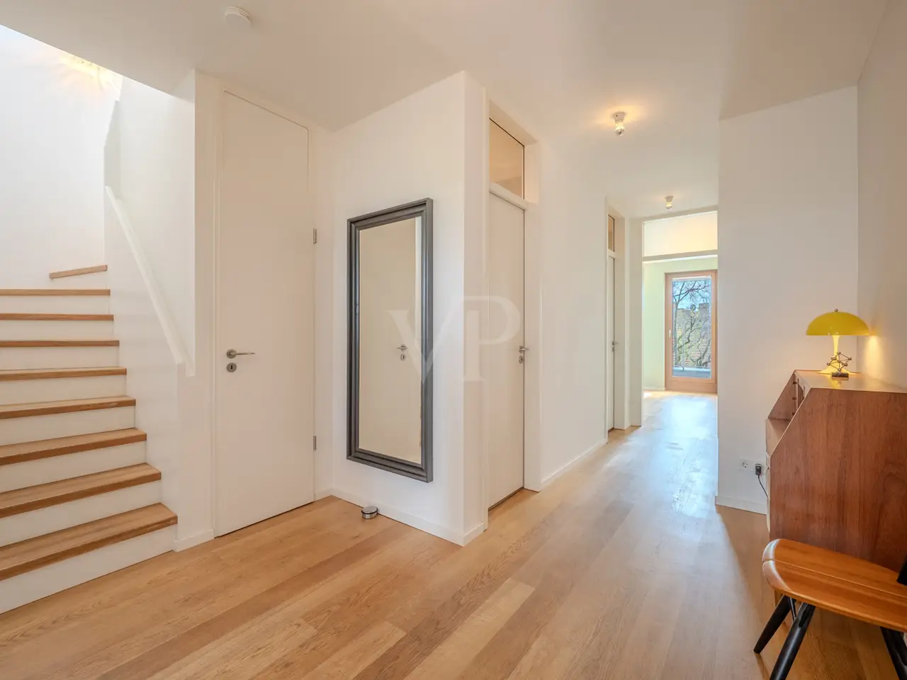 This high-quality penthouse maisonette is located in a building completed in 2016 and impresses with its high-quality fittings and well thought-out room concept. With a living space of approx. 131 m², it offers an ideal retreat in an urban environment. The penthouse is located on the 5th floor and is easily accessible by elevator. The floor plan is optimally laid out and is spread over two floors. The entrance area and three rooms, which can be used in a variety of ways, are located on the lower level. One of the (bedroom) rooms has its own large balcony, while the other two rooms can be designed as a children's room, study or guest room. The hallway has a large wardrobe, while the guest bedroom and bedroom also have large built-in wardrobes. A practical storage room offers even more storage space. The guest bathroom is equipped with a walk-in shower, while the spacious master bathroom with a double bathtub and another shower invites you to relax. Both bathrooms are fitted with high-quality fittings and sanitary objects (including from Villeroy & Boch). A massive, impressive internal staircase - with a gallery up to around 5 meters high - leads to the upper level of the apartment. The spacious living and dining area is surprisingly bright and spacious. You and your guests can expect an open, high-quality fitted kitchen with Miele appliances that meets the highest aesthetic and functional standards. The living area provides direct access to the magnificent, spacious roof terrace - the highlight of the property. Designed as a modern roof garden, the terrace, which cannot be seen from the outside, offers a unique space for relaxation and social gatherings. Depending on your preferences, you can enjoy your free time here gardening, barbecuing or sunbathing - or simply relaxing in the jacuzzi. Thanks to the water and electricity connections, you can easily install a whirlpool here and there is even space for an outdoor sauna. A wide, remote-controlled awning provides protection from the sun, while plants and sun loungers create a vacation atmosphere. From the terrace, you have a spectacular view over the rooftops of Berlin to the TV tower and enjoy unforgettable sunsets in exclusive privacy. No wishes remain unfulfilled when it comes to furnishings and quality of living. Security is provided by a solid entrance door with triple locking, an additional security lock and a video intercom system. Large windows allow plenty of light into the bright rooms and, supported by triple glazing, skylights and electric sun protection, create an excellent living ambience. The apartment's excellent insulation provides effective protection against noise and a comfortable living environment. The high quality of living is also reflected in the flooring: the entire living and sleeping area is fitted with fine real wood parquet flooring and modern underfloor heating, while the bathrooms are tiled with Marazzi porcelain stoneware. The apartment has its own easily accessible underground parking space, which is of course equipped with a remote control and electric charging station. All living areas also have LAN connections and a fiber optic cable is already connected to the building. An additional cellar room with its own power connection offers further storage options. Covered parking spaces for bicycles are available in the underground garage and in the sheltered inner courtyard. This cleverly thought-out, very well-maintained property stands for the highest quality of life and is ideal for urban individualists who want to live in a central yet relaxed location. Interested parties have the opportunity to see the advantages of this special property for themselves during a non-binding viewing.