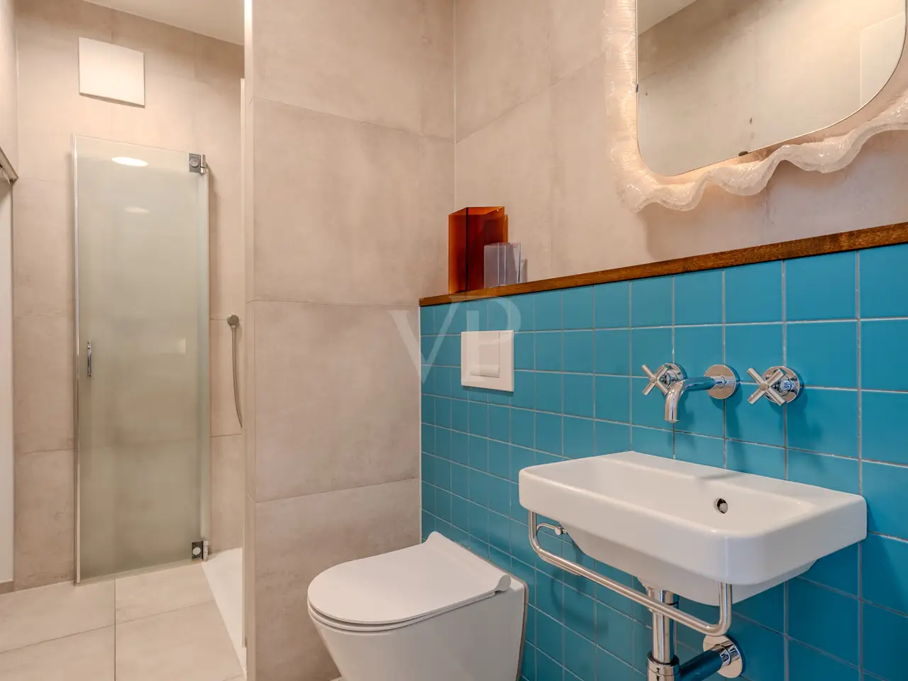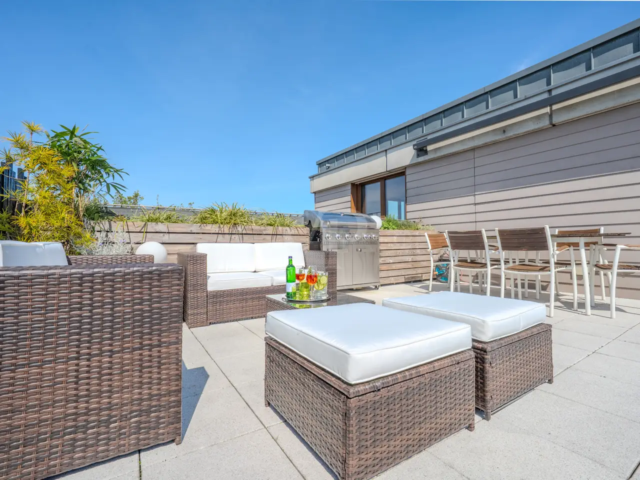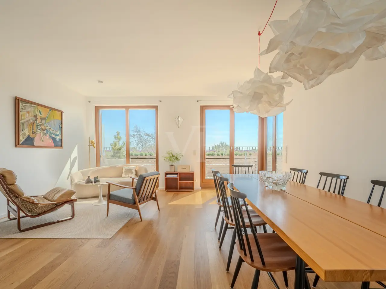 This high-quality penthouse maisonette is located in a building completed in 2016 and impresses with its high-quality fittings and well thought-out room concept. With a living space of approx. 131 m², it offers an ideal retreat in an urban environment. The penthouse is located on the 5th floor and is easily accessible by elevator. The floor plan is optimally laid out and is spread over two floors. The entrance area and three rooms, which can be used in a variety of ways, are located on the lower level. One of the (bedroom) rooms has its own large balcony, while the other two rooms can be designed as a children's room, study or guest room. The hallway has a large wardrobe, while the guest bedroom and bedroom also have large built-in wardrobes. A practical storage room offers even more storage space. The guest bathroom is equipped with a walk-in shower, while the spacious master bathroom with a double bathtub and another shower invites you to relax. Both bathrooms are fitted with high-quality fittings and sanitary objects (including from Villeroy & Boch). A massive, impressive internal staircase - with a gallery up to around 5 meters high - leads to the upper level of the apartment. The spacious living and dining area is surprisingly bright and spacious. You and your guests can expect an open, high-quality fitted kitchen with Miele appliances that meets the highest aesthetic and functional standards. The living area provides direct access to the magnificent, spacious roof terrace - the highlight of the property. Designed as a modern roof garden, the terrace, which cannot be seen from the outside, offers a unique space for relaxation and social gatherings. Depending on your preferences, you can enjoy your free time here gardening, barbecuing or sunbathing - or simply relaxing in the jacuzzi. Thanks to the water and electricity connections, you can easily install a whirlpool here and there is even space for an outdoor sauna. A wide, remote-controlled awning provides protection from the sun, while plants and sun loungers create a vacation atmosphere. From the terrace, you have a spectacular view over the rooftops of Berlin to the TV tower and enjoy unforgettable sunsets in exclusive privacy. No wishes remain unfulfilled when it comes to furnishings and quality of living. Security is provided by a solid entrance door with triple locking, an additional security lock and a video intercom system. Large windows allow plenty of light into the bright rooms and, supported by triple glazing, skylights and electric sun protection, create an excellent living ambience. The apartment's excellent insulation provides effective protection against noise and a comfortable living environment. The high quality of living is also reflected in the flooring: the entire living and sleeping area is fitted with fine real wood parquet flooring and modern underfloor heating, while the bathrooms are tiled with Marazzi porcelain stoneware. The apartment has its own easily accessible underground parking space, which is of course equipped with a remote control and electric charging station. All living areas also have LAN connections and a fiber optic cable is already connected to the building. An additional cellar room with its own power connection offers further storage options. Covered parking spaces for bicycles are available in the underground garage and in the sheltered inner courtyard. This cleverly thought-out, very well-maintained property stands for the highest quality of life and is ideal for urban individualists who want to live in a central yet relaxed location. Interested parties have the opportunity to see the advantages of this special property for themselves during a non-binding viewing.