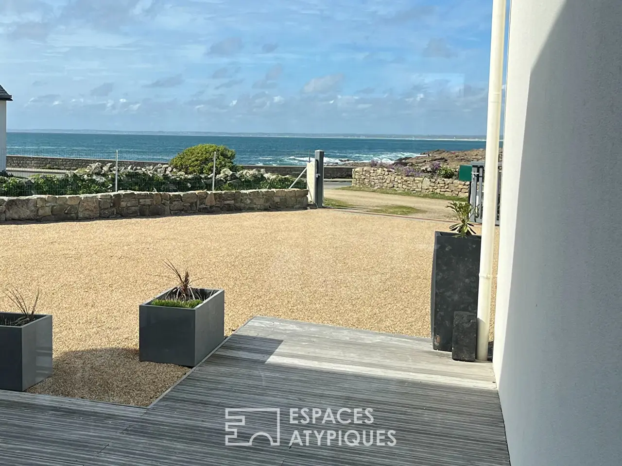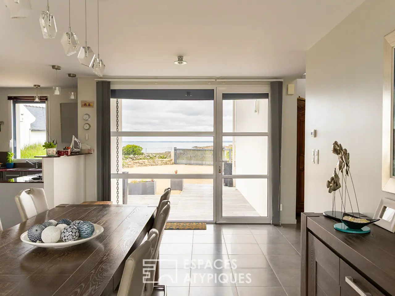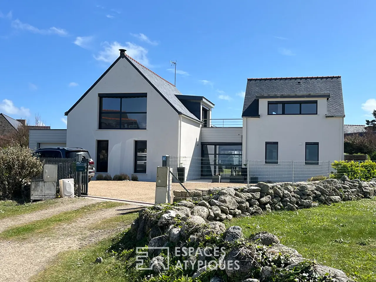 In Saint-Guenole, in the commune of Penmarch, near La Torche, along the sea and the coastal path, stands this large and elegant architect-designed house with Californian inspiration, built in 2011. Located opposite the Viben cove, just a few meters from the shoreline, it offers views of the Atlantic Ocean and the Bay of Audierne. Designed by an architect, this house captivates with its contemporary architecture, spaciousness, natural light, and layout in two wings connected by a vast, open-plan living area that flows seamlessly into the garden and south-facing terrace. Built on a 1400sqm plot facing the sea, the 200sqm house offers an exceptional living environment, close to Pors Carn beach in La Torche, one of the most beautiful in southern Finistere, and near surf schools, bars, restaurants, coastal paths, the port of Saint-Guenole, and shops. It comprises seven rooms, including two open-plan living areas, one of which is a very large living room with triple exposure and access to the rooftop terrace overlooking the ocean. With five bedrooms, three shower rooms, a bathroom, and ample storage, it boasts a bright and functional interior offering sea and garden views. The ground-floor entrance opens onto the open-plan living area with sea and garden views, the heart of the house. This area includes a dining space adjacent to the fitted and equipped kitchen on one side, which extends into a pantry; on the other, a spacious hallway with elegant storage leads to the ground-floor sleeping area with access to the upper floor. This level includes four bedrooms, three of which have sea views. Two bedrooms have en-suite shower rooms, while a separate bathroom and a separate toilet complete this level. The upper floor, accessible via a beautiful custom-made wood and stainless steel staircase crafted by a local artisan, houses a stunning living room with triple exposure and panoramic sea views. This exceptional space opens onto a rooftop terrace, which also provides access to the second part of the house, where the master suite overlooks Audierne Bay. Also accessible via a private staircase from the ground floor, the master suite offers peace, privacy, and comfort. Equipped with storage, a shower room with toilet, and direct access to the terrace, it benefits from triple exposure and views of Audierne Bay, the garden, and the rocky path. Additional amenities on the garden side of the property include a terrace, an outdoor shower for rinsing off after the beach, and a 45 sq m outbuilding (suitable for storage) for bicycles, a lawnmower, windsurfing boards, paddleboards, etc. With its contemporary lines, generous proportions, high-quality features, and exceptional setting, this property combines all the advantages of a high-end primary or secondary residence in the heart of southern Finistere. A rare find in a privileged location within a residential hamlet, offering complete privacy by the sea. Points of interest: Port of St Guenole, Pointe de la Torche, beaches within walking distance & beach restaurants, surf school, hiking trails (PR & GR34), coastal paths. Port of Guilvinec 15 min, Plomeur 10 min, Pont Labbe 15 min, Quimper 30 min, Paris-Quimper TGV 3.40h. Energy rating C, climate rating A - estimated annual energy costs for standard use: between EUR2,340 and EUR3,220. For information on the risks to which this property is exposed, please consult the Georisques website: https://www.georisques.gouv.fr Contact: Catherine 06 87 06 91 87 catherine.dupre@espaces-atypiques.com Sales agent - RSAC n°518 237 672 Quimper Agency fees: 5% including VAT payable by the seller for properties over EUR200,000 Flat fee of EUR10,000 including VAT payable by the seller for properties under EUR200,000.REF. 1615EAFAdditional information* 7 rooms* 5 bedrooms* 1 bathroom* 3 shower rooms* 1 floor in the building* Outdoor space : 1400 SQM* Parking : 4 parking spaces* Property tax
