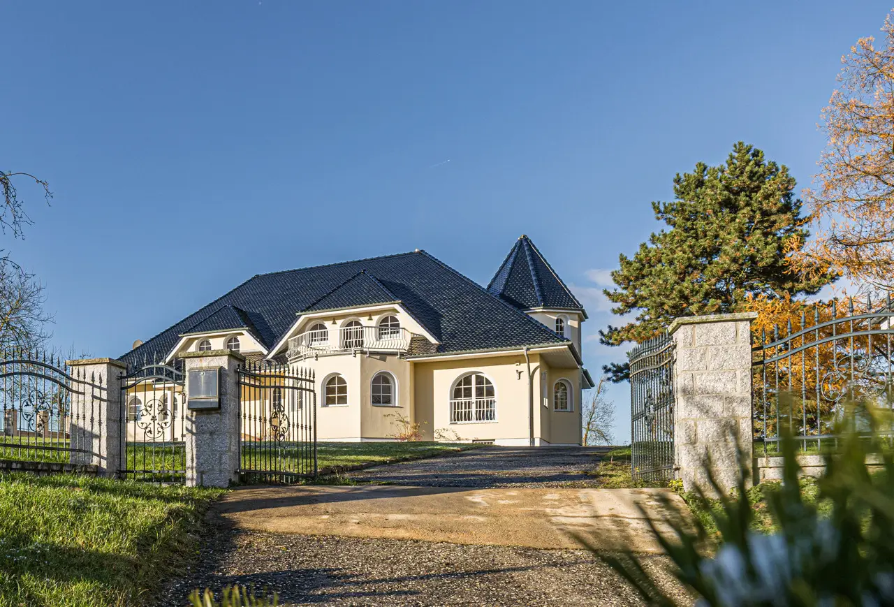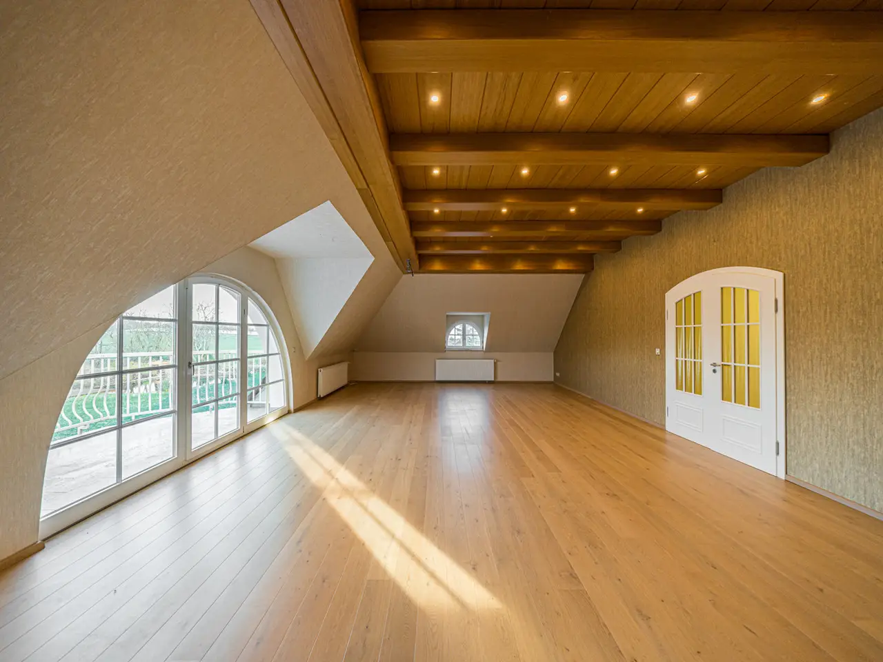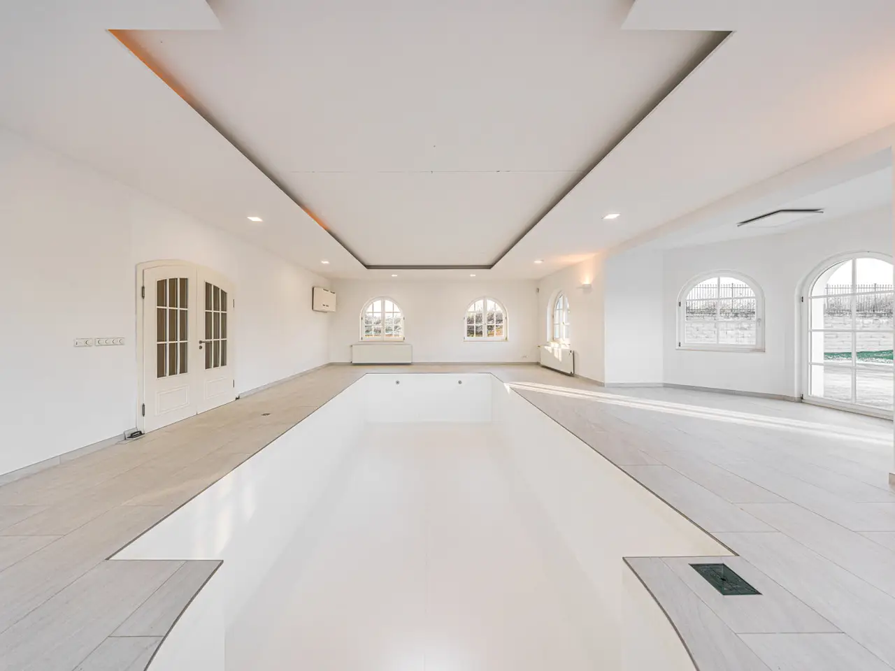 This exceptional villa combines timeless elegance and modern luxury in a unique architectural design. Situated on a spacious plot, this property not only offers generous space, but also the highest quality of life and privacy. The imposing entrance area welcomes you with a cantilevered oak staircase that majestically extends over two floors and provides a view of the stylish staircase. This architectural masterpiece creates a feeling of space and exclusivity right from the entrance area. With a total of ten luxurious rooms on two floors, the villa offers a harmonious blend of modern design and functional elegance. The first floor impresses with its spacious, light-flooded rooms, which are fitted with the finest parquet and stone flooring and create a warm, inviting atmosphere. The high ceilings and the open, airy room concepts give each room an impressive sense of space. On the upper floor, a wraparound gallery awaits you, offering a clear view of the impressive entrance area and the rooms below. Here you can see the exclusive rooms, some of which have access to a private balcony and offer a breathtaking view of the well-tended grounds and the surrounding area. The large windows provide plenty of natural light and allow the house to shine in a harmonious light. The villa has an ultra-modern, luxurious kitchen that leaves nothing to be desired. Equipped with state-of-the-art appliances, this kitchen is not only a meeting point for culinary delights, but also the heart of the house. The same goes for the bathrooms, which have been designed with the finest materials to create a spa-like feeling for every family member or guest. Another highlight is the heated indoor pool, which can be used all year round and conveys the feeling of vacation and relaxation right in your own four walls. The adjoining wellness area perfectly complements the luxurious ambience. The spacious terrace with an area of approx. 300 m², covered with fine sandstone, invites you to relax and linger. It offers ample space for lounge areas, dining facilities and at the same time provides a breathtaking view of the extensive outdoor area, which is equipped with a swimming pond, a fountain and a well-tended garden landscape. There is also a dog kennel on the grounds. The villa is complemented by a spacious 100 m² garage, which offers enough space for several vehicles and meets the highest standards of comfort. With all its unique features and luxurious appointments, this villa is the perfect home for discerning buyers looking to realize the dream of exclusive living in the highest style and comfort. Live the luxury you deserve - in a home that leaves nothing to be desired.