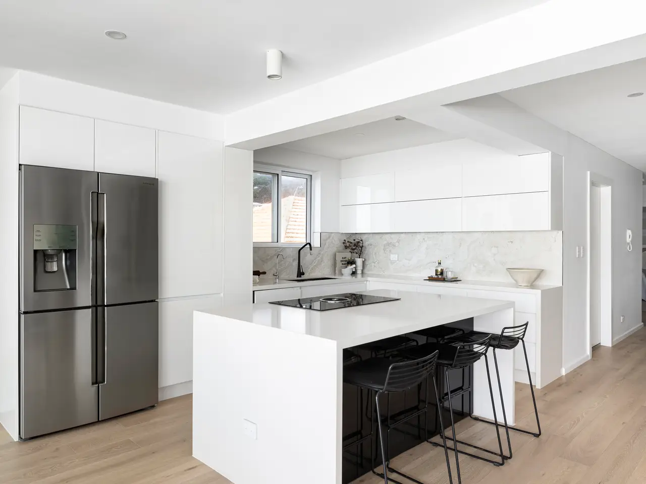 Designer stone crafted island kitchen, Bosch cooktop, integrated dishwasher