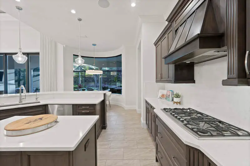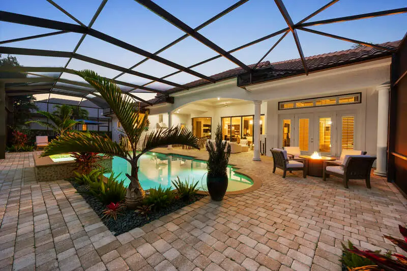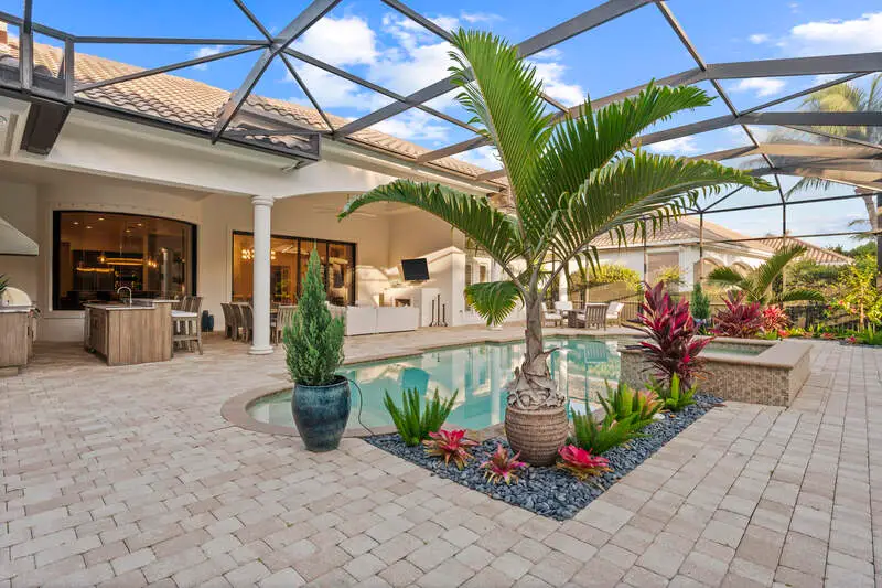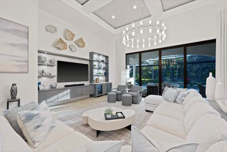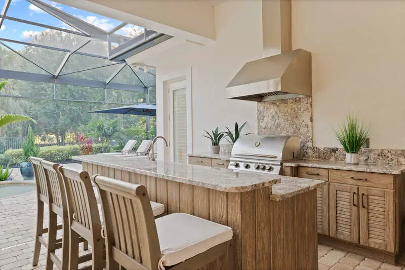 Experience the perfect blend of comfort and style in this newer yet freshly upgraded home thoughtfully inspired by Cardamom Design. Offering the most sought after southwest exposure, the screened lanai features various areas for relaxing, a full outdoor kitchen, built-in fireplace and inviting fire pit plus all-day sun and magnificent evening sunsets. The indoor/outdoor flow delights with a bright, open floor plan and premium finishes end to end- including a gourmet kitchen with upgraded appliances, newer countertops, custom cabinetry and wrap-around island for easy entertaining, a soaring great room with built-in tv wall and wine cooler and clever architectural touches throughout. The primary suite is a private oasis with a spa-like bath and generous walk-in closets while the overall floor plan flawlessly functions to allow privacy for owners and visitors alike. Dine al fresco or step inside to a separate dining room with built-ins or a casual breakfast area. Recently painted inside and out with many upgrades such as an air-conditioned 3-car garage with new built-in storage, Sonos sound system, custom closets and whole house generator, this home captivates at every turn.
