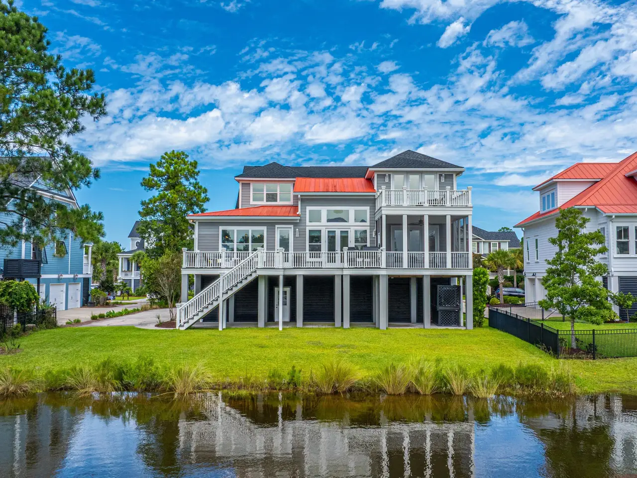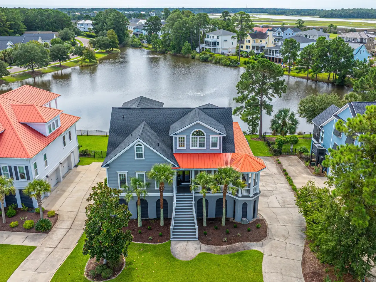 Welcome to this meticulously maintained elevated 5 Bedroom/4 Bath quintessential Charleston home located in Rivertowne Country Club with a center view of the large pond. This home offers timeless elegance and numerous modern upgrades throughout. From the moment you arrive you'll appreciate the inviting wrap around porch with gazebo great for rocking or having a leisurely breakfast. Then step into the bright spacious interior featuring coffered ceilings in the dining room and downstairs bedroom, wainscoting, 10' ceilings, 12'' moldings, 8'' baseboards, and 8' solid interior doors downstairs, 6' upstairs, iron stair railings, adding sophistication to every room. In addition, the home boasts all new light fixtures and ceiling fans, freshly painted neutral interior, new carpets andre-finished hardwood floors. The spacious large living room features a dramatic two-story ceiling, French Doors, completely trimmed first and second story windows, built-in bookshelves with large lower cabinets, gas fireplace with granite surround, and a large TV niche over the fireplace with surround sound system - perfect for game days or movie nights. Arched doorways lead you to the white cabinet eat in kitchen complete with center island with bar seating, all new Bosch/Kitchenaid appliances and an open layout to the spacious family room - perfect for everyday living and intimate gatherings. Retreat to the primary suite with tray ceilings, two walk in closets, luxury spa bath and shower and two separate sink areas with direct access to the covered screened porch. The second level offers 3 large spacious bedrooms - one with an ensuite and walk in closet and the others with jack and jill bathroom. An elevator shaft is already in place for all 3 floors offering current additional storage. The drive under 3-car garage offers enough room for 5 car spaces, workshop, man cave and work out area complete with Race Deck flooring. Thermal tint on all back windows to protect from heat. The exterior highlights include landscape lighting, French Drain, New Roof (2023), rock ribbon flower beds, 4 mature Palmetto palm trees, and tankless water heater. Move-in ready! Welcome Home! Rivertowne Country Club is an Arnold Palmer signature course and is rated 4.5 stars by golf digest.