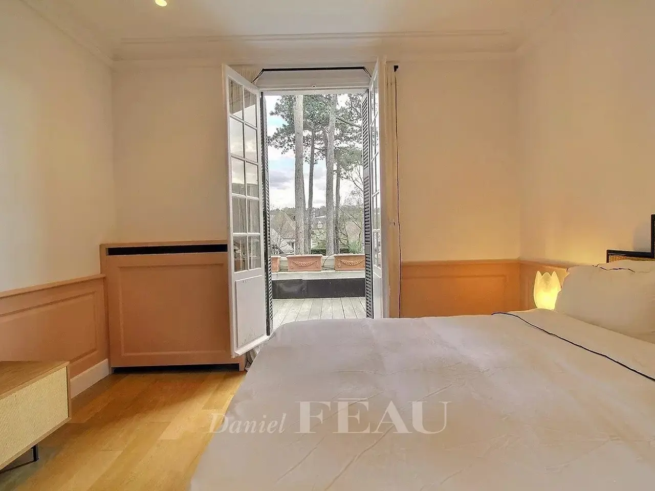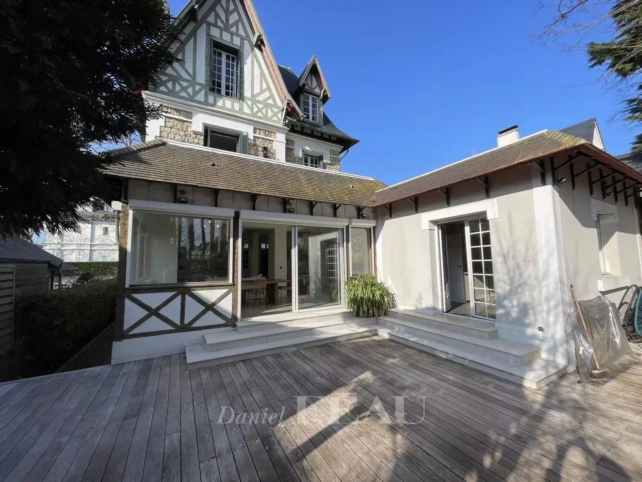 EXCEPTIONAL PROPERTY IN EXCELLENT CONDITION TERRACES AND LANDSCAPED GARDEN. This property comprises a generously proportioned villa in excellent condition and a comfortable guest house. Large sunny terraces and landscaped walled garden. The main house, typical of Deauville bourgeois villas, comprises: an entrance hall, a vast, bright reception room with fireplace, a dining room and a separate kitchen; on the 1st floor: a landing leading to two large bedrooms, one with a lovely terrace and the second with a balcony, a bathroom; on the top floor: a landing with cupboards, two bedrooms and a shower room with toilet. Guest toilet and checkroom on the first floor. Basement: laundry room, cinema room, toilet, shower room and storeroom. In the outbuilding, a guest house comprising a living room with a fitted and equipped kitchen, a bedroom with fitted closets and a shower room with toilet. A property in exceptional condition, refined and comfortable, both for families and for entertaining. Ideal location, close to all amenities and the beach.