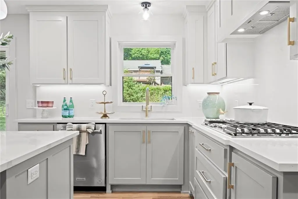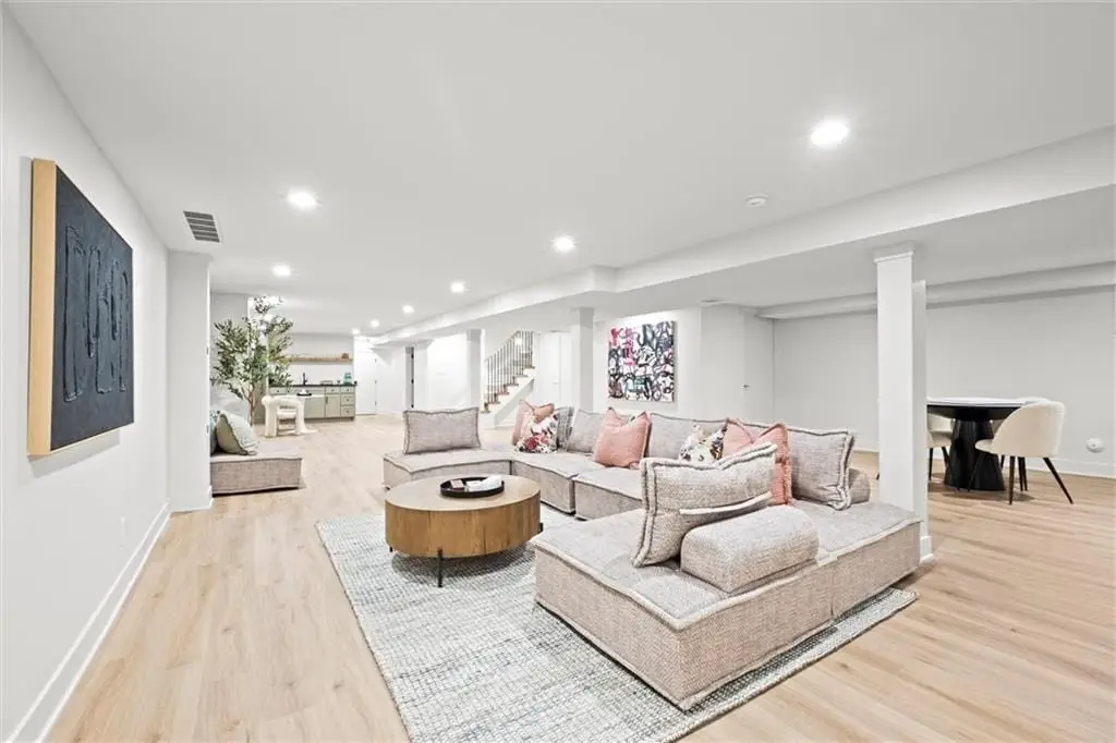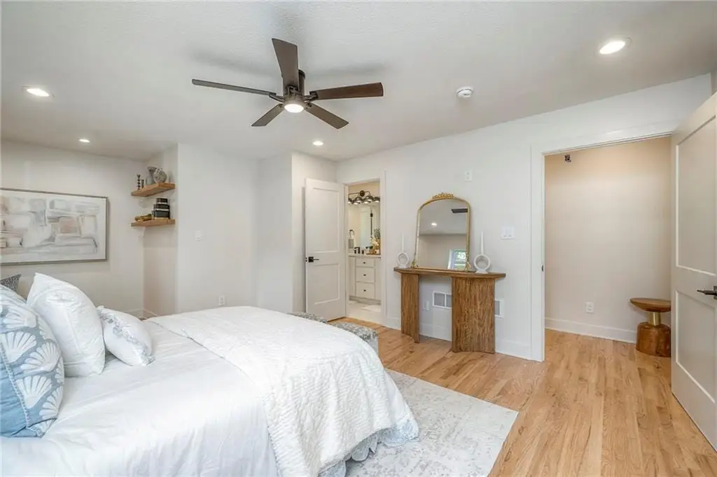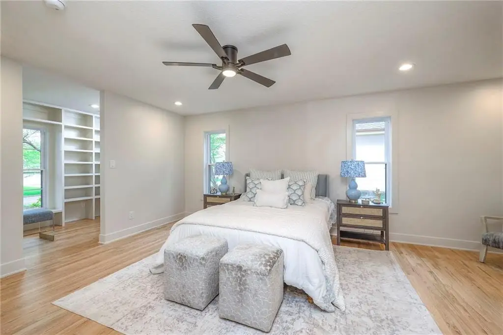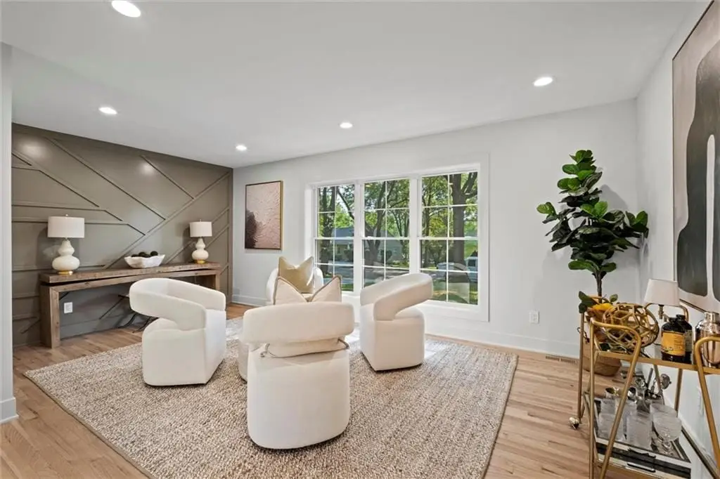 Welcome to this quintessential Old Leawood sprawling ranch nestled on a beautiful lot in Leawood Estates. This 1.5-story brick and stucco home has been completely remodeled to perfection by combining modern luxury with timeless elegance. New concrete work, new sprinkler system, new garage doors, and new sod welcome you. As you enter the new front door, details abound. The expansive floor plan seamlessly connects the kitchen, dining and living areas. The stunning kitchen is loaded with high end appliances, under mount lighting, quartz, an island, accent lighting and the fridge stays. The home is outfitted with all new windows, doors and a slider. There is even the most beautiful butler’s pantry tucked away, but sure to delight. The family room is grounded by shelving and cabinets flanking the shiplap and brick fireplace wall. The large formal living room/dining room is complete with an accent wall. There is an office/ bedroom on the main level along with the deluxe primary suite retreat. A huge walk-in closet, sitting area and beautifully appointed bathroom with a walk-in spa-like shower await. Ambient lighting and accent stair carpeting invite you upstairs to two adorable and huge secondary bedrooms and an oversized bathroom that is fun and fresh. The basement is a dream. There is plenty of room to watch TV, play games and entertain with multiple living spaces, closet storage space and a wet bar! There are two additional bedrooms with new egress windows and big closets, plus a full bathroom to finish off this floor plan. The backyard has a concrete slab and is treed, with new grass and a full sprinkler system.