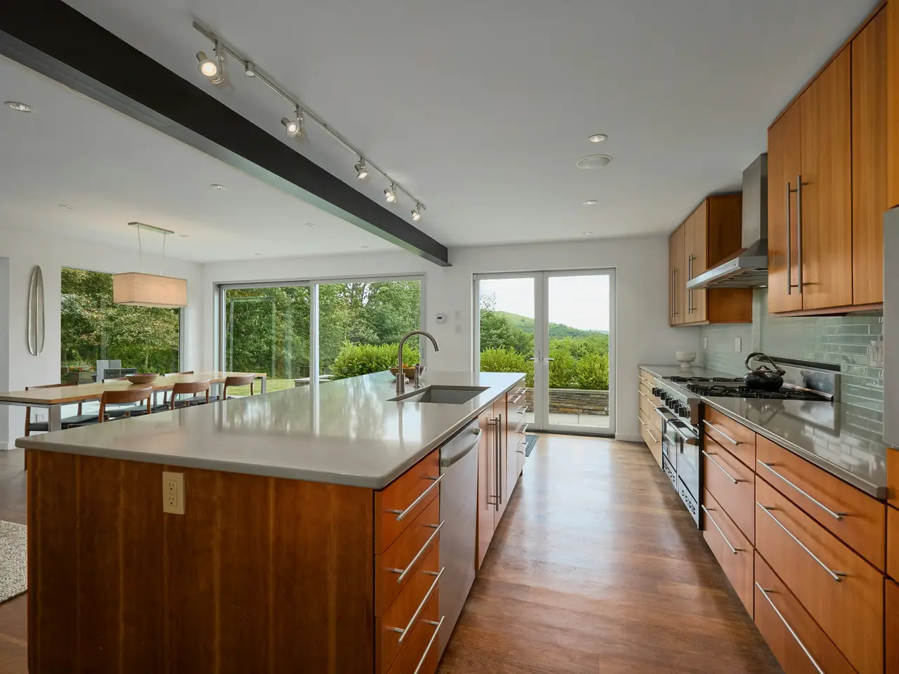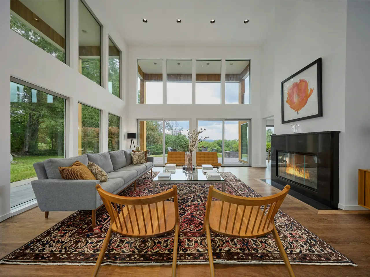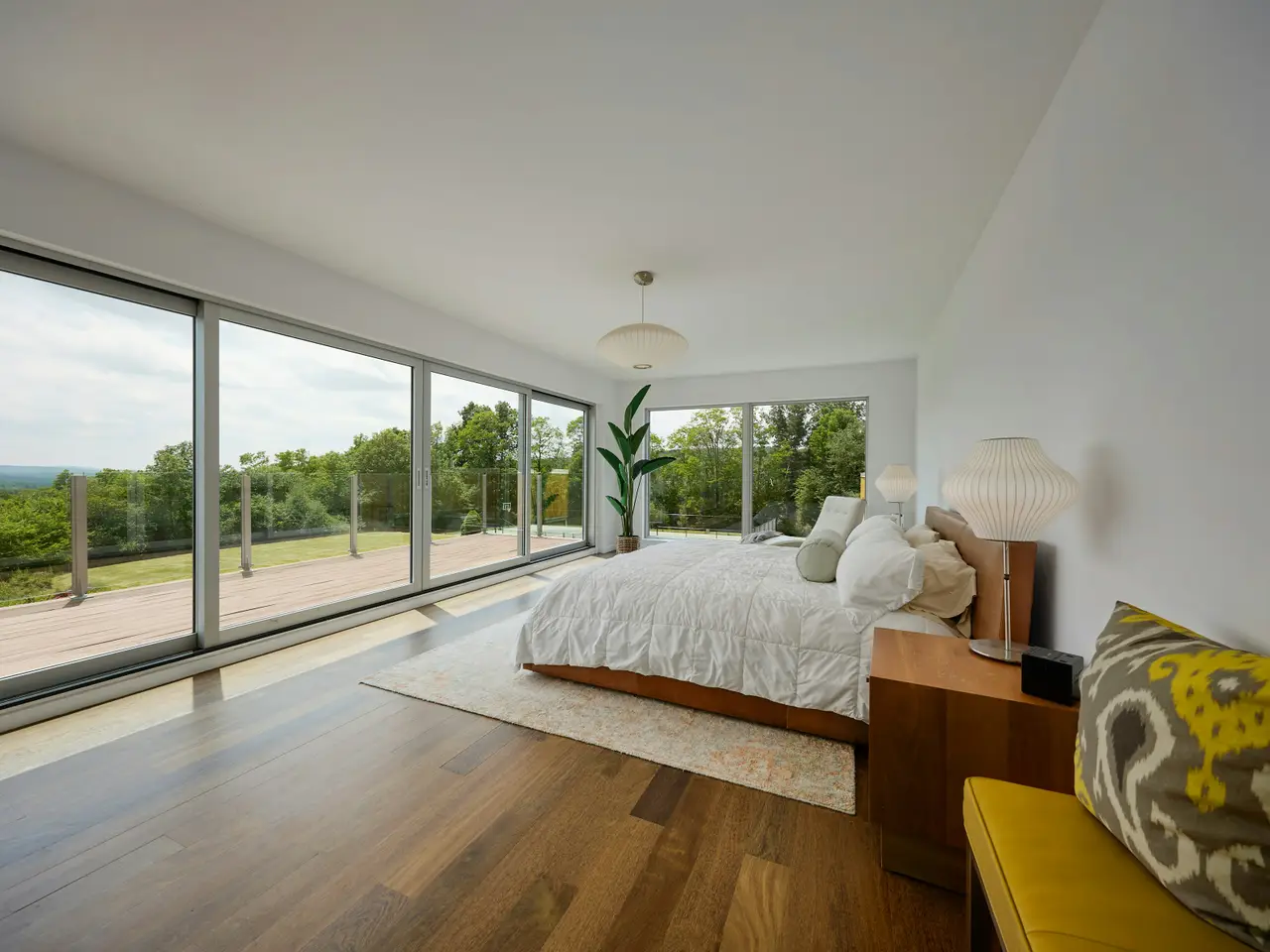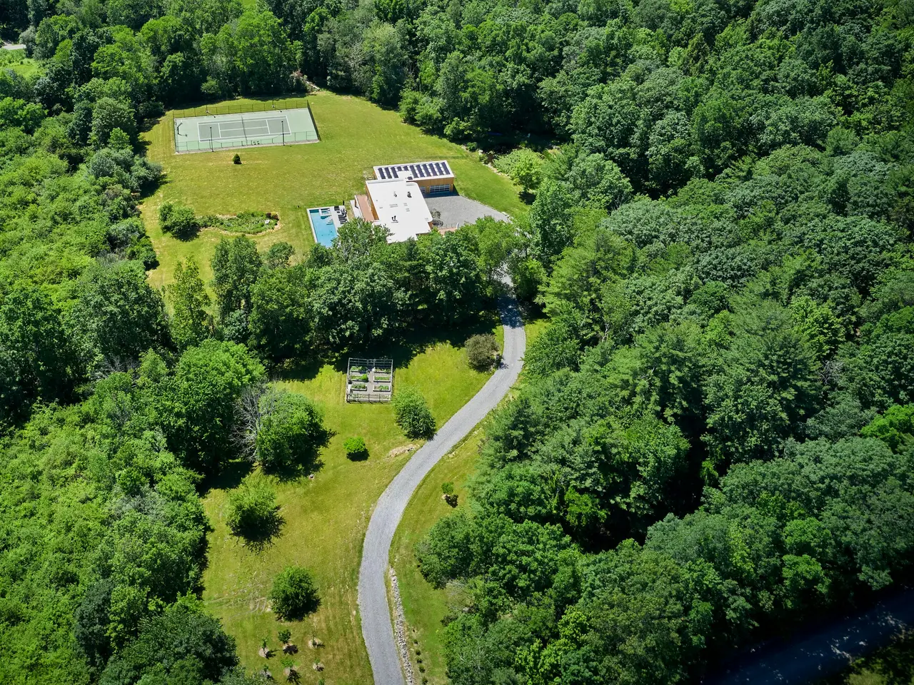Bathed in sunlight, this graceful architectural masterwork is perfectly sited on ten private acres with awe-inspiring panoramic southern mountain views stretching endlessly, offering an ever-changing magical canvas of light and landscape. A home for all seasons, this newly re-built and expanded cedar house stands as if it rose from the landscape. A porte cochere and formal entry welcome you to a dramatic, sun-drenched living space where serenity meets sophistication. Impressive for entertaining or just for quiet reflection, the soaring ceilings, wood-burning fireplace, and walls of glass showcase each season's magic. Breathtaking views unfold throughout the home's effortless flow between interior comfort and nature's beauty. The house, wrapped to the south, east and west with 3000 sf of bluestone patios, supports a fire pit, open-air or covered dining, around the pool, and endless lounging areas. At the heart of the home, an expansive modern kitchen - with butler's pantry - opens to gracious dining and a separate living area centered around a second wood-burning fireplace. A continued wall of glass doors opens to the sweeping bluestone patios; an invitation to dine under the stars with fresh organics from the garden or savor quiet morning light. Also on the main floor is the spacious entertainment / game room that opens to a grand covered patio overlooking the heated 50 x 17 gunite pool with built-in hot tub. The truly extraordinary mudroom with main level laundry and great storage is a dream entered via your second entrance, found through an impressive architecturally beautiful breezeway. Across the breezway you will find the separately housed spa, with stainless custom hot tub, cedar sauna, shower and bath, an indoor lounge with floor-to-ceiling windows capturing the south views and west views to the floodlit Dura-Ace tennis court. The sleeping quarters include a main-floor bedroom and full bath, a second-floor primary suite with sweeping views and expansive glass doors for continued indoor-outdoor interaction with a glass-walled deck. Four additional bedrooms (or flex spaces), full bath, laundry and a bonus room - ideal for gym, studio, office or den - overlooking the main living space, or closed for privacy with a huge deck of its own, complete the second floor. Throughout the home, you will find the finest of finishes and high-end systems for comfort and efficiency. There is a whole-house grid-connected solar system and multiple electric car-charging stations.. The radiant-heated three-car garage with ample storage and work space is a dream convenience. This idyllic property is ideally located for access to all the Hudson Valley and Berkshires have to offer. Whether your passions are hiking, skiing, biking, art, shopping, yoga, theatre, or indulging in farm-to-table markets and celebrated gems or just relaxing, this rare offering in historic Old Chatham surrounded by New York's most scenic and storied countryside, Cedar Hill is the perfect home for your adventures and memories.