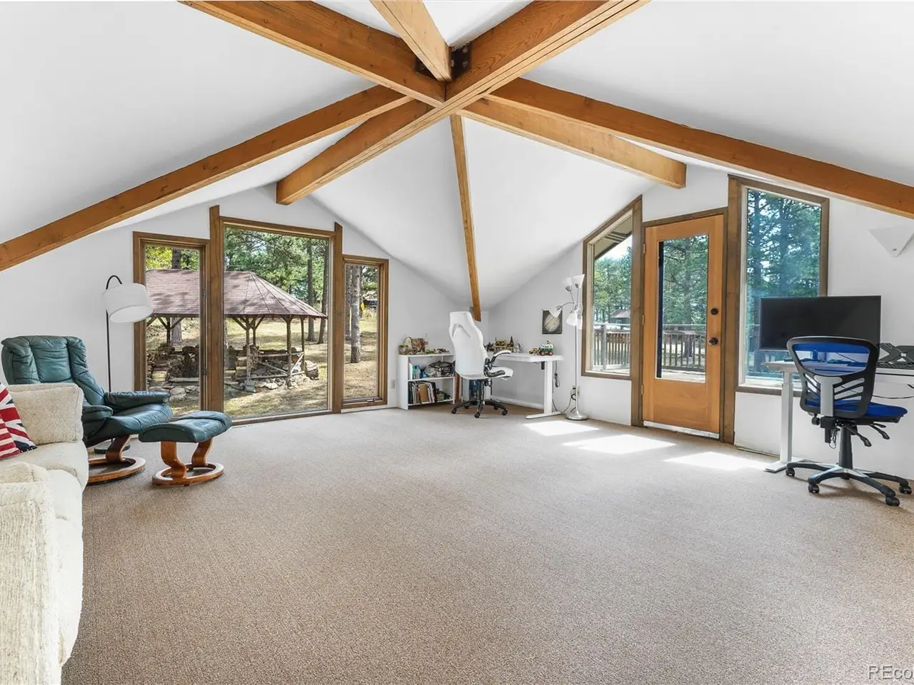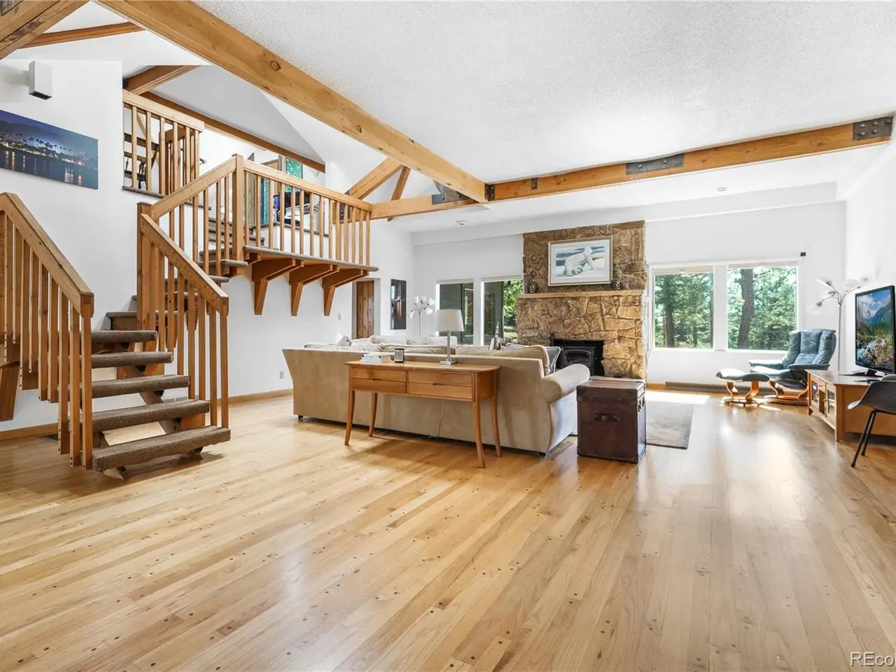 Mount Vernon Home with Mid-Century Flair! This distinctive Mount Vernon home blends mid-century modern architecture with timeless charm. The dramatic great room showcases soaring ceilings, massive wood beams with metal brackets, pegged hardwood floors, a striking stone wood-burning fireplace, and expansive windows and skylights that fill the space with natural light. The open dining area flows seamlessly into the kitchen, featuring vintage parquet flooring. The main-floor primary suite offers his-and-her closets and an en-suite bath, plus two additional main-floor bedrooms featuring large windows framing the treed setting. A vaulted flex/family room upstairs with an incredible vaulted beamed ceiling opens to a private rooftop deckideal for entertaining, working from home, or stargazing. Outdoor living is enhanced with a 1920s gazebo, a spacious front porch, patio and park like .7 acre lot. The lower level provides versatile space for hobbies, a workshop, or extra storage. A detached garage with sliding barn-style doors adds to the charm. Mount Vernon is more than just a place to liveits a way of life thats truly one-of-a-kind with vast open spaces, hiking trails, and abundant wildlife. What also sets Mount Vernon apart is its deep sense of community. As a homeowner, youre not just a resident you become part of the Metro District, a tight-knit group that works together to preserve this special place. The Mount Vernon Canyon Club is at the heart of it, where residents enjoy fine dining, a clubhouse, a pool, tennis courts, and horse facilities. Ralston Elementary is also conveniently located at the edge of the neighborhood. The HOA Fee of $496 includes a Social Membership. Additional membership packages, including aquatic, racquet, sports and community horse facilities, are available for an extra fee.