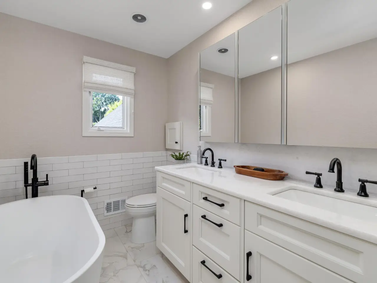 Welcome to 54 Belle Meade, not just a home but a recently renovated sanctuary looking for its new family. With 5 bedrooms, 4 and a half bathrooms, custom Milennium Kitchen and bathrooms, this tastefully designed home is key turn ready and waiting for you. On the top floor you'll find the primary suite with a large bathroom area with built in vanity, and multiple closets. A secondary bedroom also has a built in vanity with light up mirror. A third bedroom has soaring ceiling and beautiful chandelier. Down the staircase to the first floor you will find your office, guest bathroom, piano room with built in bookcases and a new bay window. From there you move across the main entry hall into the tv room that has a large built-in tv all with more bookshelves and a wet bar for entertaining. The tv room leads into the spacious and bright custom Millennium Kitchen. Here you will find high end appliances from Wolf and Subzero. The counters are Cristallo, the cooktop is induction, a double oven, and microwave is integrated into the island, with 4 freezer drawers and a pantry. Look closely and you will see a hidden coffee station with special cabinets that pop-out for storing kitchen and speciality items. There is a hidden cabinet with a tv over the oven as well. Off the kitchen is an oversized laundry room with a service door to the garage and courtyard. The laundry room has multiple closets, a laundry shoot and conveniently located full bathroom. The entrance to the basement is located in the laundry room. Here you will find a second custom kitchen, workout room with floor to ceiling mirrors, another full bathroom, flex room currently used as an art room, second laundry, with ample storage. The basement is a special place for entertaining with the ability to have a mutli-generational family live as well. Nest and C02 detectors have been installed throughout the home, as well as recessed lighting, and a Sonos sound system through the first floor, garage, and patio. In the front courtyard is a basketball net and installed flood light for night time games on the court, in the back an oversized patio for entertaining in you own secluded oasis. Back here you will also find a permanently affixed grill connected to the home's gas line. This stunner is not to be missed.