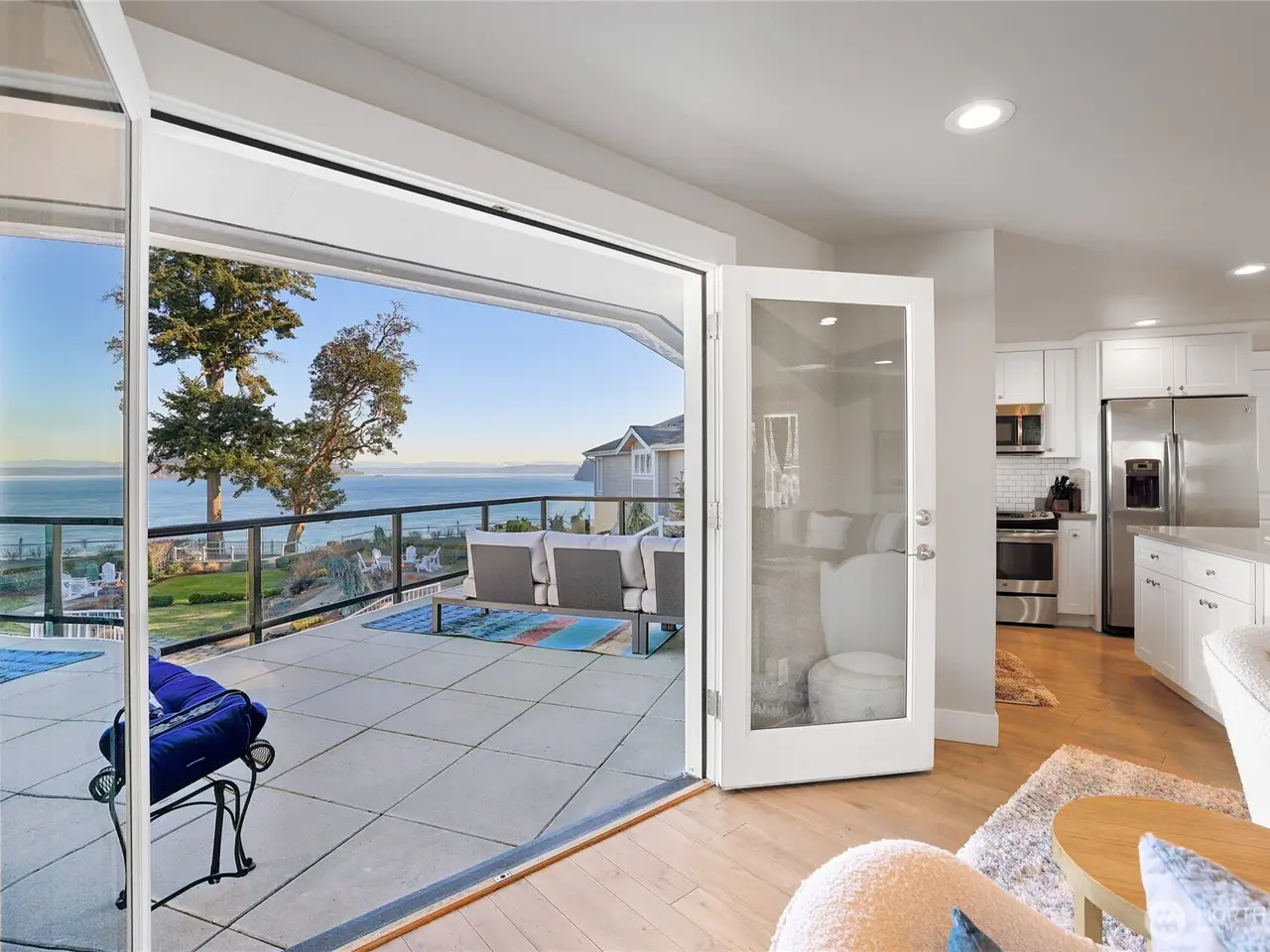 French doors opening to water views