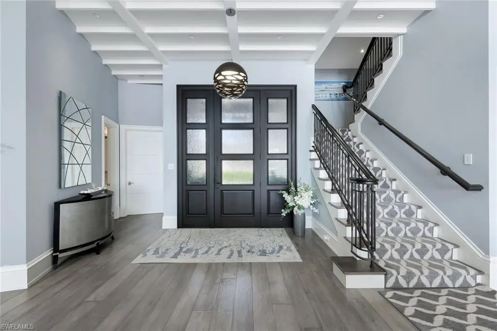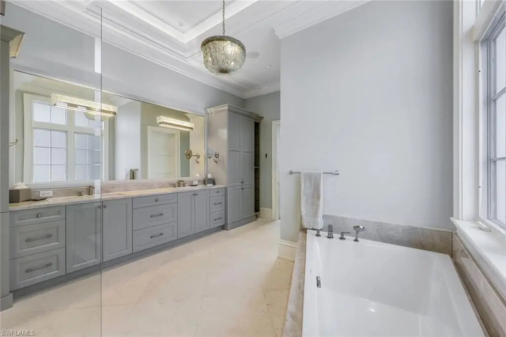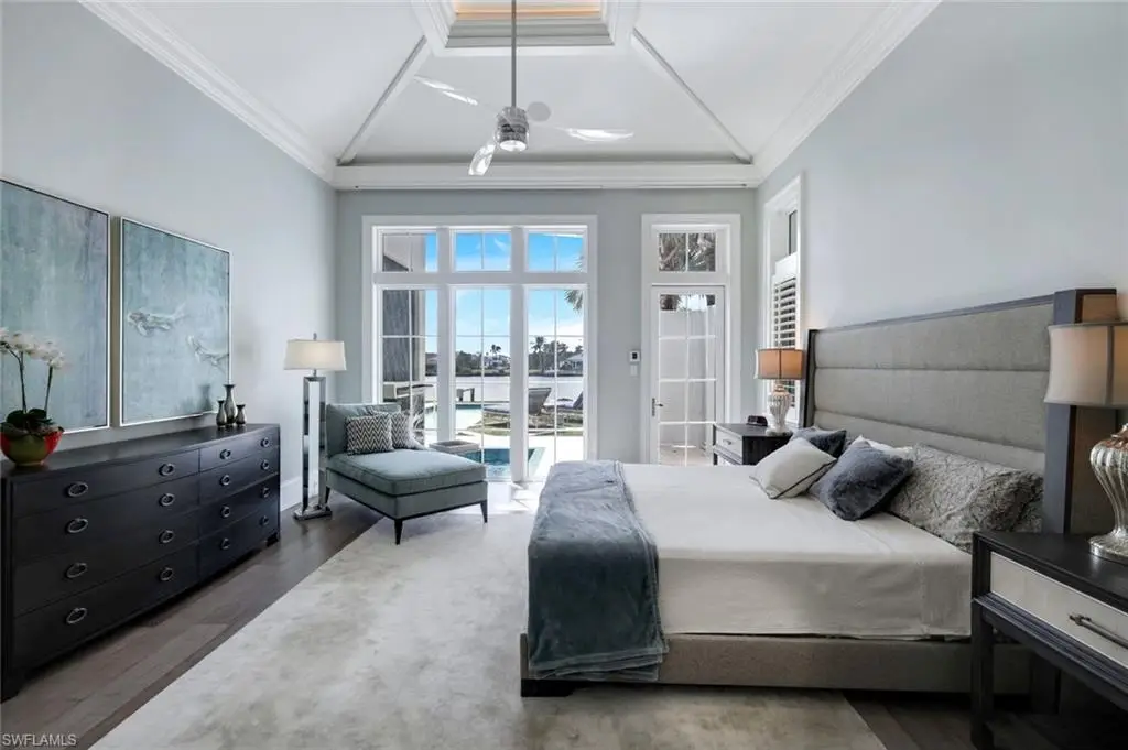 Live in casual elegance in this beautiful custom bay front home in The Moorings, timelessly designed by Harrell & Company Architects on just under a private + acre premier southern exposure lot. This private oasis has been professionally decorated with a coastal flair. Watch the dolphins and eagles on Hurricane Harbor from the great room's floor to ceiling windows with zero corner sliding doors for seamless indoor-outdoor living and entertaining. Upgrades galorea soaring back lit quartz accent wall, cathedral ceilings with beautiful mill work; each ceiling a masterpiece, an indoor/outdoor bar, perfect for entertaining. There is a private elevator, Lutron lighting, two laundry rooms, two powder rooms and three car garages. The kitchen will delight your inner chef with professional grade appliances, gas six burner range, two dishwashers, walk in pantry and Miele built-in coffee machine. The first-floor master suite features a large walk-in closet with a dressing area and laundry room, private outdoor shower and a lovely view of the bay and the spa with waterfall. The study doubles as a guest bedroom, two queen-size Murphy beds, the second-floor hosts 2 additional bedrooms and baths, wet bar, family room loft and bayfront deck with a firepit. Overlooking the pool and bay you will find the cabana with bedroom and bath. The travertine lanai features a covered dining and living areas with wet bar, TV, grilling area, retractable screens, and shutters. The sparkling pool and spa are located on the terraced lawn featuring a firepit, several seating areas leading to the bay front deck with boat and jet ski lifts. Built in 2016 using the highest quality materials by D. Garrett Construction at a high elevation, this home has never been damaged by hurricane or storm surge. For your peace of mind there is a security system with cameras, high impact glass windows & doors, all at a high and dry elevation. This house is a true showplace. The Moorings is conveniently located west of 41 in the City of Naples and features a private residence Beach Club. Two miles from 5th Avenue and all that Naples has to offer. Location, Luxury and Beauty!