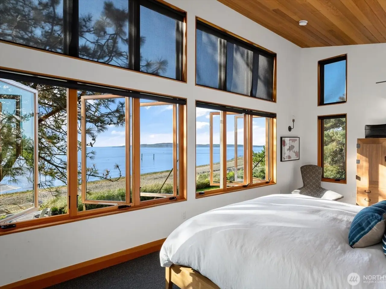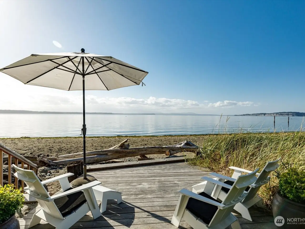 Discover unparalleled luxury and privacy on 100' of pristine no-bank Whidbey waterfront, with sweeping views of the Olympics, shipping lanes, and stunning sunsets. Nestled beside 25 acres of Trust Land and beach, this custom home was fully rebuilt in 2016, blending high-end finishes with seamless indoor-outdoor living. Accordion doors flood the home with natural light, while a waterside primary suite, main-floor guest room, and two bonus rooms offer space for entertaining. Includes a stylish guest house with sleeping loft, attached 1 car garage and ample driveway parking.