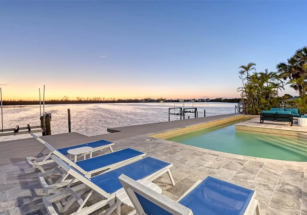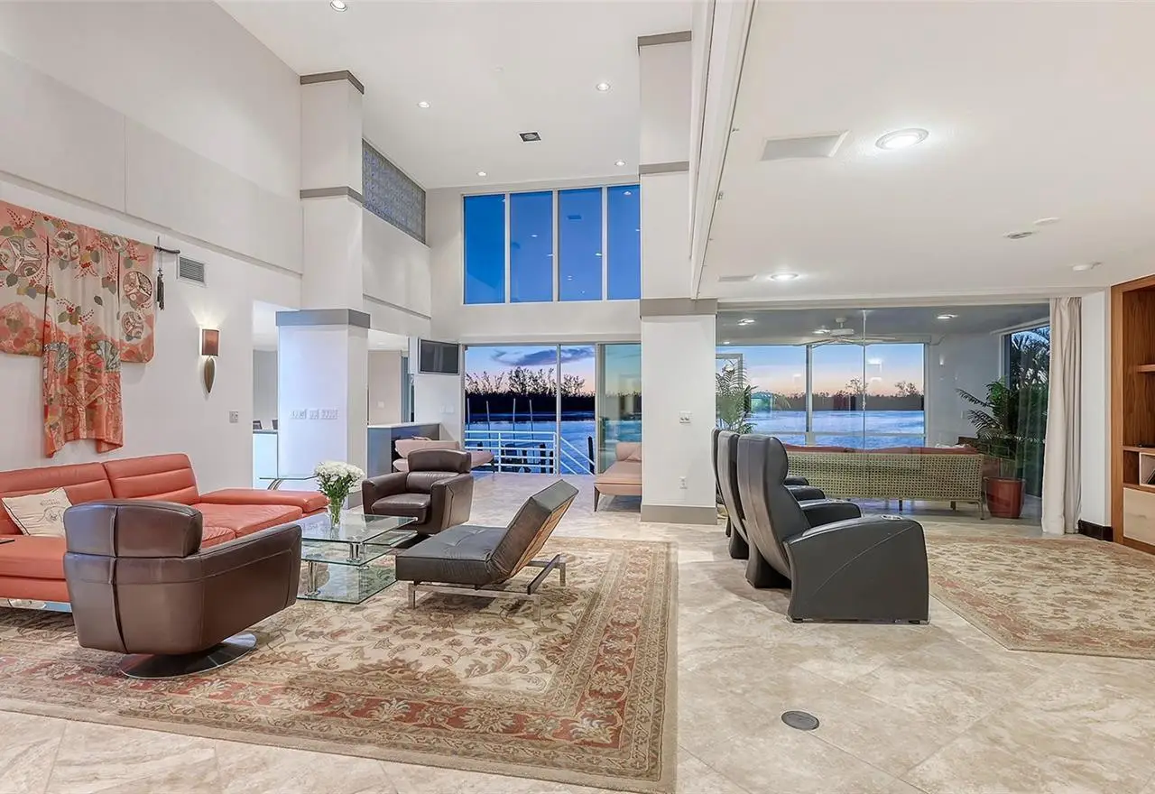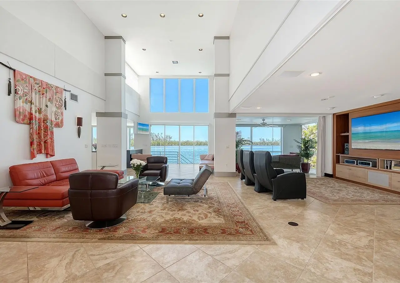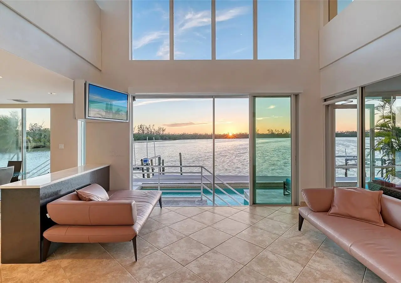 Owner has priced to sell this one-of-a-kind modern masterpiece, ideally positioned on premier boating water with sweeping, unobstructed views of the Bay and Gulf of Mexico. This exceptional residence offers a rare blend of architectural elegance and coastal sophistication, all within walking distance to the fine dining, boutiques, and cultural charm of St. Armands Circle. Floor-to-ceiling windows and soaring ceilings flood the home with natural light, while framing the mesmerizing water vistas from nearly every room. Designed for the discerning buyer, the gourmet kitchen features top-of-the-line Thermador appliances, including a newer refrigerator, wine cooler, and a professional-grade 6-burner gas range. The expansive floor plan includes four bedrooms and four bathrooms, highlighted by a serene upstairs primary suite with a private enclosed sunroom - currently serving as a tranquil home office. Meticulously maintained, the home boasts a brand-new roof (2024), a recently replaced seawall (2017), and dual-zoned Rheem AC systems. Additional features include electric hurricane shutters on most major windows, a whole-home speaker system, and lush, mature landscaping complemented by a secure gated entrance that enhances both privacy and curb appeal. The rooftop terrace offers a breathtaking vantage point for sunset views over the Gulf, completing this unparalleled offering. A true sanctuary for those seeking refined waterfront living.