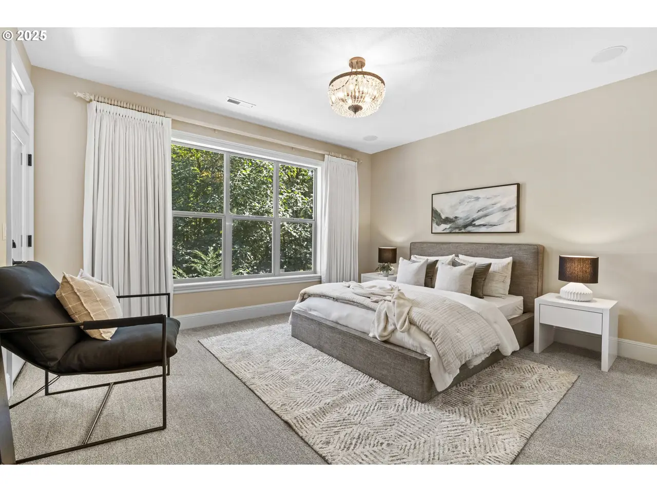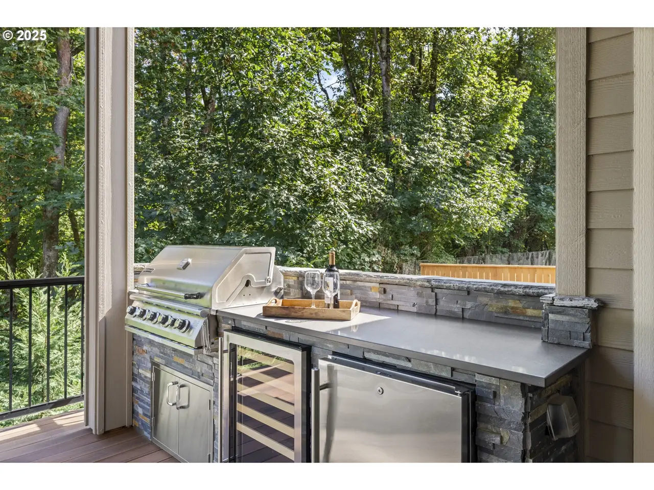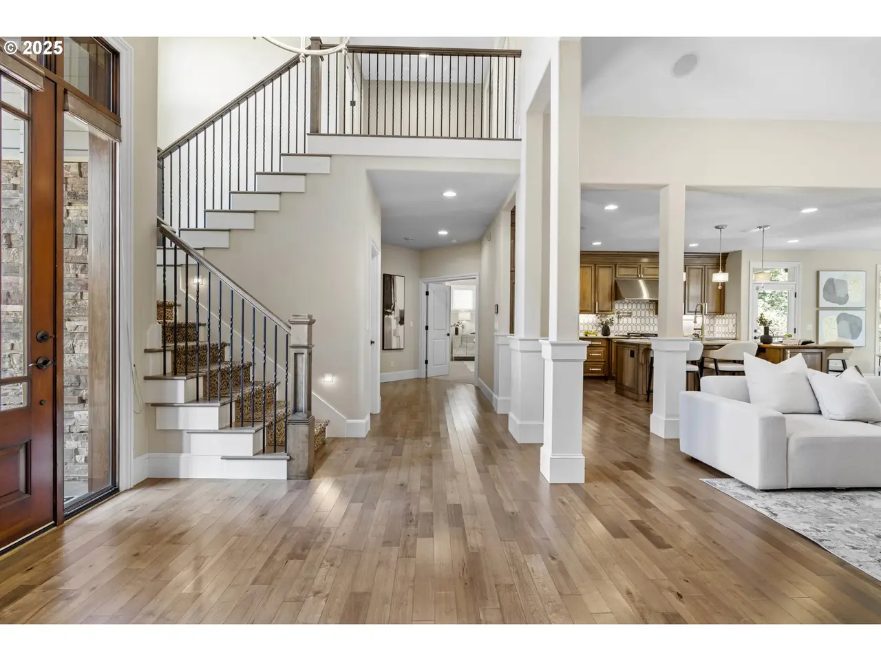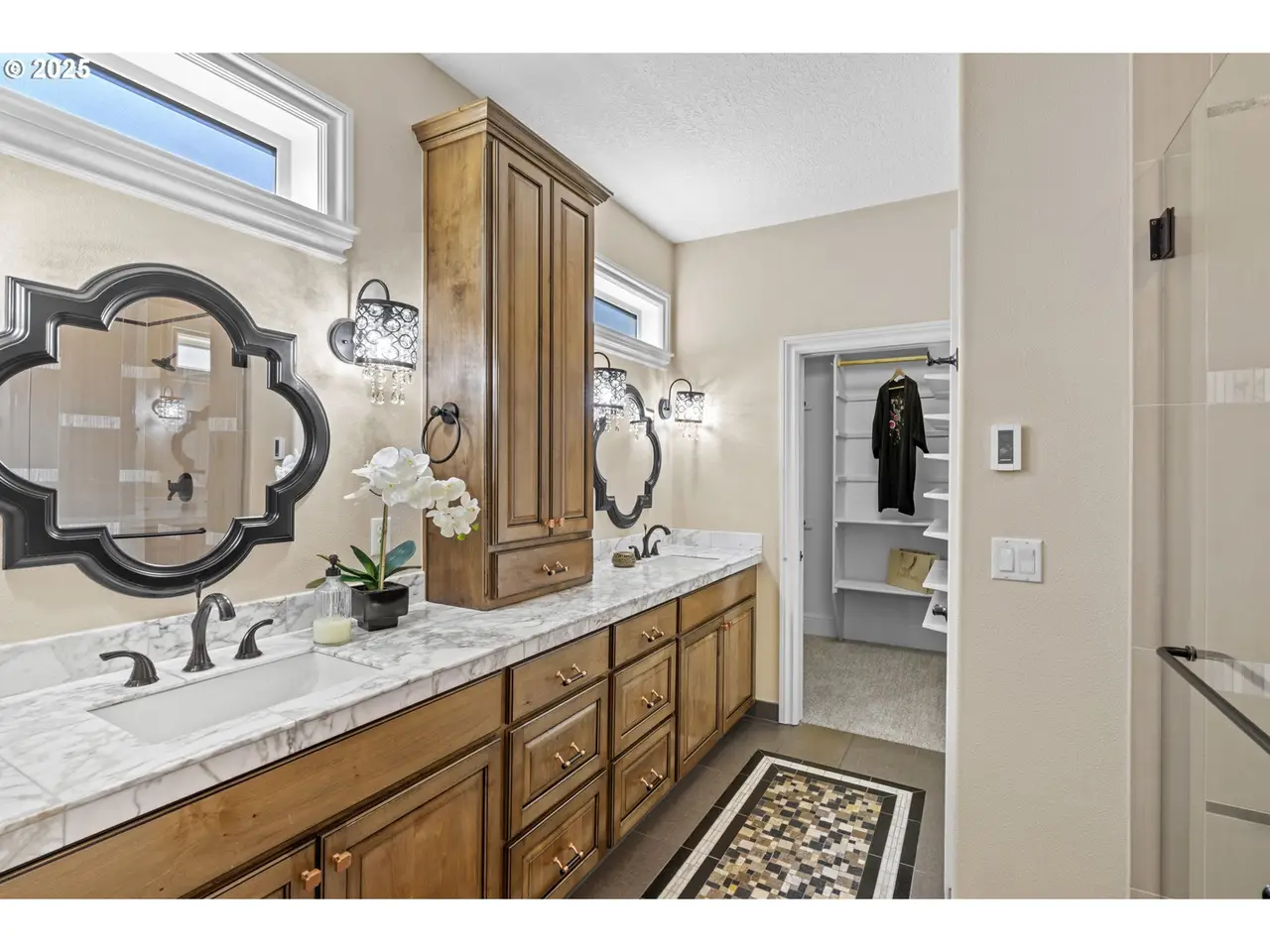 Nestled on a quiet cul-de-sac and backing to a peaceful, tree-lined greenbelt, this exceptional home offers 3,135 square feet of refined living on nearly half an acre. The home is the proud Clark County Parade of Homes recipient of "Best in Show," "Best Livable Floor Plan," and "Best Landscaping." The expansive open-concept great room is anchored by vaulted ceilings, a dramatic floor-to-ceiling tiled fireplace, and custom built-ins, with massive windows that flood the space with natural light. A state-of-the-art Control4 system offers fully integrated smart home technology, including lighting, climate, audio, security, and intercom controls. The designer kitchen features a quartz and butcher block island, Italian Dolomite marble backsplash, glass cabinet handles, premium Dacor appliances, over-range pot filler, LED under-cabinet lighting and dual pantries. The adjoining dining area flows seamlessly to the outdoor living space, making entertaining effortless year-round. Two main-level ensuite bedrooms offer spa-inspired bathrooms with zero-entry showers, marble countertops, radiant heated floors, and direct access to the outdoors. Upstairs, you'll find a third bedroom, full bath with skylight, and a vaulted-ceiling fourth bedroom or bonus room/flex space. The dedicated office features custom built-in desks and cabinetry. Out back is a wraparound deck and a vaulted covered outdoor kitchen complete with built-in BBQ, beverage fridge, wine cooler, gas space heater, ceiling speakers, and TV hookup--ideal for outdoor gatherings. The professionally landscaped yard is illuminated with programmable LED lighting. Additional features include hot/cold water hookup in garage, central vacuum system, tankless H20 heater, and triple-pane windows. Blending timeless craftsmanship with 21st-century modern luxury, here is your rare opportunity to own one of Felida's finest homes.