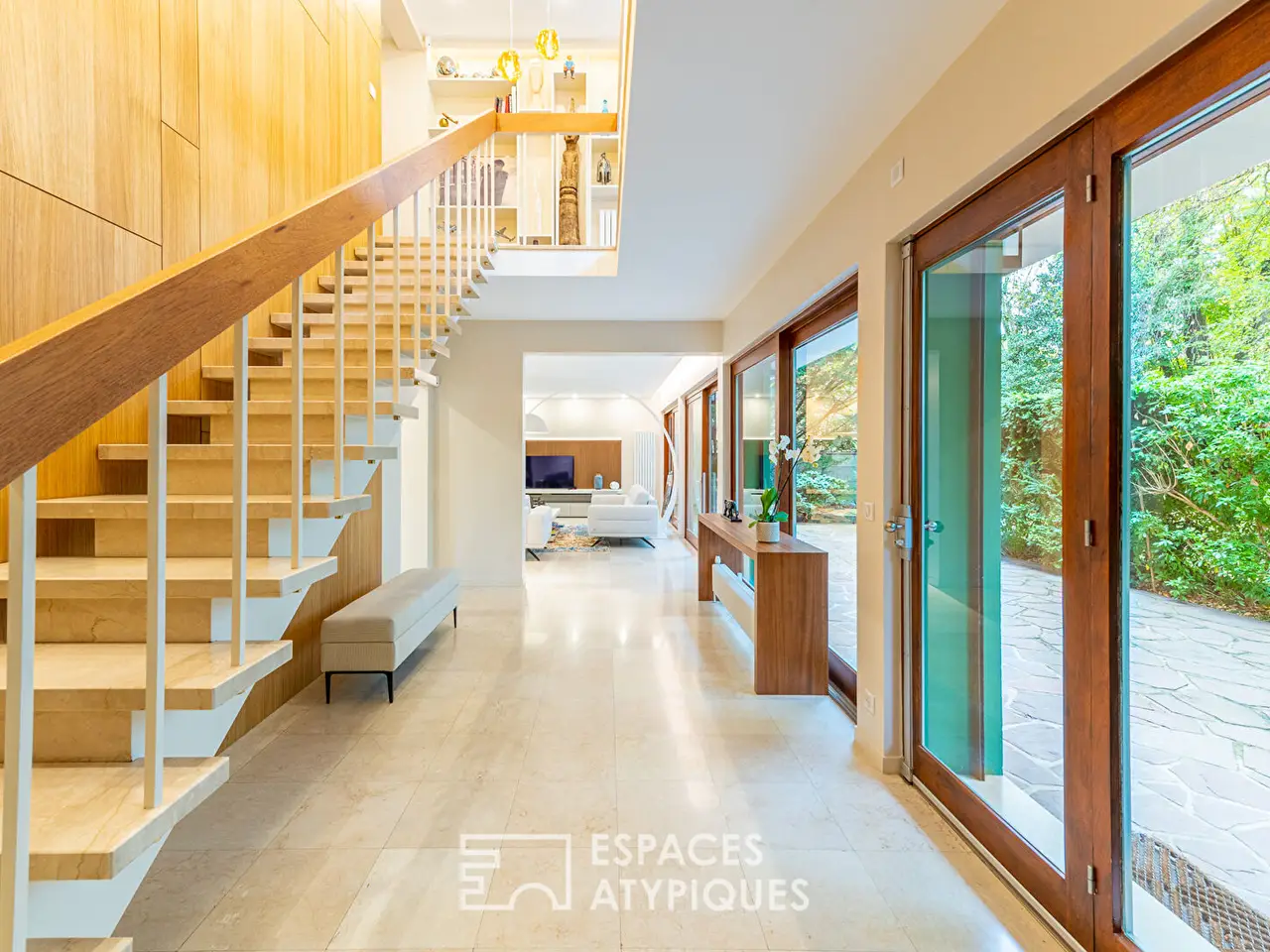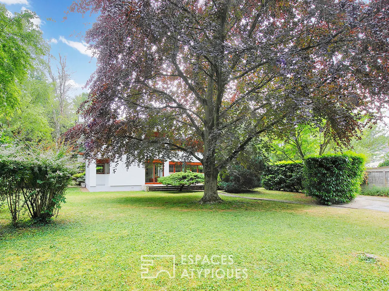 Maison d'architecte seventies renovee avec parc Exclusive In the heart of Chelles, this magnificent architect-designed house was built in 1965 and benefited from a high-end renovation in 2021. It offers an area of 225m2 on two levels nestled out of sight and quiet on a plot of 1700m2. Organized on two levels, the ground floor distributes the living rooms. From the entrance the tone is set, a magnificent wall covering in oiled solid oak allows you to appreciate the high ceilings. On one side the entrance leads to the living room, benefiting from a double exposure as well as a breathtaking view of nature. The living room revolves around a custom-designed fireplace with its double face allowing you to enjoy it on the living room and dining room side. In the extension, a magnificent top-of-the-range fully fitted and equipped kitchen faces the dining room and has access to a first large terrace at the back of the house. A boiler room, a cloakroom, a laundry room and a bathroom complete the ground floor. A beautiful natural stone staircase gives access to the first floor and gives rise to a beautiful landing with its custom-made library. The entire floor is parqueted with solid exotic wood and has a magnetic door. On one side are the master suite with its bedroom enjoying access to a beautiful terrace, its tailor-made dressing room and a magnificent marble bathroom. On the other side, there are three beautiful bedrooms with storage and tailor-made dressing room sharing a bathroom. An office that can be used as an extra bedroom completes the floor. A motorized double garage completes the whole property. Its high-end materials, its location and its park make it a rare and atypical property in the sector. Close to shops, schools and transport. Greater Paris in the immediate vicinity. ECD in progress REF. SM1002 Additional information * 9 rooms * 4 bedrooms * 2 shower rooms * 1 floor in the building * Outdoor space : 1700 SQM * Parking : 2 parking spaces * Property tax : 3 600 €