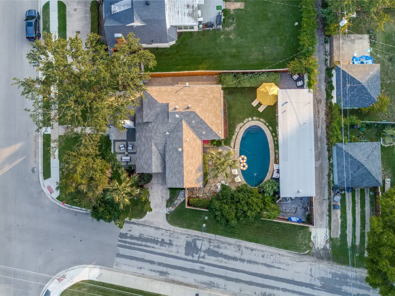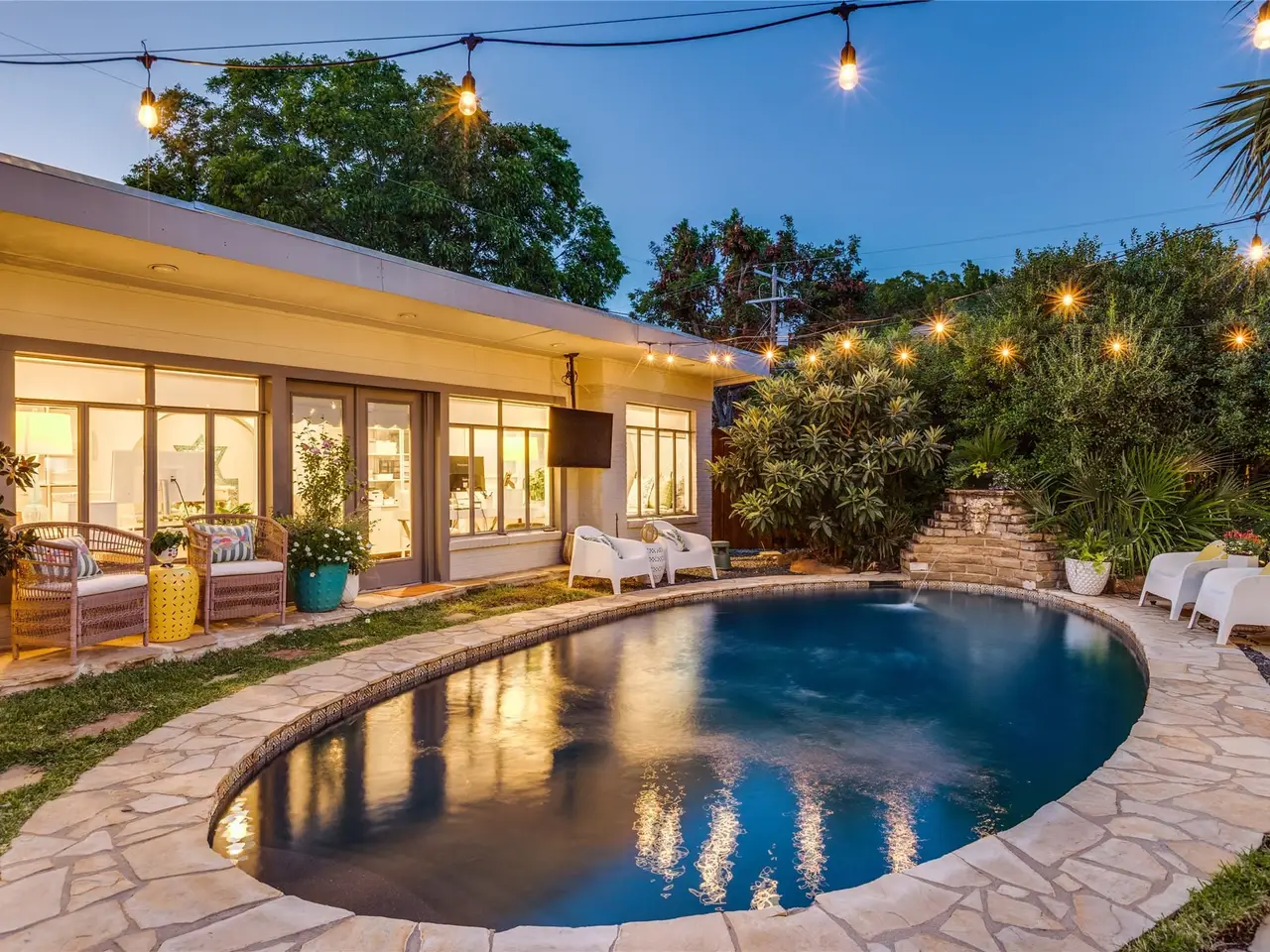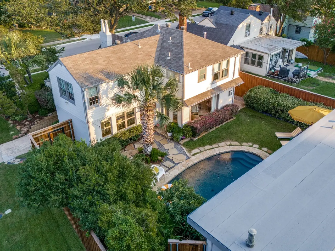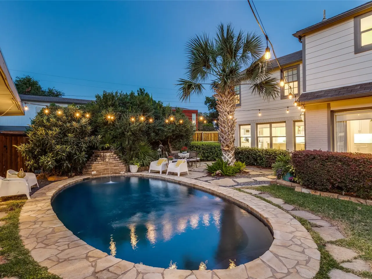 This Tudor home is a rare Charles Dilbeck design, reimagined in 2018 to embrace modern living while preserving its architectural soul. From the moment you arrive, the professionally landscaped gardens and gated stone patio set a tone of privacy and warmth, inviting you inside. Through the whimsical stained-glass front door, the formal living room unfolds like a page from a storybook. A soaring vaulted ceiling with exposed beams frames the space, where hardwood floors gleam through a breathtaking 1956 floor-to-ceiling stained-glass window. A marble fireplace anchors the room, offering both elegance and comfort. The heart of the home is the open family room and chef’s kitchen spaces designed for gathering and entertaining. Here, the views stretch to the backyard oasis. The kitchen itself is a culinary dream: Calcutta white marble countertops and a waterfall island with seating for six, professional-grade Bertazzoni appliances, custom cabinetry, a built-in Fisher & Paykel refrigerator, and thoughtful details like a walk-in pantry, coffee bar, and solar shades. Beyond the French doors, the outdoors beckon. A sparkling pool crowned with a Poseidon water fountain, surrounded by flagstone walkways and patio, a full bath cabana, and lush landscaping. Upstairs, the primary suite is a sanctuary of its own. Vaulted ceiling and recessed lighting create a sense of serenity, while dual walk-in closets with custom built-ins offer convenience. The spa-inspired bath feels indulgent with soft blue cabinetry, double vanities topped in white marble, a soaking tub, and a walk-in shower. Two additional bedrooms, a full bath, a laundry room, and a versatile office or third living space complete the upper level, offering room to grow, work, and retreat. Centrally located, this home places you just moments from Dallass most beloved amenities - acclaimed restaurants, vibrant nightlife, serene parks, and the Katy Trail. This residence is ready to welcome its next chapter of memories!