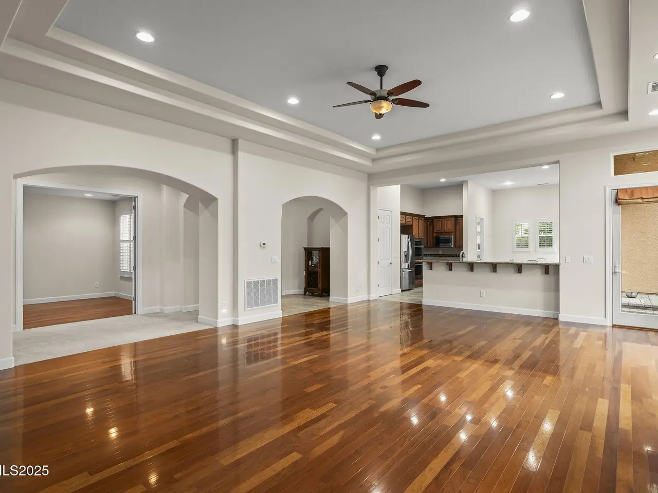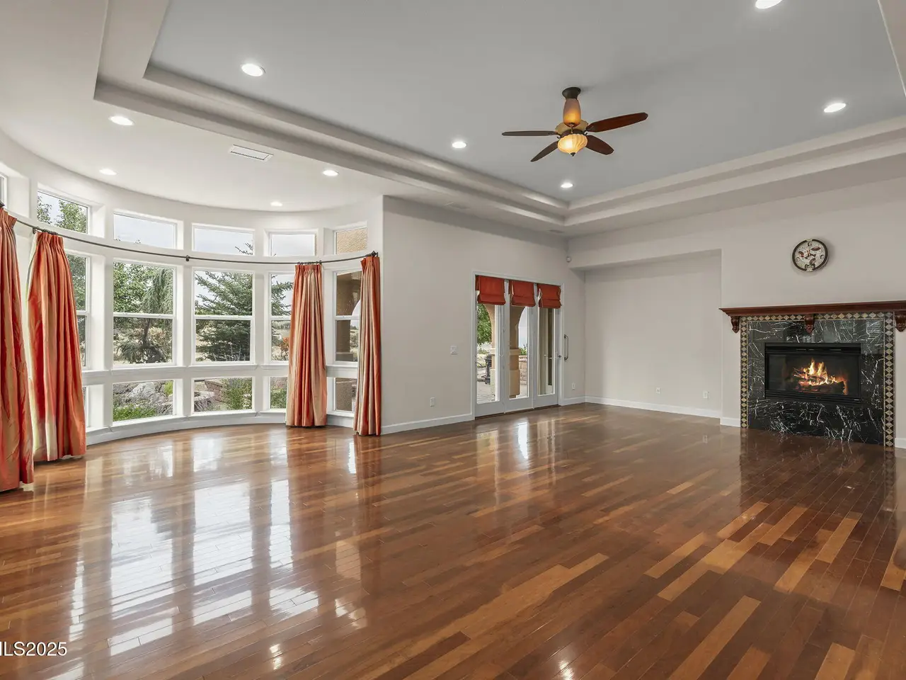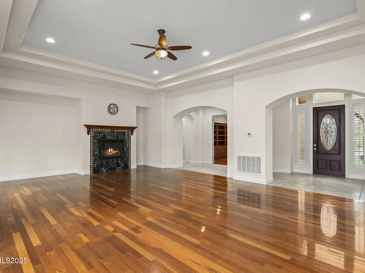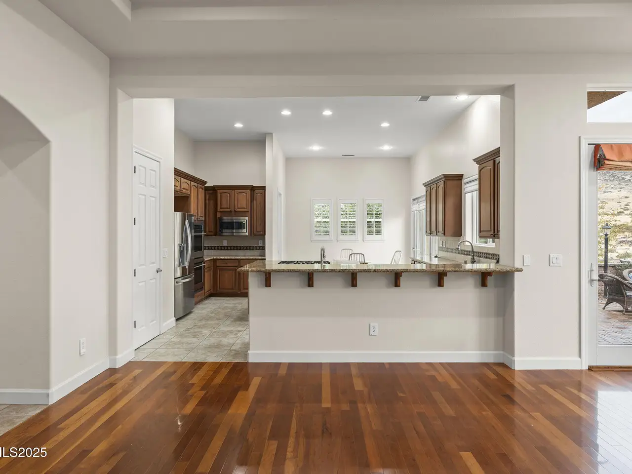 Welcome to this spacious and meticulously cared-for two-story residence located in the highly sought-after, guard-gated community of Arrowcreek. Nestled in the hills of South Reno, this home offers sweeping views of the city skyline, open valleys, and majestic mountains—perfectly framed by large, elegant windows and soaring ceilings on the interior of the home. Inside, you'll find timeless hardwood flooring throughout and a traditional yet open floorplan that offers both comfort and sophistication. The kitchen offers plenty of space for cooking and entertaining with a large peninsula overlooking the living room, kitchen island with a 5-burner gas cooktop and extra space for seating. Dual ovens, spacious pantry and a dining nook accompany the well-designed space. The grand master suite is a serene retreat, complete with a charming bay window, dual walk-in closets, a spa-like soaking tub, and a frameless tile shower. The backyard is perfectly manicured with an expansive paver patio, partial covering, built-in fireplace, gas BBQ stub and multiple well designed gathering spots perfect for a table, lounge chairs or hot tub. With the fountain running in warmer seasons and the beautiful views it's a very relaxing environment to enjoy your spare time in. Enjoy world-class HOA amenities including 24-hour security, resort-style pool and hot tub, tennis courts, a full clubhouse, fine dining options, scenic walking and golf cart trails, and more. Golf memberships are also available through the renowned Arrowcreek Golf Club (not included in HOA).