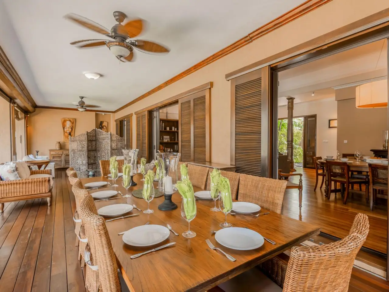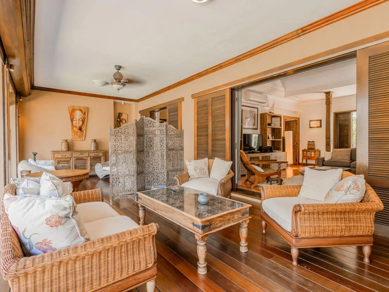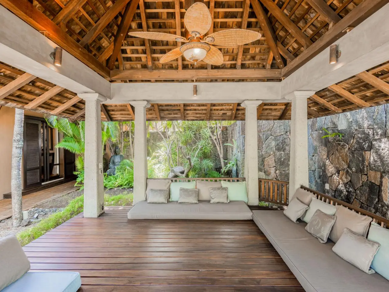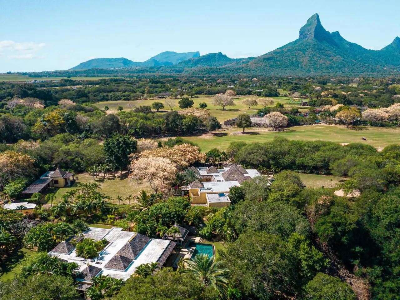 Hidden beneath a lush tree canopy near the Tamarin River, this elegant 5 bedroom villa offers timeless charm in one of Mauritius’ most desirable coastal enclaves. Combining natural textures with a sophisticated, tropical aesthetic, the home stretches across 378 m² of interior space and sits on over 3,200 m² of fully owned land in a peaceful, gated residential estate. The living and dining areas flow seamlessly into a wide veranda that overlooks a serene private pool, bordered by manicured lawns and mature palms. High timber ceilings and rich wood finishes lend a warmth to the home’s character, while modern comforts such as air conditioning in all rooms, a fully equipped kitchen and laundry area ensure effortless living. Five spacious bedrooms, including a master suite with garden views, are paired with generous storage and multiple indoor-outdoor living zones. The villa also includes two garages, five secure parking spots and a golf cart bay, ideal for navigating the nearby fairways. Perfectly suited for international buyers, this luxury property in Tamarin grants eligibility for permanent residency upon purchase. Whether you're seeking a full-time residence or a high-end investment in Mauritius, this property offers both sanctuary and prestige. Contact DIANE WATKINS, Property Consult for a private viewing!