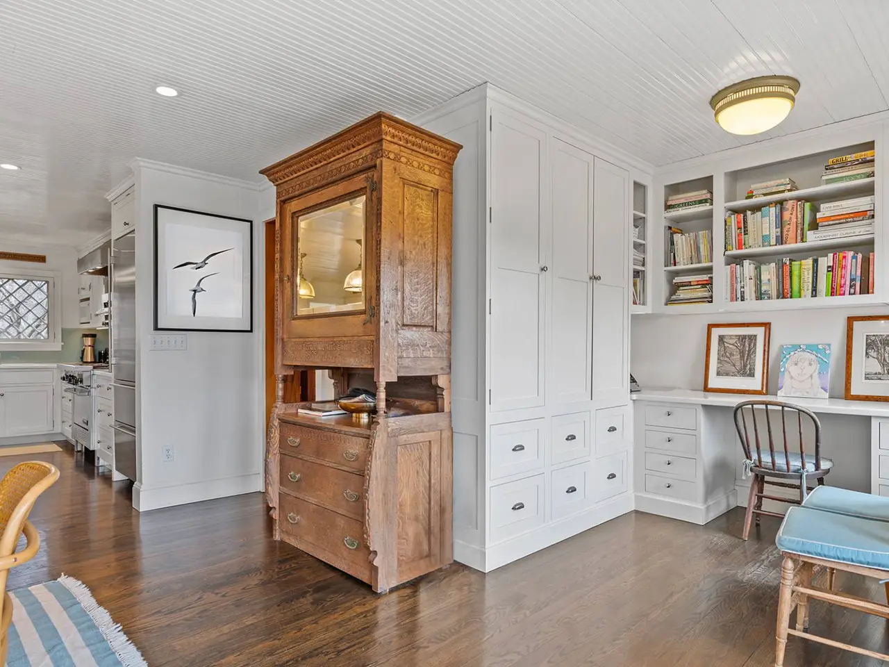 Nestled in the heart of Water Mill South, this historic luxury estate is a rare opportunity to own a masterpiece of Shingle Style architecture. Renovated in 2007 and conceived and built in 1884 by Henry Turbell Rose, Rosemary Lodge stands as a testament to exceptional craftsmanship and enduring elegance. Just minutes from the ocean, 0.93-acre grounds featuring a 4,110-square-foot residence, pool house, and a pool. This beautifully designed home boasts 5 bedrooms, 4 bathrooms, and 1 half bathroom. Impeccably preserved, the home retains its museum-quality original paneling, hand-carved woodwork, stained glass windows, and intricate moldings. Each of the five bedrooms was individually crafted. The central living hall, paneled in ash, sets the tone for this architectural gem, while four working fireplaces feature hand-carved mantels, hidden cupboards, hand-painted designs, and custom tile inserts. Throughout the home, delicate floral motifs, ships, butterflies, and birds are carefully etched into the wood, along with the initials 'RL,' a homage to its storied past. The grand master suite is a private sanctuary, complete with a spa-like ensuite bath, a spacious walk-in closet, and a romantic terrace overlooking serene Hamptons farmland. A second-floor media room with a big-screen TV and fireplace offers the perfect retreat for gatherings. Designed for elegant entertaining, the chef's eat-in kitchen features a massive center island, professional gas stove with broiler, and seamless access to the outdoor lounge and dining area. Outside, a meticulously maintained rose garden greets visitors at the entrance, while the lush backyard oasis boasts a heated pool, pool house with a full bath and outdoor shower, and an alfresco cooking station with a large refrigerator and vegetable garden. Additional modern amenities include a state-of-the-art darkroom for film and photographic development, a dedicated exercise and bicycle shed, ample storage, and a newly installed electric vehicle charging station. Recognized in Houses of the Hamptons, Rosemary Lodge is listed on both the State and National Register of Historic Places for its exceptional integrity and preservation. This architectural treasure offers the rare chance to own a piece of Hamptons history, blending timeless elegance with modern luxury.