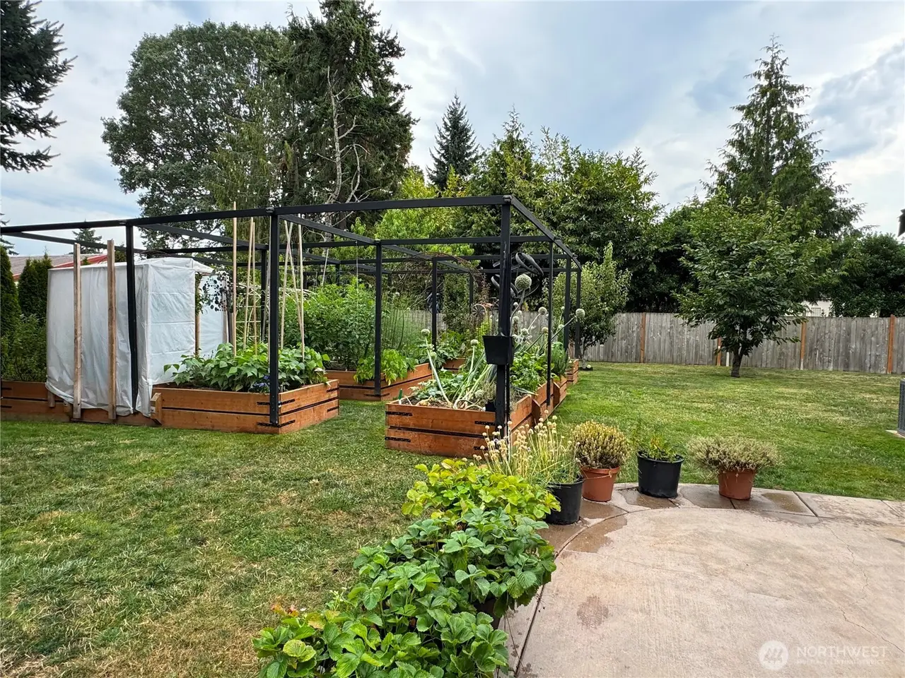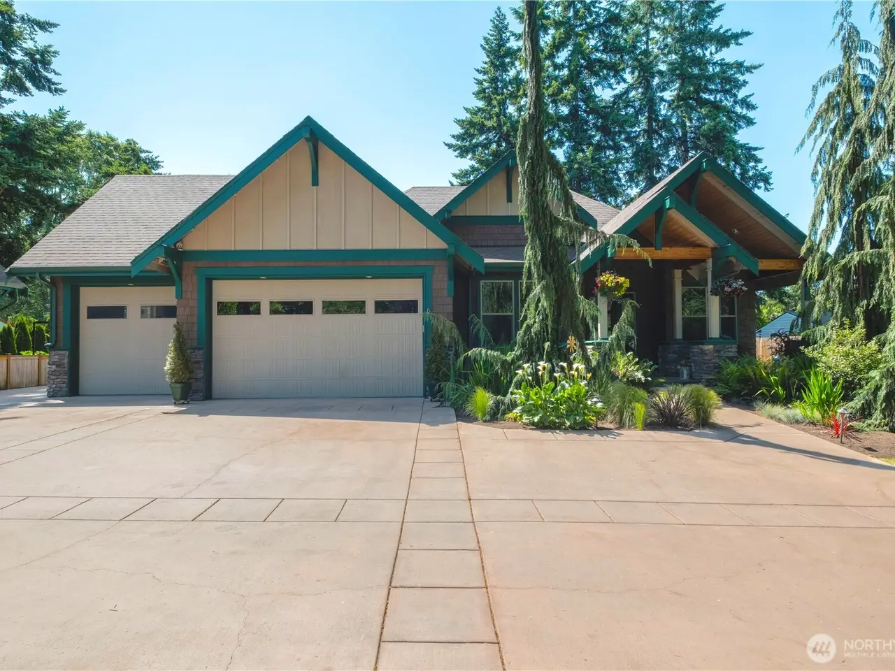 Don't miss this private lodge style sanctuary! The flat almost 1/2-acre lot with private drive & gated entry boasts a one-story 2014 custom-built home that is a car collector's dream! It has an oversized 3-car attached garage + 4-car detached shop w/1/2 bath & 10' doors for your RV/boat. The home has a grand covered entry that leads to sizable foyer w/adjacent office, vaulted ceilings & an open great room w/gas fireplace, dining area, & cook's kitchen. The luxurious primary suite features a spa-style bath. Step outside to the 422+ SF covered patio w/fireplace, built-in BBQ & TV wiring. Fenced yard w/fruit trees and a garden of raised beds- your urban farm to table awaits! Mature landscaping throughout. Sewer connected. Minutes from I-5 and 509.