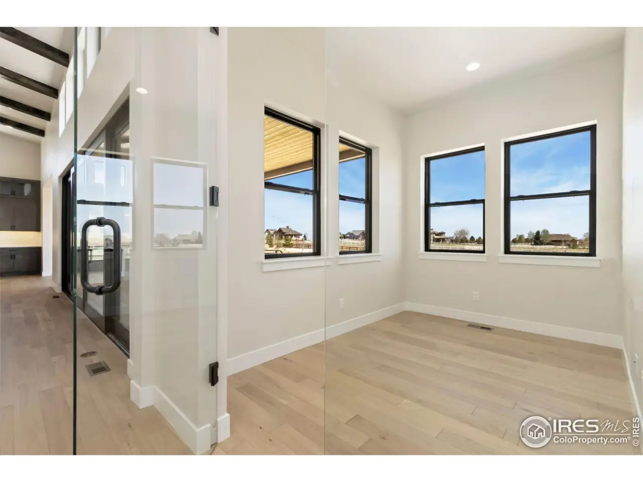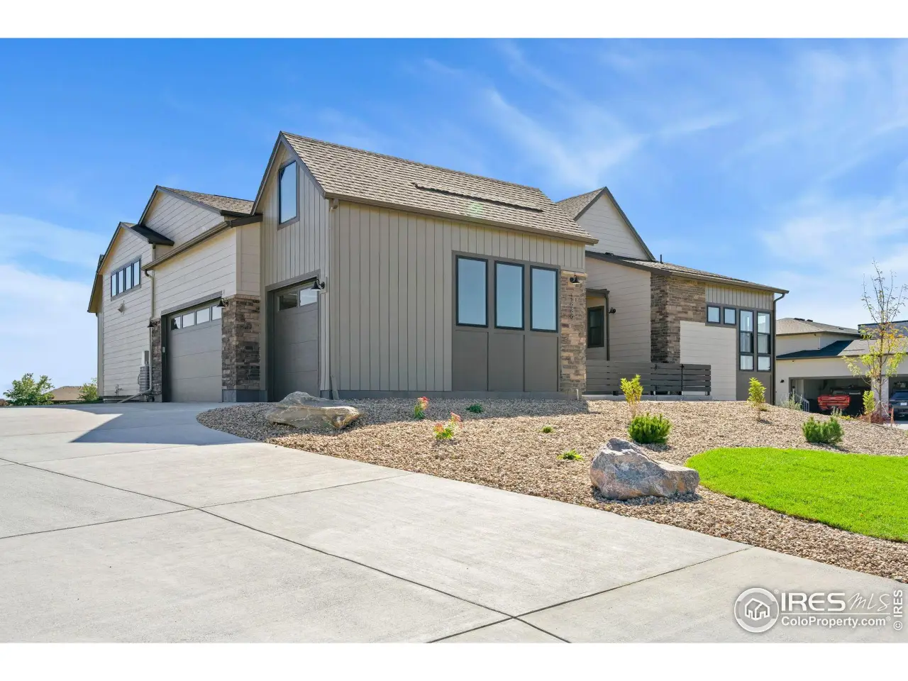 One of the last Alexandra's at Acadia in RainDance by Trumark Homes; a stunning, single-story home offering 4,710 finished sq.ft. with 4 bedrooms and 4.5 baths. Spacious great room with stained ceiling beams and contemporary fireplace with tile detail to the vaulted ceiling. The gourmet kitchen, featuring a walk-in pantry and an oversized center island, perfect for entertaining. The open kitchen includes dusk-stained shaker style with glass stacked cabinetry, Calacatta Classique quartz countertops with subway tile backsplash, Monogram/Electrolux stainless steel appliance package, and decorative matte black fixtures. A center-meet sliding glass door connects the light-filled dining room and great room to the covered outdoor east facing deck which features cedar tongue & groove ceiling detail. A dedicated office with a glass wall and door overlooks the covered deck. The primary suite features ample windows, a luxurious bathroom, walk-in shower, and an elegant freestanding tub. An oversized walk-in closet completes the primary suite. On the other side of the home, you'll find a large laundry, flex room, and two secondary bedrooms, both with ensuite bathrooms. Finished basement includes a rec room with wet bar, a fourth bedroom and full bath. The home comes with extensive 5" plank natural stained engineered wood flooring throughout the majority of the main floor, black interior windows, hand trowel drywall finish, luxurious carpet in bedrooms, spacious 10-foot ceilings throughout the main level and basement, eight-foot interior doors, 3-car side-load garage with insulated steel doors, tankless water heater, AC, and more. Beautiful 1-acre home site close to neighborhood park & RainDance National Golf Club. Optional Raindance pool amenity. Don't miss your chance to live at this remarkable master-planned community in Windsor, CO!