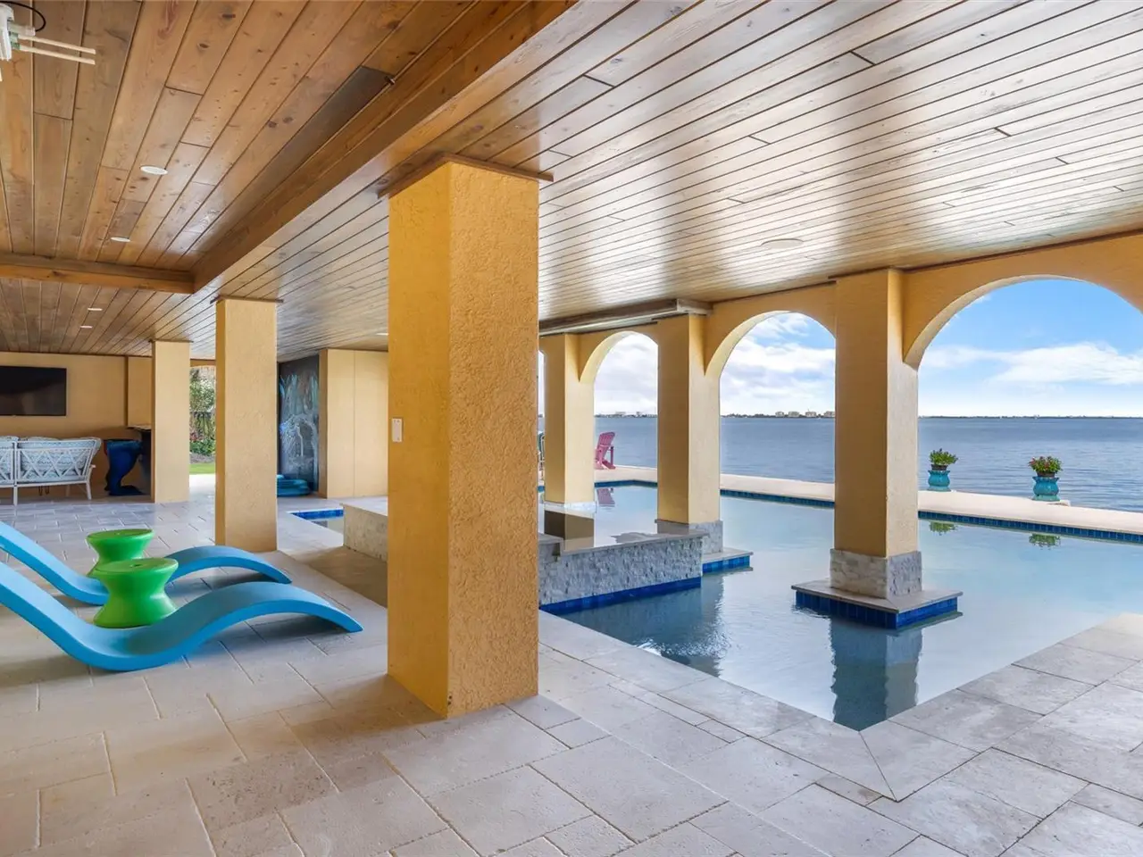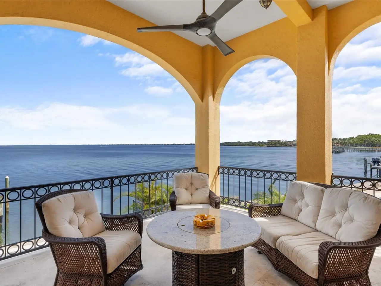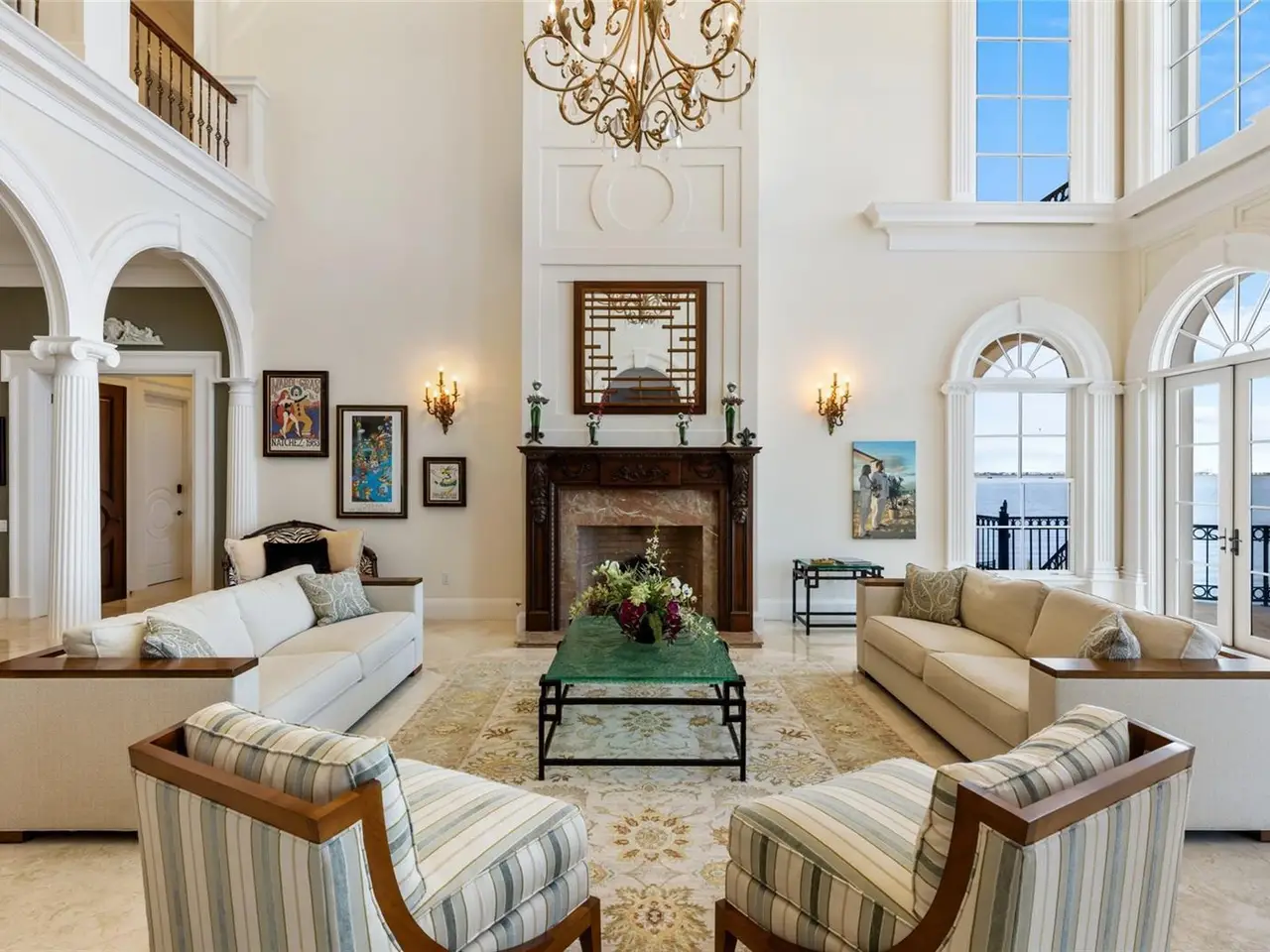 The very best value for open bayfront living near downtown Sarasota. Experience sweeping 270-degree views of Sarasota Bay from this stunning waterfront property. Perfectly positioned to capture iconic vistas of CadZan, the former estate of John Ringling, plus the coastline of Longboat Key and spectacular sunsets. This 7, 000 sq. ft. residence offers exceptional privacy and direct access to deep sailboat water. With a 17 foot elevation, this incredible home has many quality features that you must see to appreciate. Located in Ringling Point, a private cul-de-sac of just 11 homes within the sought-after community of Sapphire Shores, this property is minutes from downtown Sarasota, yet feels worlds away. The home features 5 bedrooms, 3 full bathrooms and 2 half baths, multiple living areas, an elevator serving all floors, and a flexible layout ideal for families, entertaining, or multi-generational living. The main living level includes a formal living room with soaring 24-foot ceilings. Walls of windows fill the space with natural light and frame breathtaking views from every angle. A gas and wood-burning fireplace adds warmth and character, while a full-service bar with a tap dispenser, beverage coolers, and custom cabinetry is perfect for entertaining. The chefs kitchen is outfitted with custom wood cabinetry, granite countertops, dual Dacor gas ranges with stainless hoods, Sub-Zero refrigeration, double ovens, warming drawers, and two dishwashers. A spacious island with seating provides ample space for casual dining or large gatherings. An expansive terrace overlooking the bay runs the width of the main level and is accessible from the living room, bar area, family room off of the kitchen and the guest bedroom. The owner's retreat spans the entire second-floor right wing and features a private sitting area with fireplace, a full-length terrace overlooking the bay, an oversize dressing room with double walk-through closets, and a spa-style bath with a walk-in rain shower and pedestal tub. Just outside the suite is a temperature-controlled wine room. There are two large guest bedrooms on the left wing. Additional features include a 4-car garage, recording studio, hobby and flex rooms, and abundant storage throughout. The home also includes a clay tile roof (2019) and cement block construction built on pilings. Outdoor living is equally impressive. The newer lagoon-style pool features a grotto lounge shelf and gas-heated spa, surrounded by expansive covered terraces with tongue-and-groove ceilings and multiple seating areas to enjoy spectacular sunsets. The private dock extends into the bay, offering deep water access ideal for sailboats and larger vessels, with no fixed bridges to the Gulf. This prime location offers convenient access to downtown Sarasota, Gulf beaches, the Ringling Museum, IMG Academy, University Town Center, and Sarasota-Bradenton International Airport. A rare opportunity to own a legacy estate with unmatched views, quality, and location in one of Sarasota's most desirable bayfront communities.