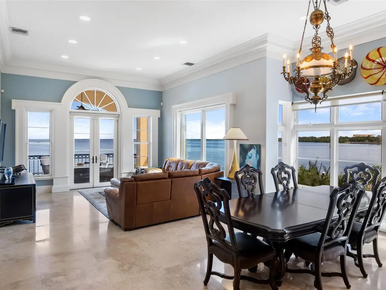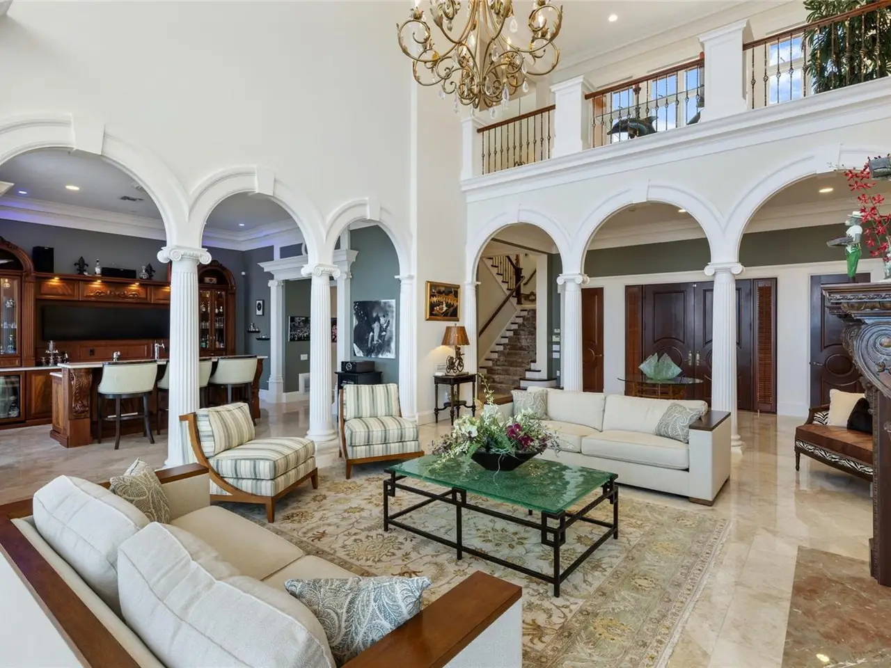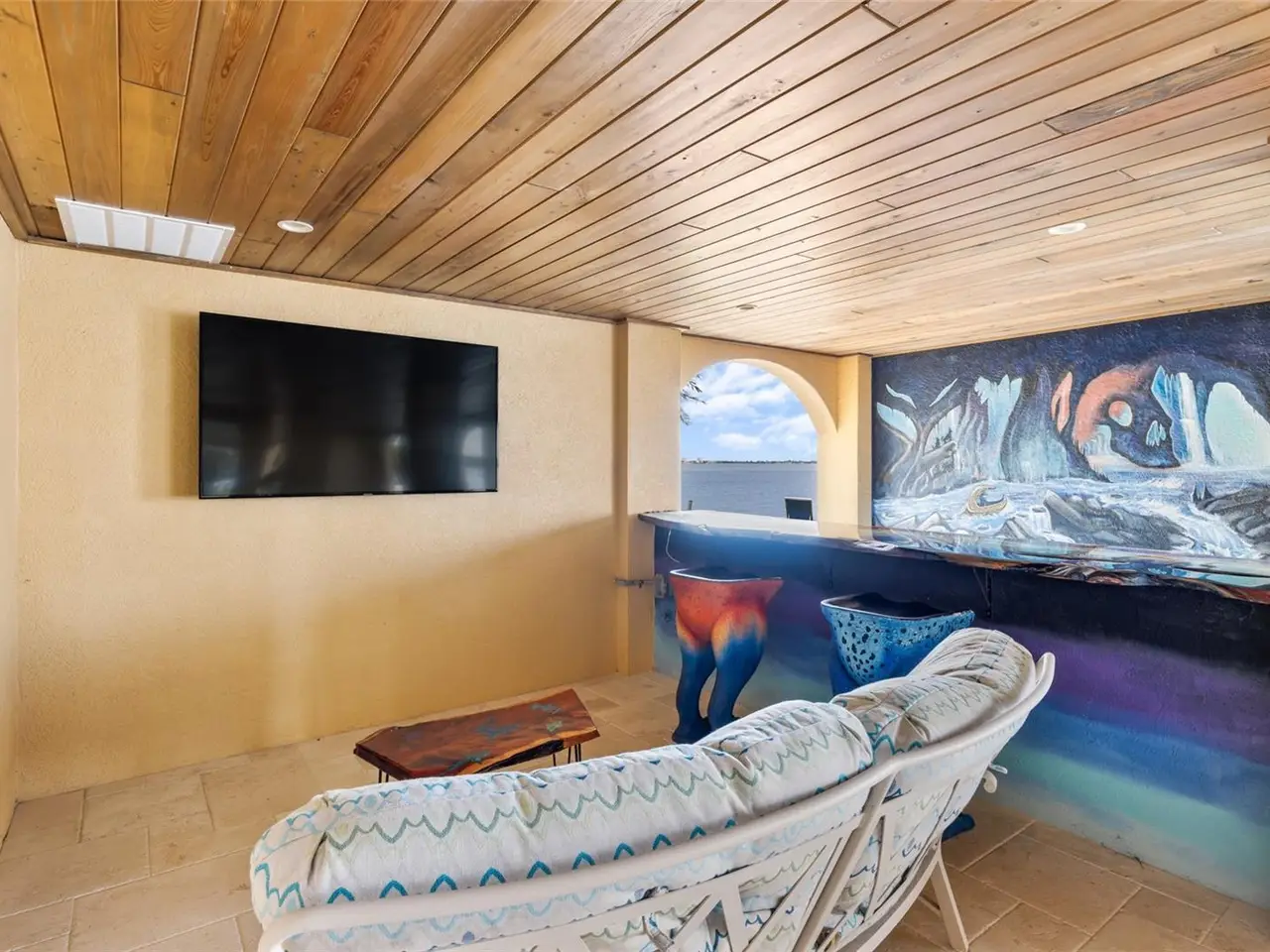 The very best value for open bayfront living near downtown Sarasota. Experience sweeping 270-degree views of Sarasota Bay from this stunning waterfront property. Perfectly positioned to capture iconic vistas of CadZan, the former estate of John Ringling, plus the coastline of Longboat Key and spectacular sunsets. This 7, 000 sq. ft. residence offers exceptional privacy and direct access to deep sailboat water. With a 17 foot elevation, this incredible home has many quality features that you must see to appreciate. Located in Ringling Point, a private cul-de-sac of just 11 homes within the sought-after community of Sapphire Shores, this property is minutes from downtown Sarasota, yet feels worlds away. The home features 5 bedrooms, 3 full bathrooms and 2 half baths, multiple living areas, an elevator serving all floors, and a flexible layout ideal for families, entertaining, or multi-generational living. The main living level includes a formal living room with soaring 24-foot ceilings. Walls of windows fill the space with natural light and frame breathtaking views from every angle. A gas and wood-burning fireplace adds warmth and character, while a full-service bar with a tap dispenser, beverage coolers, and custom cabinetry is perfect for entertaining. The chefs kitchen is outfitted with custom wood cabinetry, granite countertops, dual Dacor gas ranges with stainless hoods, Sub-Zero refrigeration, double ovens, warming drawers, and two dishwashers. A spacious island with seating provides ample space for casual dining or large gatherings. An expansive terrace overlooking the bay runs the width of the main level and is accessible from the living room, bar area, family room off of the kitchen and the guest bedroom. The owner's retreat spans the entire second-floor right wing and features a private sitting area with fireplace, a full-length terrace overlooking the bay, an oversize dressing room with double walk-through closets, and a spa-style bath with a walk-in rain shower and pedestal tub. Just outside the suite is a temperature-controlled wine room. There are two large guest bedrooms on the left wing. Additional features include a 4-car garage, recording studio, hobby and flex rooms, and abundant storage throughout. The home also includes a clay tile roof (2019) and cement block construction built on pilings. Outdoor living is equally impressive. The newer lagoon-style pool features a grotto lounge shelf and gas-heated spa, surrounded by expansive covered terraces with tongue-and-groove ceilings and multiple seating areas to enjoy spectacular sunsets. The private dock extends into the bay, offering deep water access ideal for sailboats and larger vessels, with no fixed bridges to the Gulf. This prime location offers convenient access to downtown Sarasota, Gulf beaches, the Ringling Museum, IMG Academy, University Town Center, and Sarasota-Bradenton International Airport. A rare opportunity to own a legacy estate with unmatched views, quality, and location in one of Sarasota's most desirable bayfront communities.
