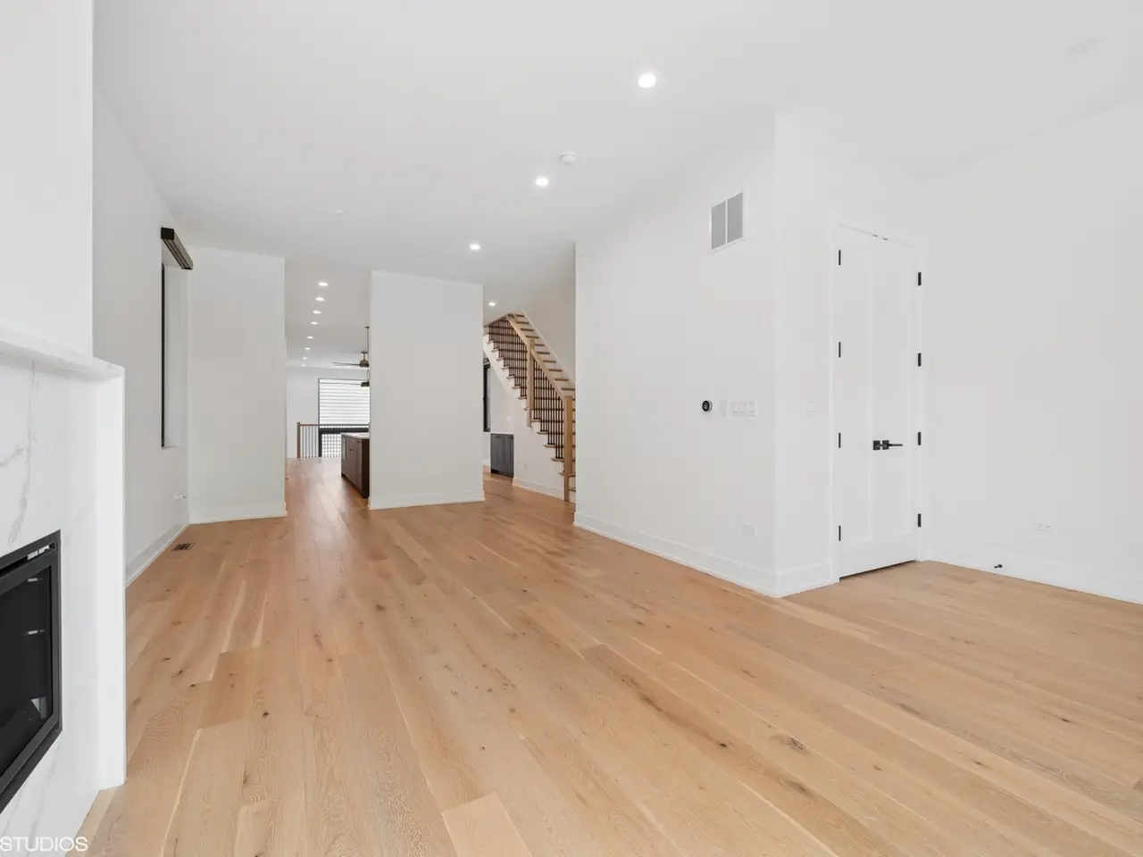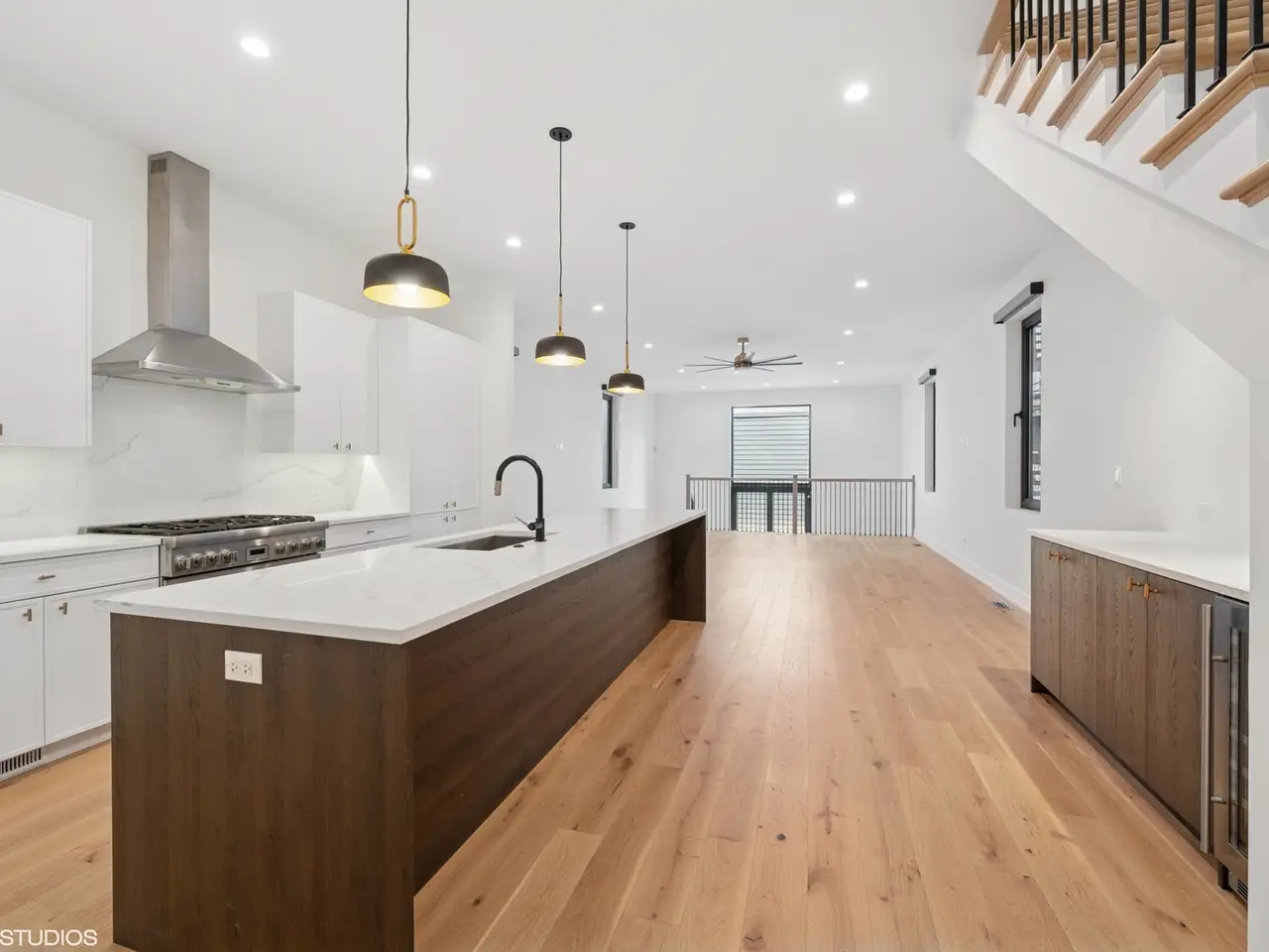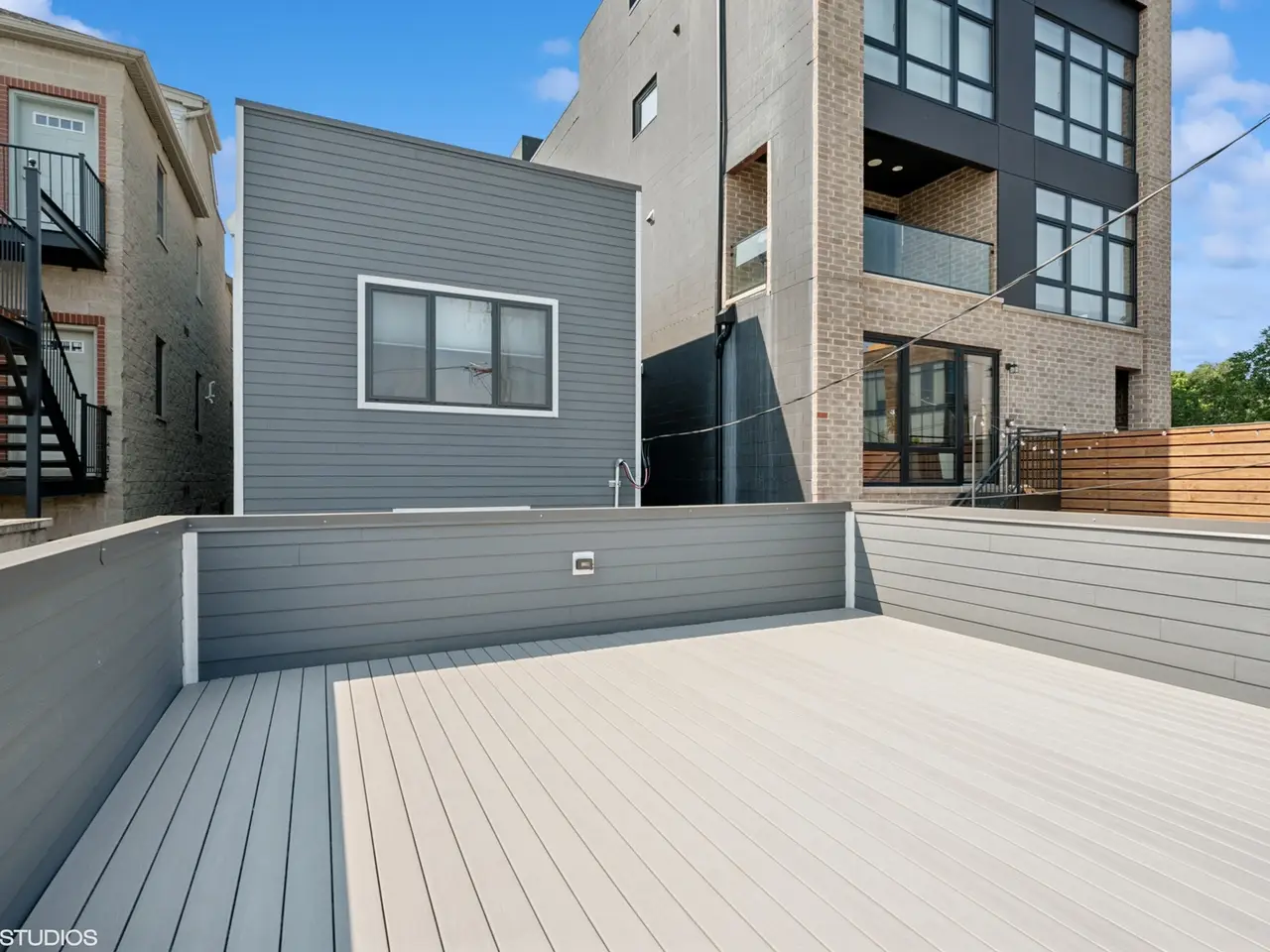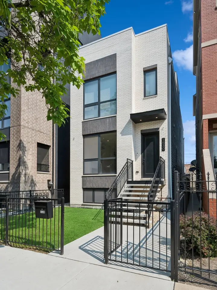 Newly constructed in 2023, this elegant single-family home in West Town seamlessly blends modern luxury with functional design. This 5-bedroom, 4.5-bathroom residence features a full rooftop deck, a garage deck, and a spacious grass front yard and backyard. Lumini windows and 6.5-inch wide-plank hardwood floors enhance the interior's sophistication. The open floor plan showcases a bright, south-facing living and dining area with a quartz-surround fireplace. The gourmet kitchen boasts high-end Thermador appliances, Brizo fixtures, and a large quartz island. Post-construction upgrades include high-end motorized window shades, custom closets, and dual HVAC systems for year-round comfort. The second floor offers three bedrooms, each with en-suite bathrooms, and a convenient side-by-side laundry closet with a countertop. The primary suite features two spacious closets and a spa-like bathroom with an extended double vanity, heated floors, a freestanding soaking tub, and a multi-jet glass shower. The lower level includes two large bedrooms, a recreation room with a den and wet bar, a full bathroom, extra storage, and an additional laundry hookup. The recreation room's den, enclosed by barn doors, provides versatile space for an office, gym, or guest room. Ideal for entertaining, the home features a stunning rooftop deck with skyline views and a backyard perfect for grassy turf or a paved patio. A two-car garage with an additional deck expands outdoor living options. Located in vibrant West Town, steps from West Loop, this home is surrounded by top-tier restaurants and boutique shops.