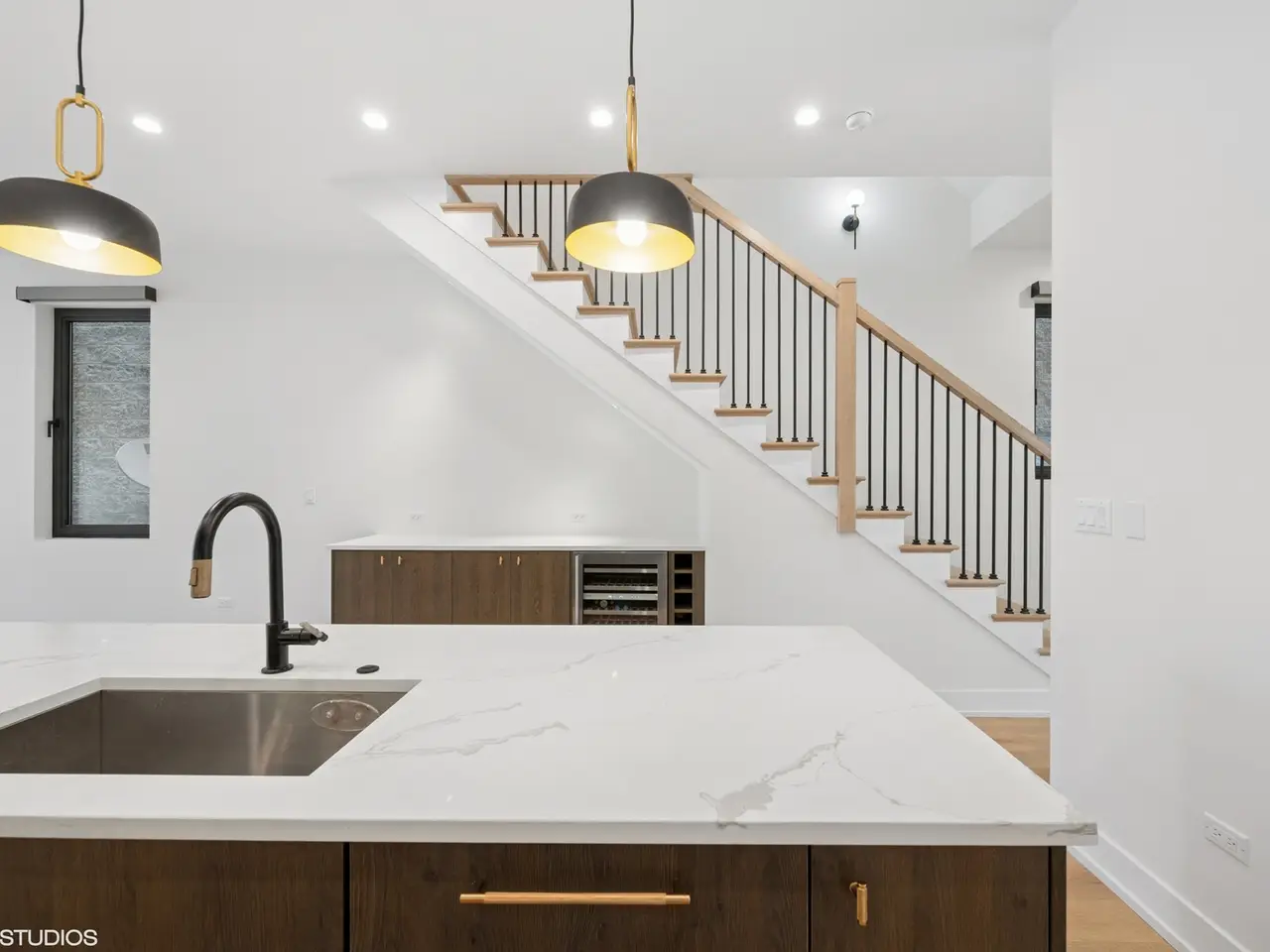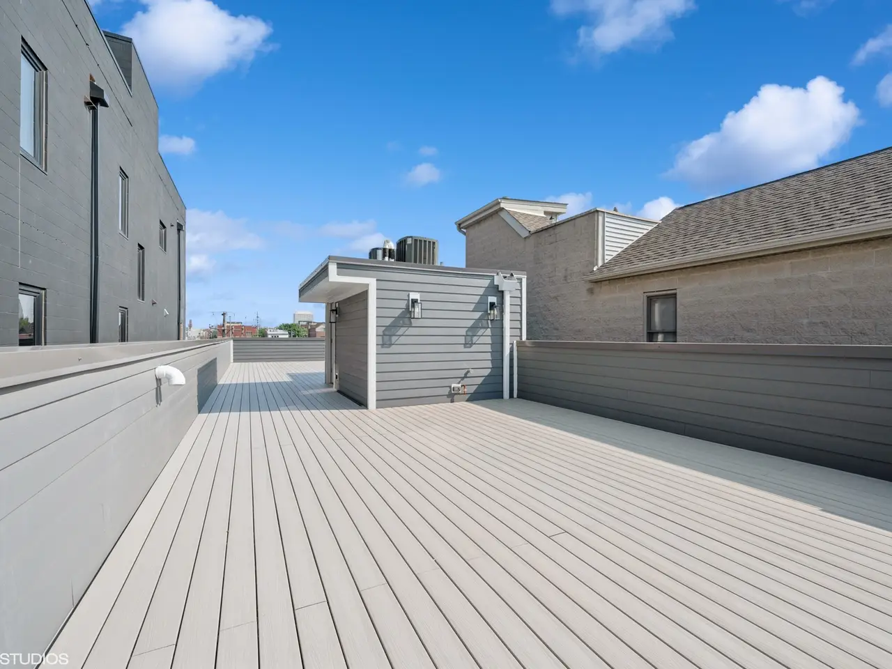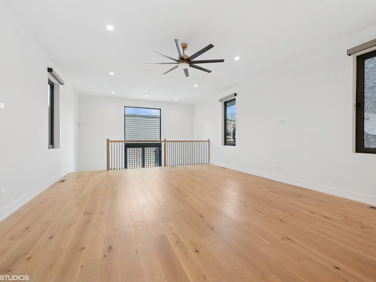Newly constructed in 2023, this elegant single-family home in West Town seamlessly blends modern luxury with functional design. This 5-bedroom, 4.5-bathroom residence features a full rooftop deck, a garage deck, and a spacious grass front yard and backyard. Lumini windows and 6.5-inch wide-plank hardwood floors enhance the interior's sophistication. The open floor plan showcases a bright, south-facing living and dining area with a quartz-surround fireplace. The gourmet kitchen boasts high-end Thermador appliances, Brizo fixtures, and a large quartz island. Post-construction upgrades include high-end motorized window shades, custom closets, and dual HVAC systems for year-round comfort. The second floor offers three bedrooms, each with en-suite bathrooms, and a convenient side-by-side laundry closet with a countertop. The primary suite features two spacious closets and a spa-like bathroom with an extended double vanity, heated floors, a freestanding soaking tub, and a multi-jet glass shower. The lower level includes two large bedrooms, a recreation room with a den and wet bar, a full bathroom, extra storage, and an additional laundry hookup. The recreation room's den, enclosed by barn doors, provides versatile space for an office, gym, or guest room. Ideal for entertaining, the home features a stunning rooftop deck with skyline views and a backyard perfect for grassy turf or a paved patio. A two-car garage with an additional deck expands outdoor living options. Located in vibrant West Town, steps from West Loop, this home is surrounded by top-tier restaurants and boutique shops.