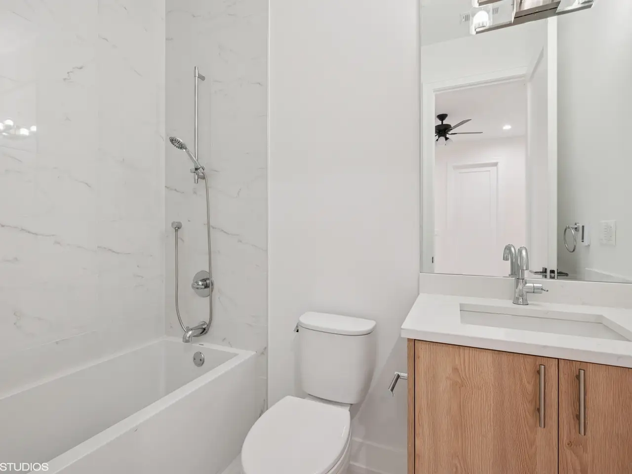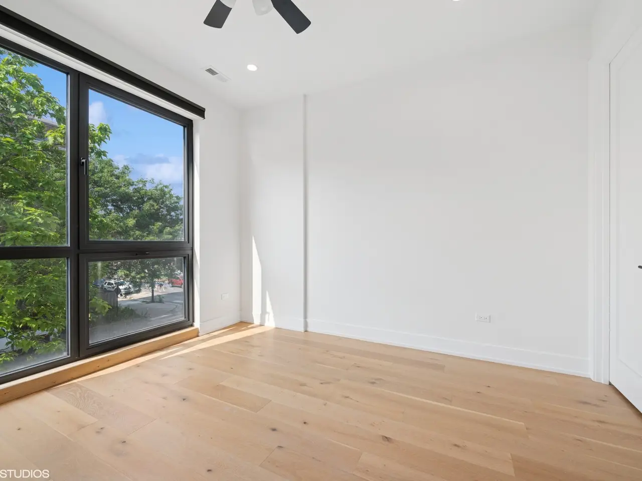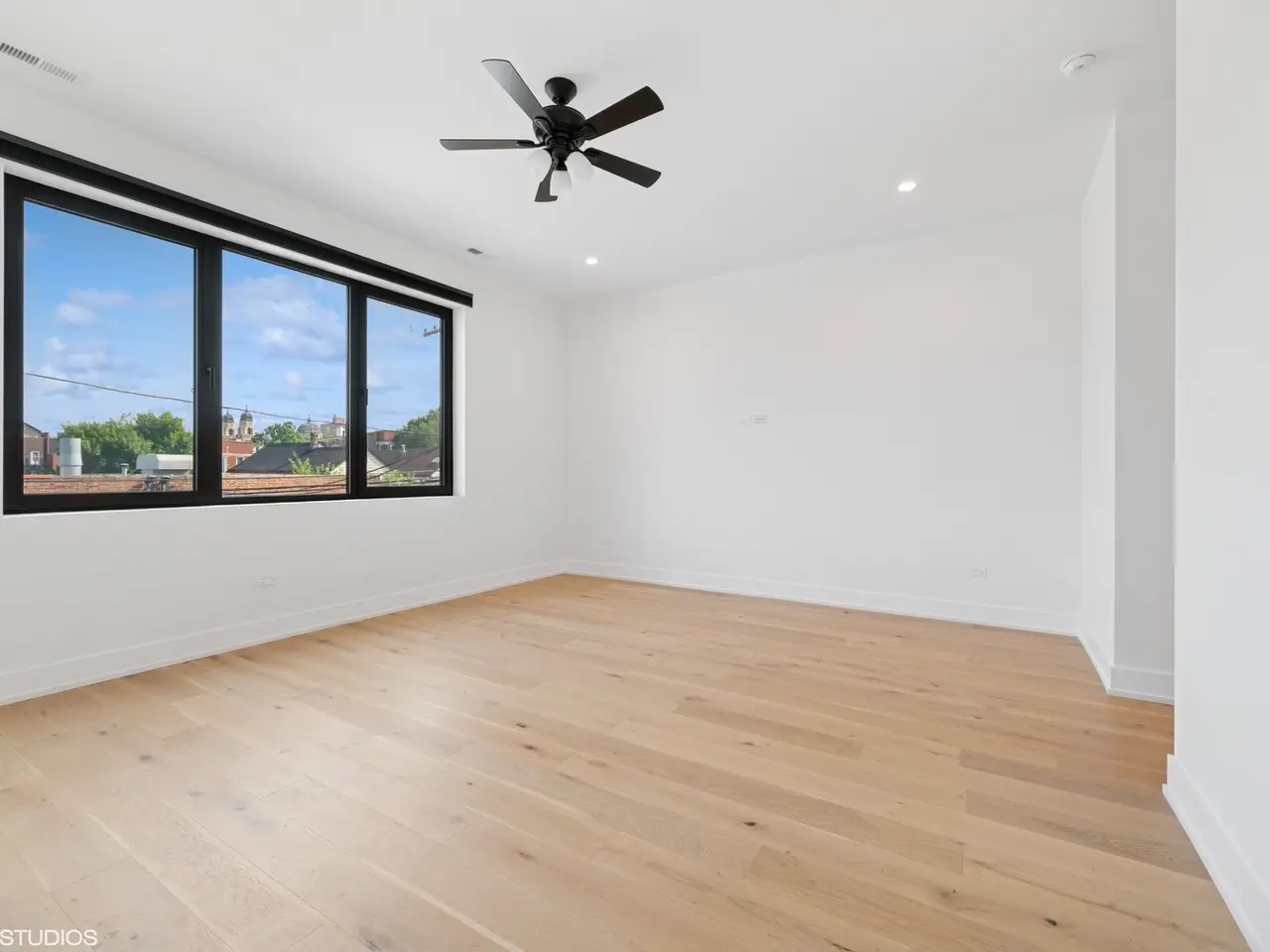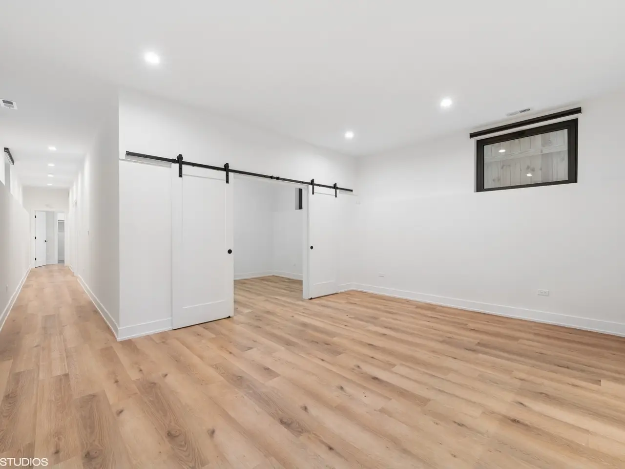 Newly constructed in 2023, this elegant single-family home in West Town seamlessly blends modern luxury with functional design. This 5-bedroom, 4.5-bathroom residence features a full rooftop deck, a garage deck, and a spacious grass front yard and backyard. Lumini windows and 6.5-inch wide-plank hardwood floors enhance the interior's sophistication. The open floor plan showcases a bright, south-facing living and dining area with a quartz-surround fireplace. The gourmet kitchen boasts high-end Thermador appliances, Brizo fixtures, and a large quartz island. Post-construction upgrades include high-end motorized window shades, custom closets, and dual HVAC systems for year-round comfort. The second floor offers three bedrooms, each with en-suite bathrooms, and a convenient side-by-side laundry closet with a countertop. The primary suite features two spacious closets and a spa-like bathroom with an extended double vanity, heated floors, a freestanding soaking tub, and a multi-jet glass shower. The lower level includes two large bedrooms, a recreation room with a den and wet bar, a full bathroom, extra storage, and an additional laundry hookup. The recreation room's den, enclosed by barn doors, provides versatile space for an office, gym, or guest room. Ideal for entertaining, the home features a stunning rooftop deck with skyline views and a backyard perfect for grassy turf or a paved patio. A two-car garage with an additional deck expands outdoor living options. Located in vibrant West Town, steps from West Loop, this home is surrounded by top-tier restaurants and boutique shops.