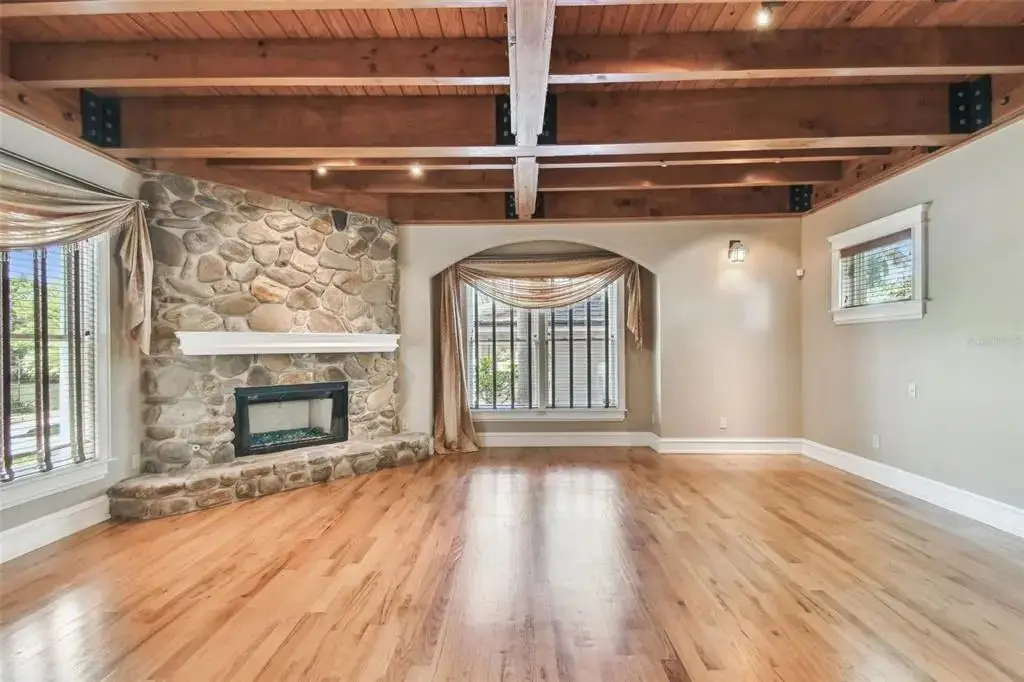 Custom beamed ceilings in living area
