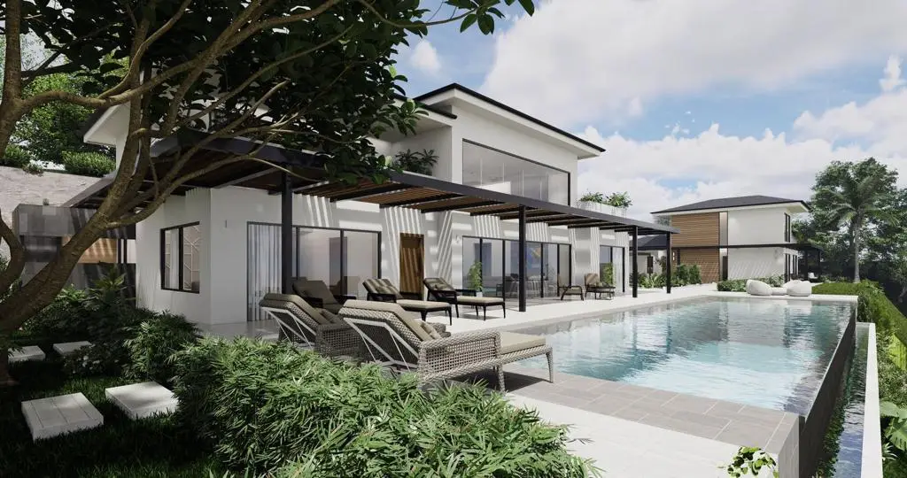 How would you like a brand-new, custom-built home perched on a hillside that offers comfort, luxury, and sophistication? If you do, then this residence in Mar Vista’s La Jolla neighborhood is perfect for you! With 6000 sq ft of indoor living area plus lots of outdoor space, you will enjoy limitless freedom and privacy. Move effortlessly through the open-concept living area with its dramatic 2-story ceilings and abundant natural light through a retractable glass wall leading to a pergola-covered patio and pale blue swimming pool with a horizon edge. The outdoor area is beautifully laid out with decks surrounded by tropical landscaping where you can find a perfect spot to read or doze off in the shade or sun. There is even a covered outdoor kitchen and eating area for a quick lunch after a dip in the pool. Back inside you will love the chef’s kitchen with brand new appliances and a spacious dining area. There are 5 bedrooms and 5 bathrooms for you and your guests to choose between. All have high-end furnishings and a modern, cool, restful décor. The entire home is bright and white with a clean, inviting feeling. It just makes you want to kick your shoes off, collapse into the nearest chaise lounge, and go “Ahhhh…” The luxury development of Mar Vista is located between two of Costa Rica’s most gorgeous beaches—Brasilito and Flamingo. Mar Vista offers its residents security behind gates manned 24/7, a community pool and tennis courts, hiking trails, a playground, a bilingual school, and a nature preserve. In the area are a huge variety of restaurants to dine in and beaches to explore. Just up the road is the brand-new Flamingo Marina, a launching spot for innumerable water sports and activities. Please schedule your visit to Mar Vista’s La Jolla, Lot T, today, and start living the life you have been dreaming of!