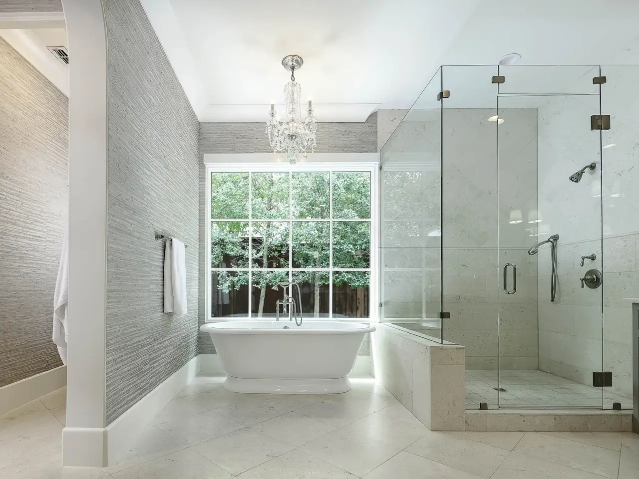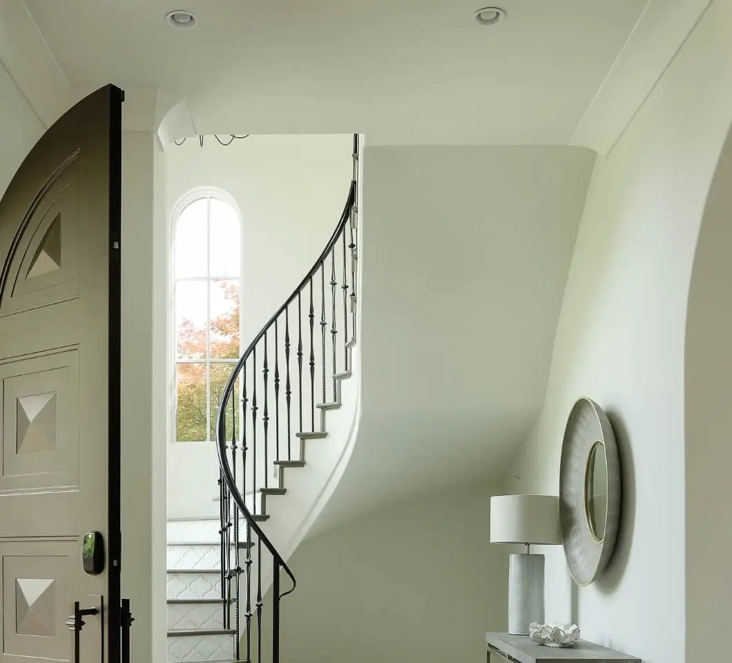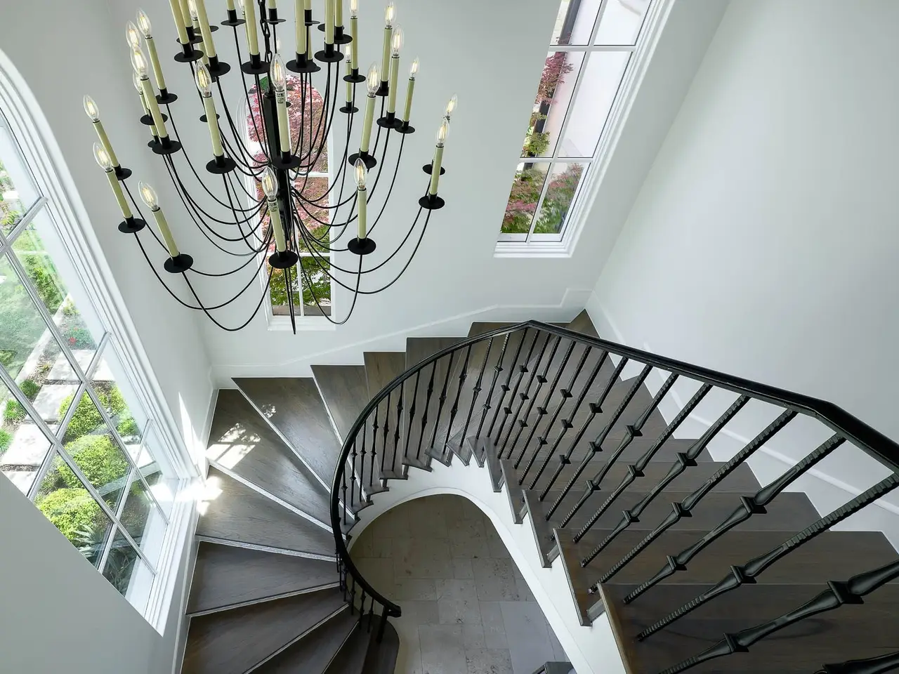 Soaring staircase with leaded glass windows