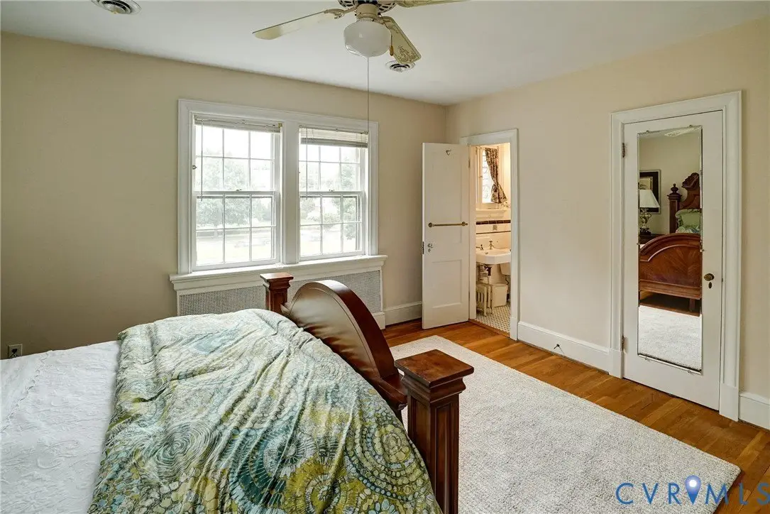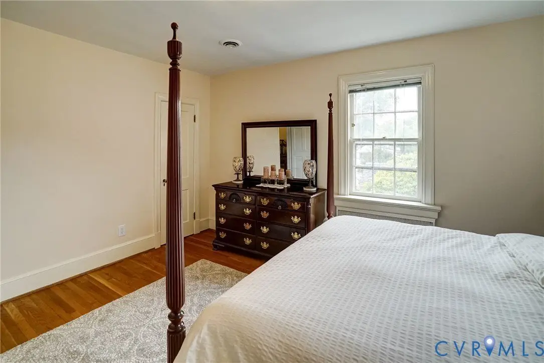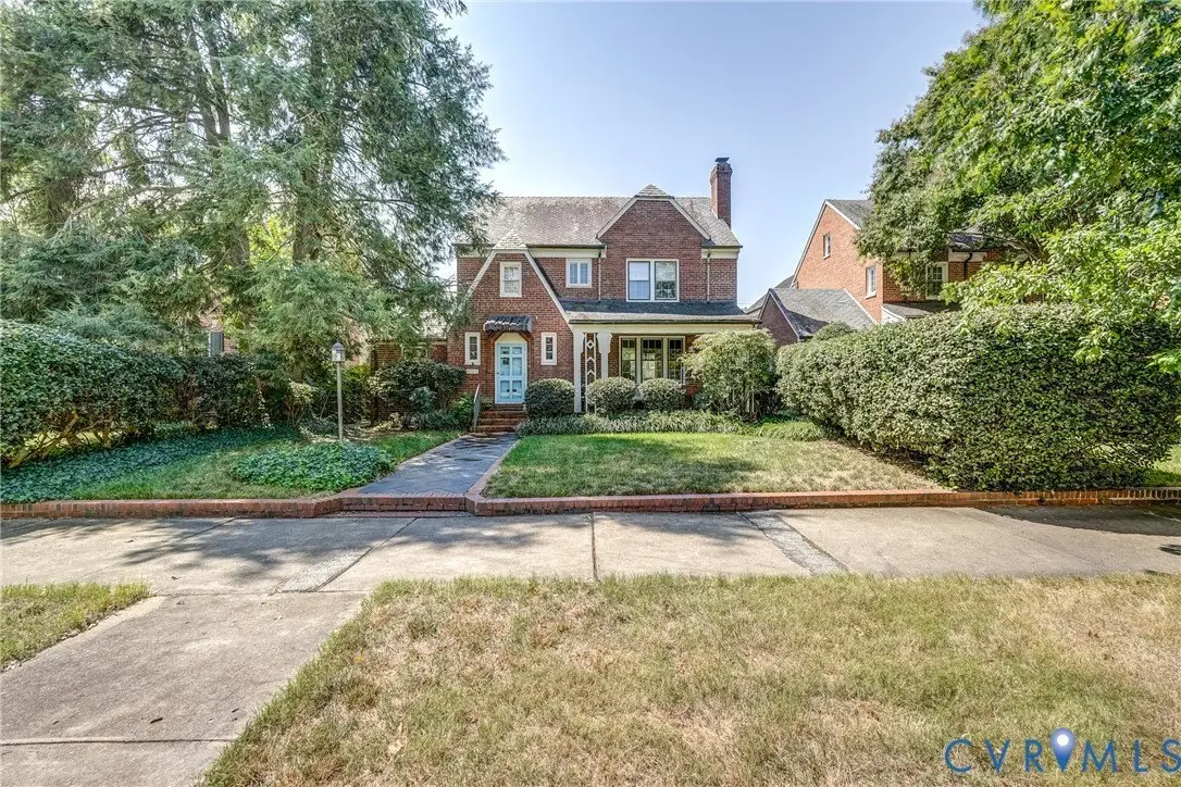 This timeless 1930's Tudor brick and slate home sits nicely tucked away off the beautiful historic Monument Avenue combining classic architecture with fresh updates & thoughtful design. The beautiful full covered front porch boasts original hand-hewn beams displaying the true Arts and Crafts style. Freshly painted in soft, neutral tones, the interiors highlight beautiful hardwood floors, tall ceilings, and abundant natural light. The kitchen offers Blanco granite countertops, a crisp white subway tile backsplash, floor-to-ceiling cabinetry, tile flooring, pantry, butler's stairs, & a charming breakfast nook. A rear door leads to the back brick & slate patios for easy indoor-outdoor living. Entertain in style in the grand dining room, anchored by a crystal chandelier and mouldings. The foyer welcomes with neutral paint, a coat closet, and an open flow into the great room, where a wood-burning fireplace is flanked by original windows & hardware. An additional den/office with built-in bookcases & rattan blinds offers a cozy retreat. Upstairs, the primary suite features a traditional en-suite bath with classic black & white tile. Two additional bedrooms share a full bath/tub bathroom with the same timeless tile, along with walk-in linen closet and dressing/vanity area. The third floor provides a flexible fourth bedroom or bonus room, complete with Berber carpet, two cedar floored closets, built-in drawers, & additional eave storage. A full basement with half bath, custom wooden bar, soap stone wash sink remains unfinished, offering potential for future customization. Outside, the property includes a detached brick garage with automatic door with patios and a rear fenced yard. Lovely landscaping front & back to enjoy throughout the seasons. This Monument Avenue gem blends original character with modern comforts, making it a truly special offering in one of Richmond's most sought-after neighborhoods in the Near Westend. Walkable to Stella's and close to Scott's Addition, VMFA, highway access, and more.