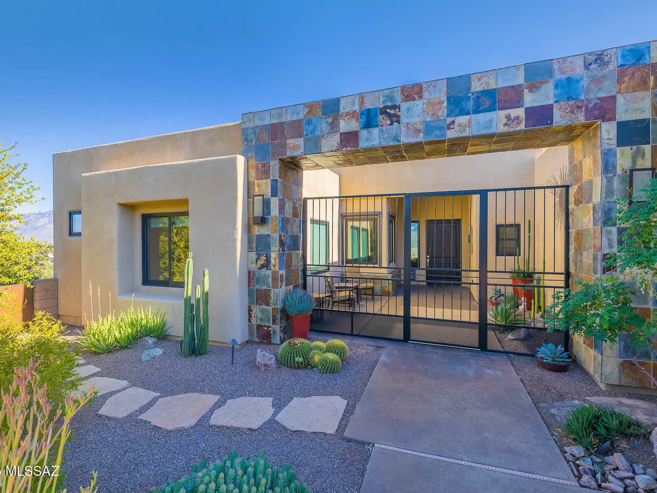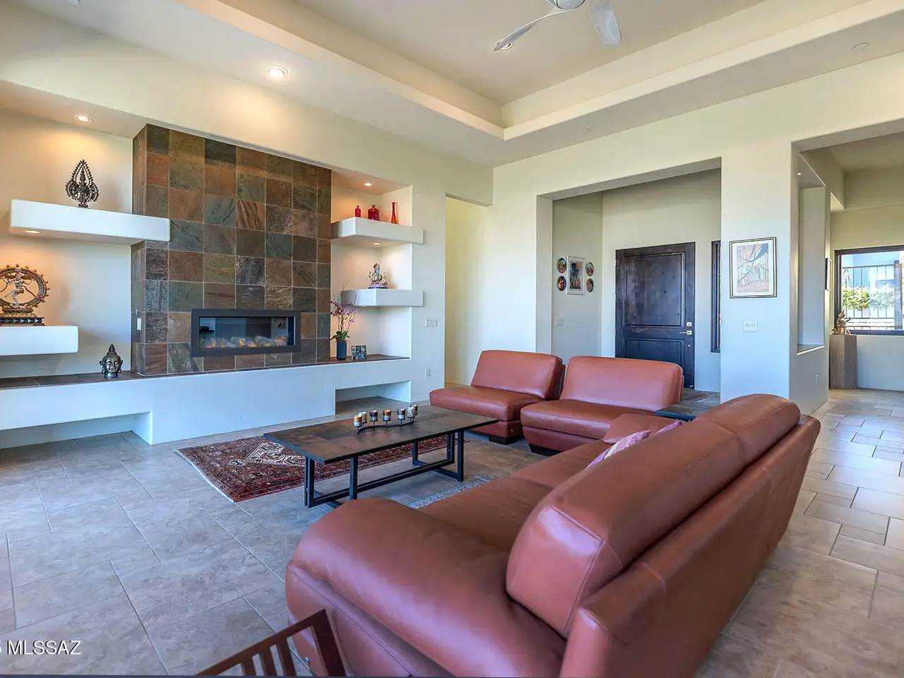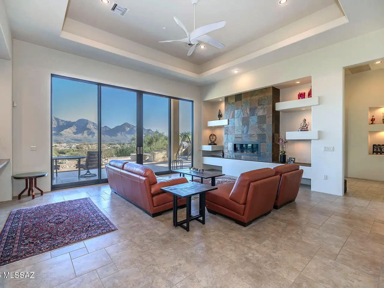LUXURIOUS CUSTOM ESTATE nestled within the gated, picturesque community of Vistoso Pointe affords architectural detail, flexible living spaces plus uncompromising desert, mountain & city light views. Elevated, Premium East-facing lot with no one directly behind affords ultimate privacy. Featured are 4 bedrooms, 2.5 baths plus 3,531 sq ft of elegant living space including a spacious, upper level office/5th bedroom. Striking courtyard entry displays an expansive wrought iron gate with slate tile surround to welcome your guests. Inviting foyer flows effortlessly to formal dining room and large gathering room displaying a soaring, recessed ceiling, slate tiled fireplace flanked by art shelves, plus walls of windows accentuating the magnificent views. Gourmet kitchen hosts large center island, in-wall ovens and gas cooktop, open dining area with views plus outer island with wine cooler. Neutral stone floors highlight main living areas with granite countertops in kitchen, laundry & baths. Expansive Owner's Suite with rear patio access hosts a luxury spa bath with dual vanities, soaking tub, plus walk-in rain head shower and custom closet. Third bedroom is ideal as a Den/Media room while expansive upper-level Office accesses private balcony touting forever views. Extended laundry with sink adjoins powder room and 3-car garage with rustic iron doors and storage cabinets. Additional amenities include rich-hued cabinetry and doors, carpeted bedrooms, backlit art alcoves, fire sprinklers plus rolling sunshades off dining room. Retreat to a rear covered patio with outer cobblestone pavers, built-in grill station, firepit with curved bench seating, plus professional landscaping and spectacular views. Perfect for the most discerning buyer!