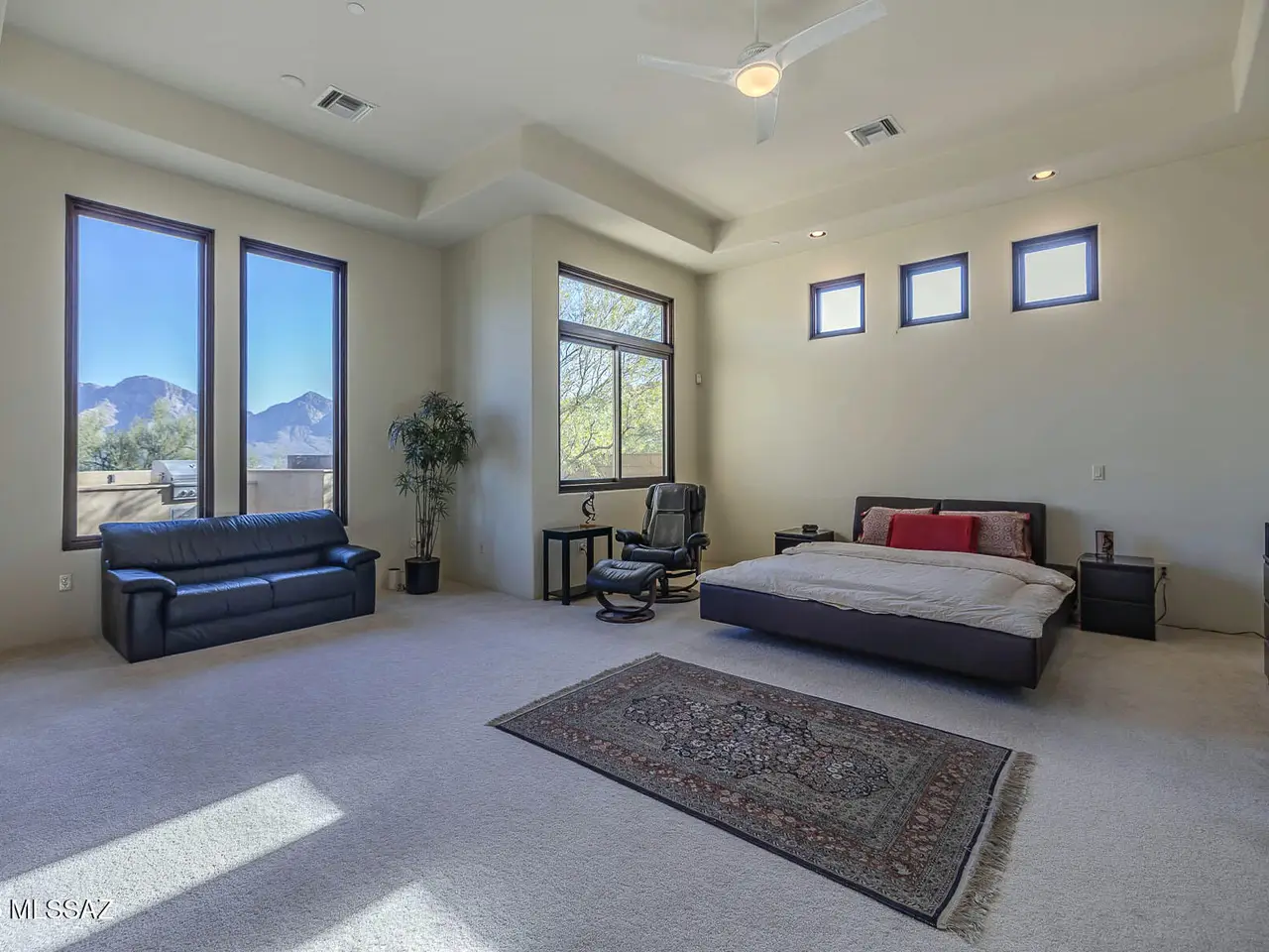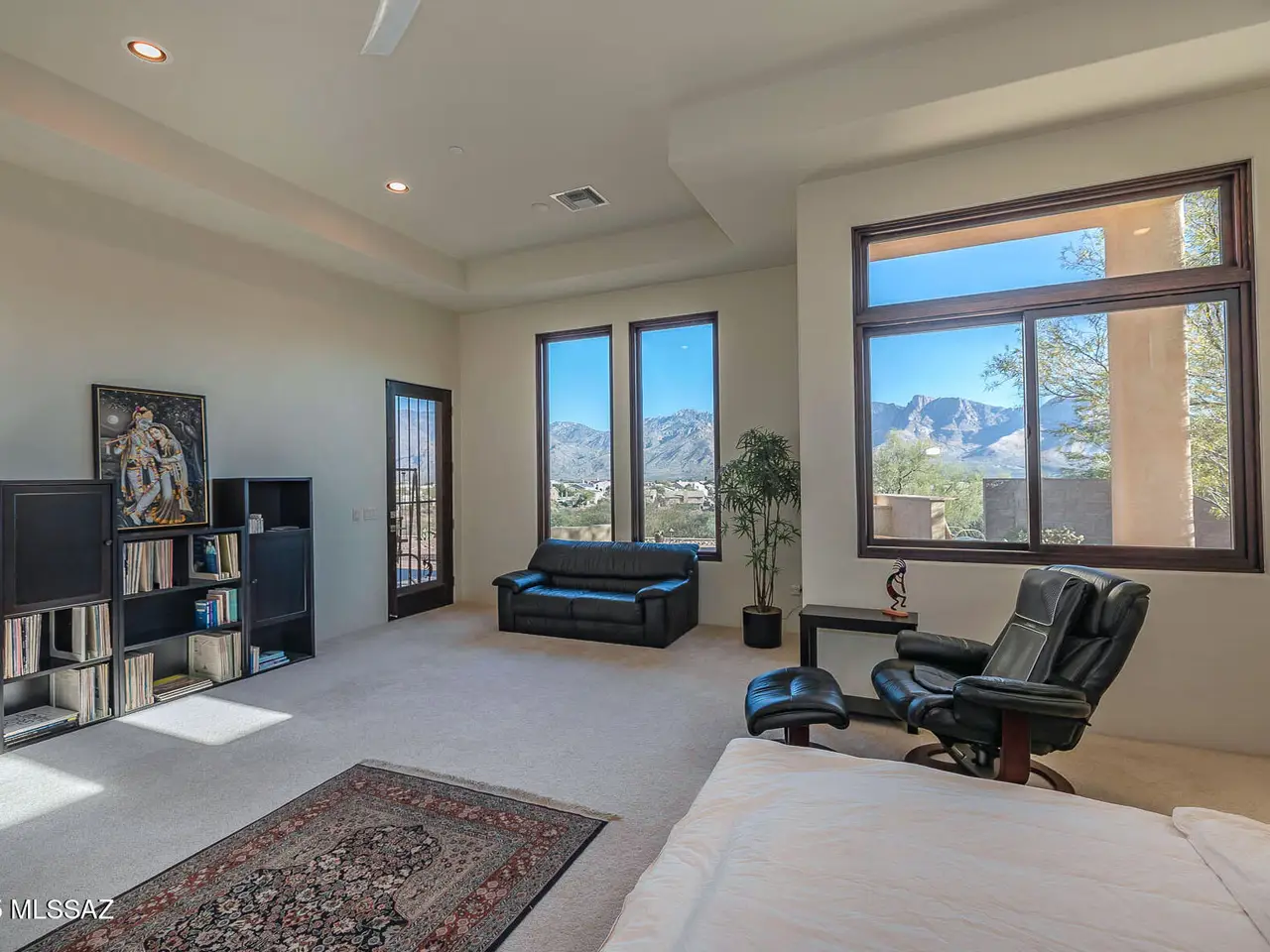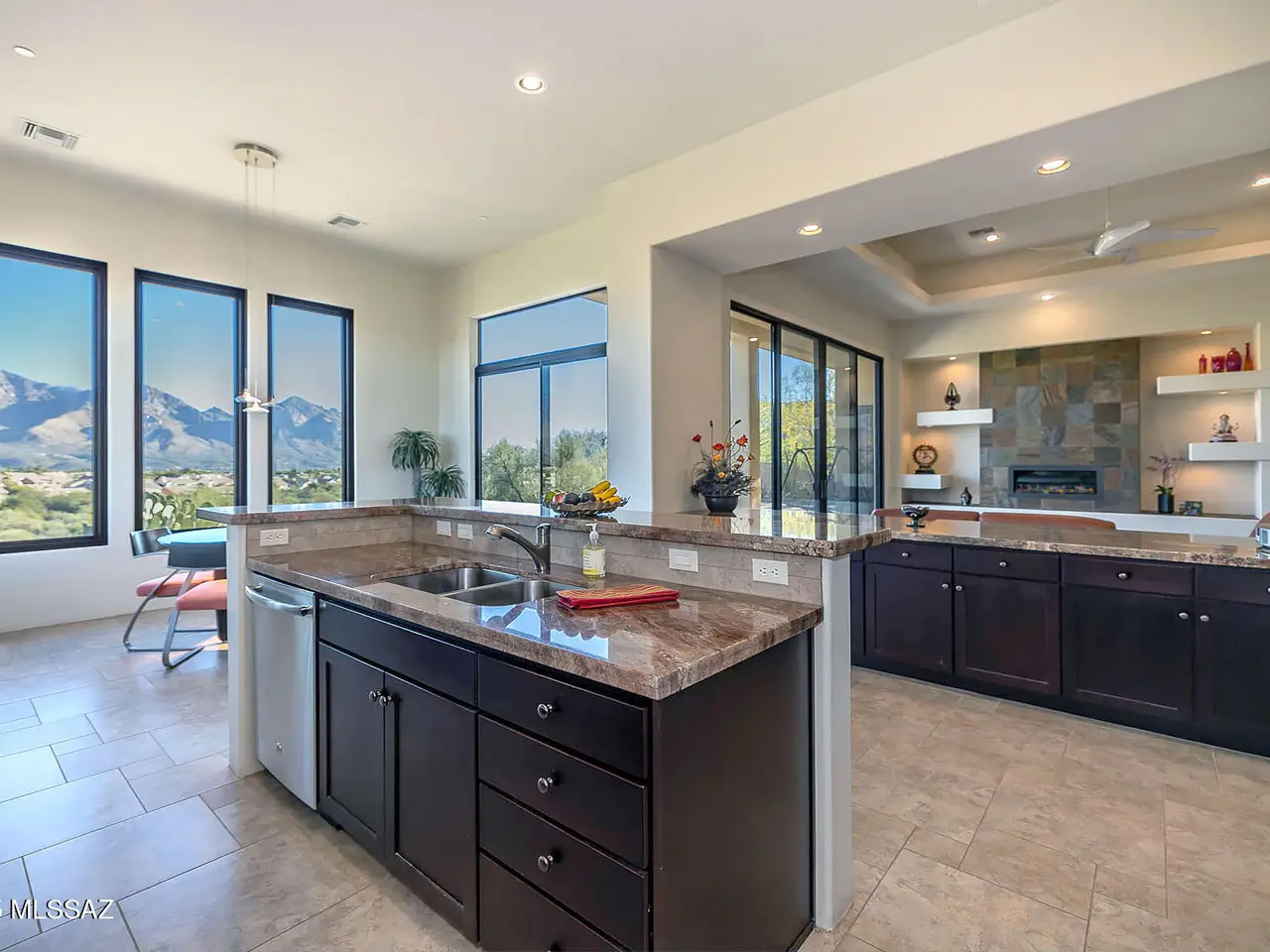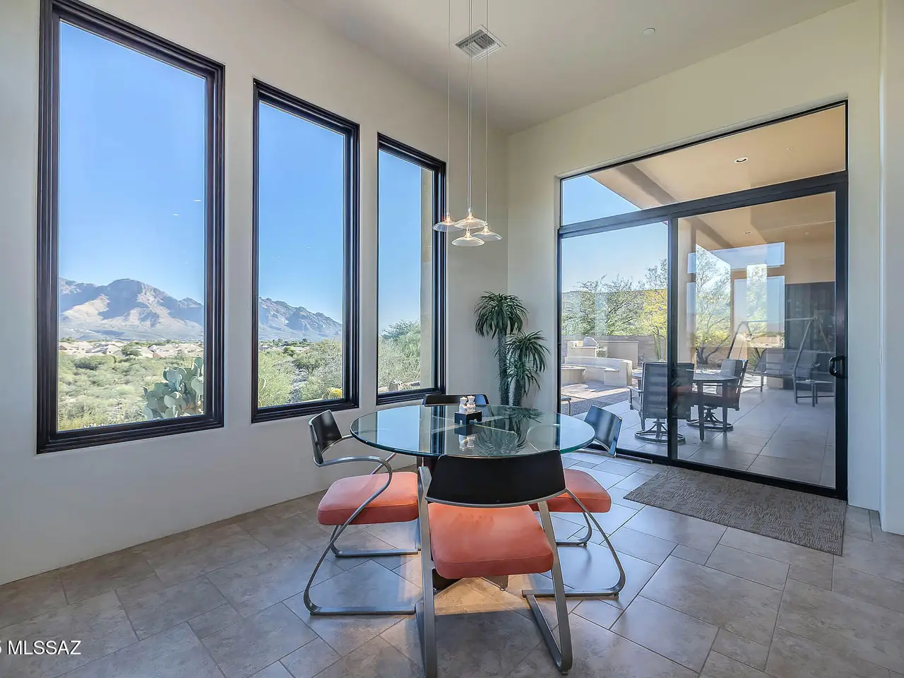 LUXURIOUS CUSTOM ESTATE nestled within the gated, picturesque community of Vistoso Pointe affords architectural detail, flexible living spaces plus uncompromising desert, mountain & city light views. Elevated, Premium East-facing lot with no one directly behind affords ultimate privacy. Featured are 4 bedrooms, 2.5 baths plus 3,531 sq ft of elegant living space including a spacious, upper level office/5th bedroom. Striking courtyard entry displays an expansive wrought iron gate with slate tile surround to welcome your guests. Inviting foyer flows effortlessly to formal dining room and large gathering room displaying a soaring, recessed ceiling, slate tiled fireplace flanked by art shelves, plus walls of windows accentuating the magnificent views. Gourmet kitchen hosts large center island, in-wall ovens and gas cooktop, open dining area with views plus outer island with wine cooler. Neutral stone floors highlight main living areas with granite countertops in kitchen, laundry & baths. Expansive Owner's Suite with rear patio access hosts a luxury spa bath with dual vanities, soaking tub, plus walk-in rain head shower and custom closet. Third bedroom is ideal as a Den/Media room while expansive upper-level Office accesses private balcony touting forever views. Extended laundry with sink adjoins powder room and 3-car garage with rustic iron doors and storage cabinets. Additional amenities include rich-hued cabinetry and doors, carpeted bedrooms, backlit art alcoves, fire sprinklers plus rolling sunshades off dining room. Retreat to a rear covered patio with outer cobblestone pavers, built-in grill station, firepit with curved bench seating, plus professional landscaping and spectacular views. Perfect for the most discerning buyer!
