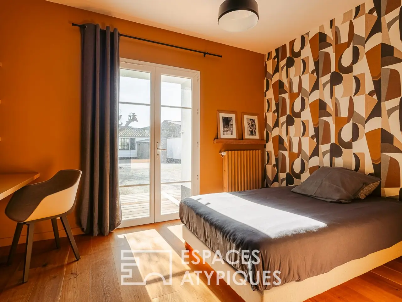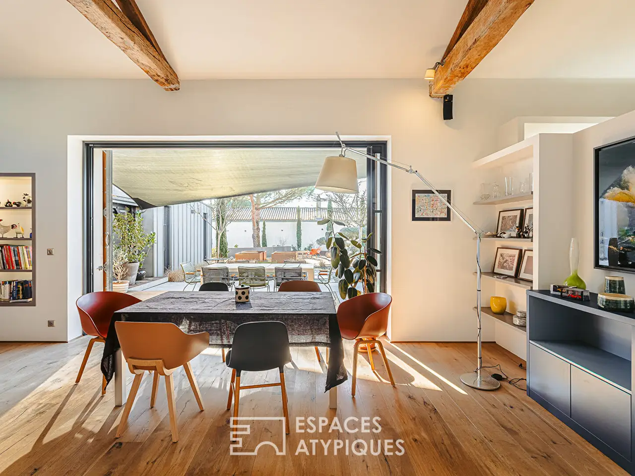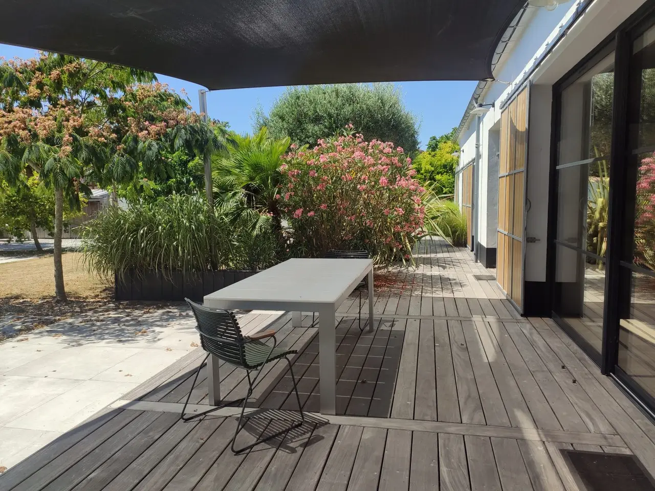 Located in a village between La Rochelle and Chatelaillon-Plage, this old barn, entirely on one level, is the result of an exceptional renovation offering volume, light, noble materials and taut lines. Unsuspected from the street, the building and its vast garden are perfectly sheltered from prying eyes, thus offering a calm and serene living environment less than 5 kilometers from the ocean. The gate and the electric gate open onto a plot of more than 950 m2. Facing south, the old building faces its garden planted with many cypresses, birches, olive trees and oleanders. To enjoy it, this landscape is enhanced by a large Ipe terrace, and a heated swimming pool. From the garden, the architecture of the house is perfectly readable: the old building has been extended by a contemporary extension in order to form an L facing the exteriors, thus forming an enclosure. Accessible from the terrace, the entrance to the house has many custom-made cupboards, in keeping with the cement tiles. It then opens onto the living room with solid parquet flooring. Its XXL volume is highlighted by its high beams, its long sliding bay window and its recesses allowing the spaces to be designed. The large table benefits from the view of the garden. The open kitchen offers a cleverly designed space with high-end equipment. The living room, meanwhile, nestles next to the fireplace integrated into the cupboards dressed with wooden doors. Just above the latter, a glass mezzanine allows you to observe the living room from above, while offering a fifth spare bedroom. As an extension of the living room, a large office of approximately 20 m2 forms the first room of the contemporary extension. This also faces the garden and the large terrace. It is then a cinema room that completes the living rooms. Back at the entrance, a hallway decorated with polished concrete and woodwork leads to the sleeping area with four bedrooms. The first three are designed identically with a custom-made wardrobe and desk facing the bed. These bedrooms share a family bathroom. Finally, the Master bedroom benefits from a larger volume with high beams crossing the space, private bathroom and wardrobe. The house is completed by a boiler room, two toilets, and a storeroom. In the garden, a parking area on the plot completes the garage of approximately 30 m2. Ideally located in the town, all amenities are within walking distance. Easy to access by bike, Chatelaillon beach and its covered market are only 5 kilometers away. For La Rochelle, which is approximately 10 kilometers away, allow 15 minutes by car. A charming house with impeccable design and finishes. ENERGY CLASS: C / CLIMATE CLASS: A. Estimated average amount of annual energy expenditure for standard use, established from energy prices for the years 2021, 2022 and 2023: between EUR2,220 and EUR3,070. REF. EALR1906 Additional information * 9 rooms * 5 bedrooms * 2 shower rooms * Outdoor space : 950 SQM * Parking : 4 parking spaces * Property tax : 2 214 € Energy Performance Certificate Primary energy consumption c : 134 kWh/m2.an High performance housing