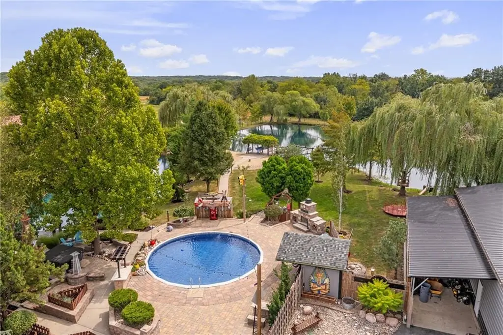Unmatched in character and amenities, this gated 5-acre Lone Jack property is designed for those who love to entertain, live outdoors, and need space for a home-based business. The grounds are extraordinary, with two large ponds - one offering a sandy beach, dock, playhouse with hurricane deck, and zip line, the other showcasing a dramatic 12-foot stone waterfall. Multiple weeping willows surround the water, creating a picturesque, park-like setting. Outdoor living is unbelievable with a swimming pool, outdoor shower, festive poolside bar, basketball court, striped parking for nine cars, multiple firepits, fountains, and extensive landscaping and unique trees. A huge raised-bed garden with drip irrigation and automatic watering, vintage 1950s merry-go-round, playground and pergola framed with wisteria over the water complete the retreat. The 2006-built two-story home offers quality and comfort with hard surface flooring throughout the main level, five fireplaces, formal dining, office, and a hearth room/kitchen with island seating for five, Viking six-burner cooktop. French doors open to a fenced dog yard with pergola and hibachi grill. Upstairs, four bedrooms each enjoy private baths; the oversized primary suite boasts a fireplace, sitting area, private covered balcony with mini split, and a massive walk-in closet. The walkout lower level is built for gathering, with a theater, arcade, full bar, non-conforming fifth bedroom, full bath, and access to a saloon-style patio with hot tub and firepit. Complete set up for livestock and farm animals with fenced pen, multiple shelters and duck pond. The property also includes a new outbuilding with concrete floor, two large overhead doors, built-in compressor, and plumbing for living quarters - ideal for equipment storage, hobbies, or running a business. Meticulously maintained and set on blacktop, this one-of-a-kind estate combines resort-style living with everyday functionality - an entertainer’s paradise inside and out.