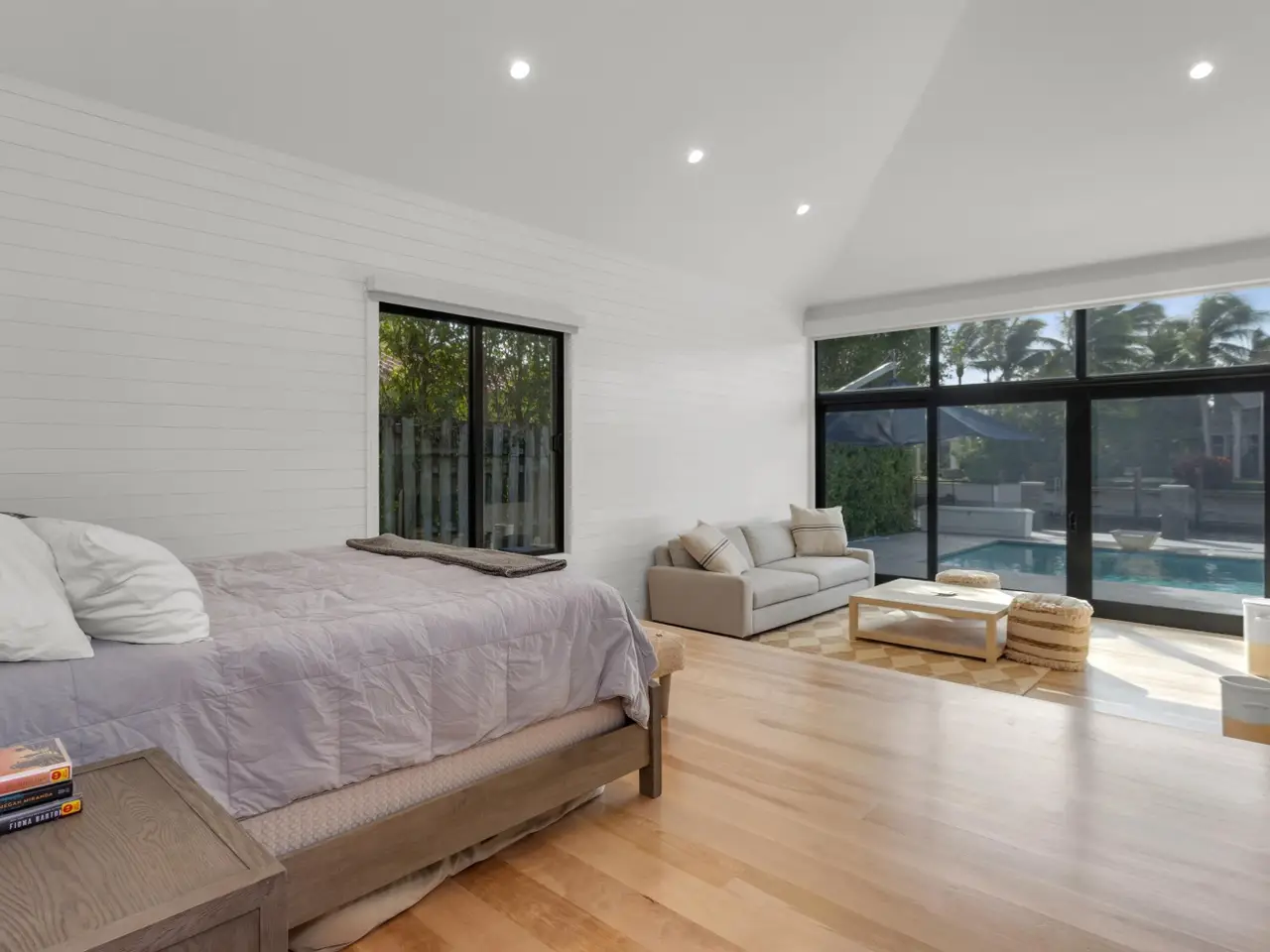 Blending contemporary architecture with lofty urban chic, this dramatic yachting estate offers a voluminous open floor plan with stunning interiors, serene water views, and direct ocean access. A massive glass grid entry with oversized custom double doors reveals a towering 30-foot foyer, which is a prelude to the voluminous expanse of this open-plan design. A skylit gallery sitting area is framed by twin suspended staircases with open cable rails and recessed stair lights. The dining area offers a floor-to-ceiling expansive grid window wall view of the sun-drenched pool and waterway. Soaring shiplap walls and bleached oak designed porcelain floors provide a modern farmhouse ambience.