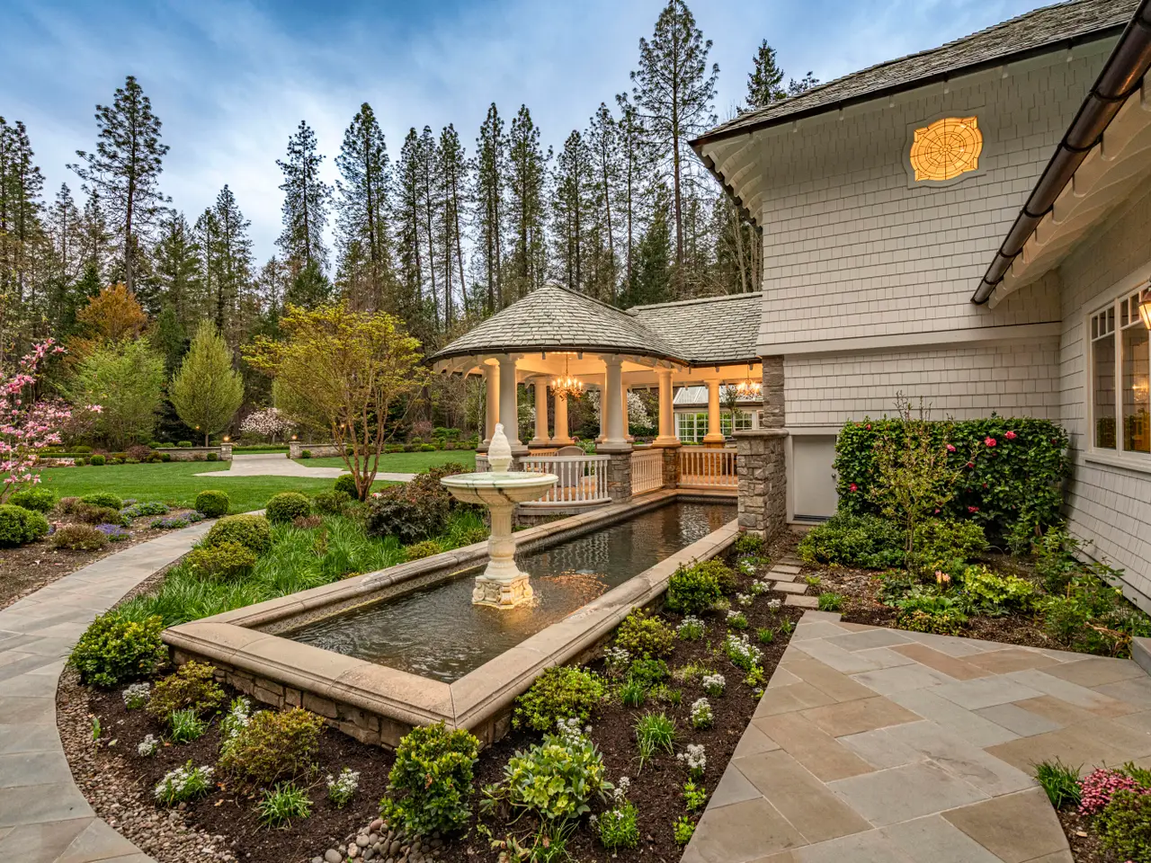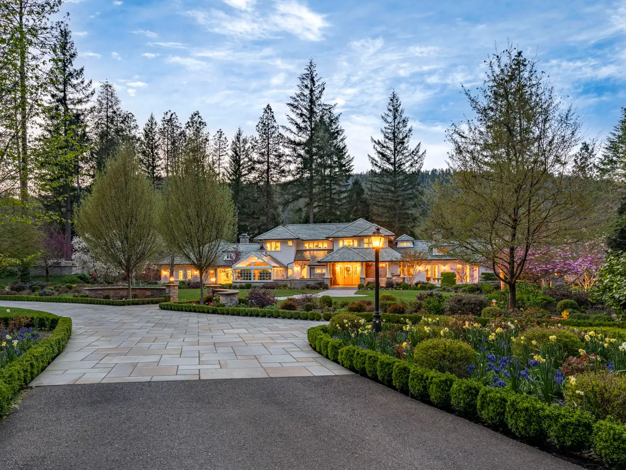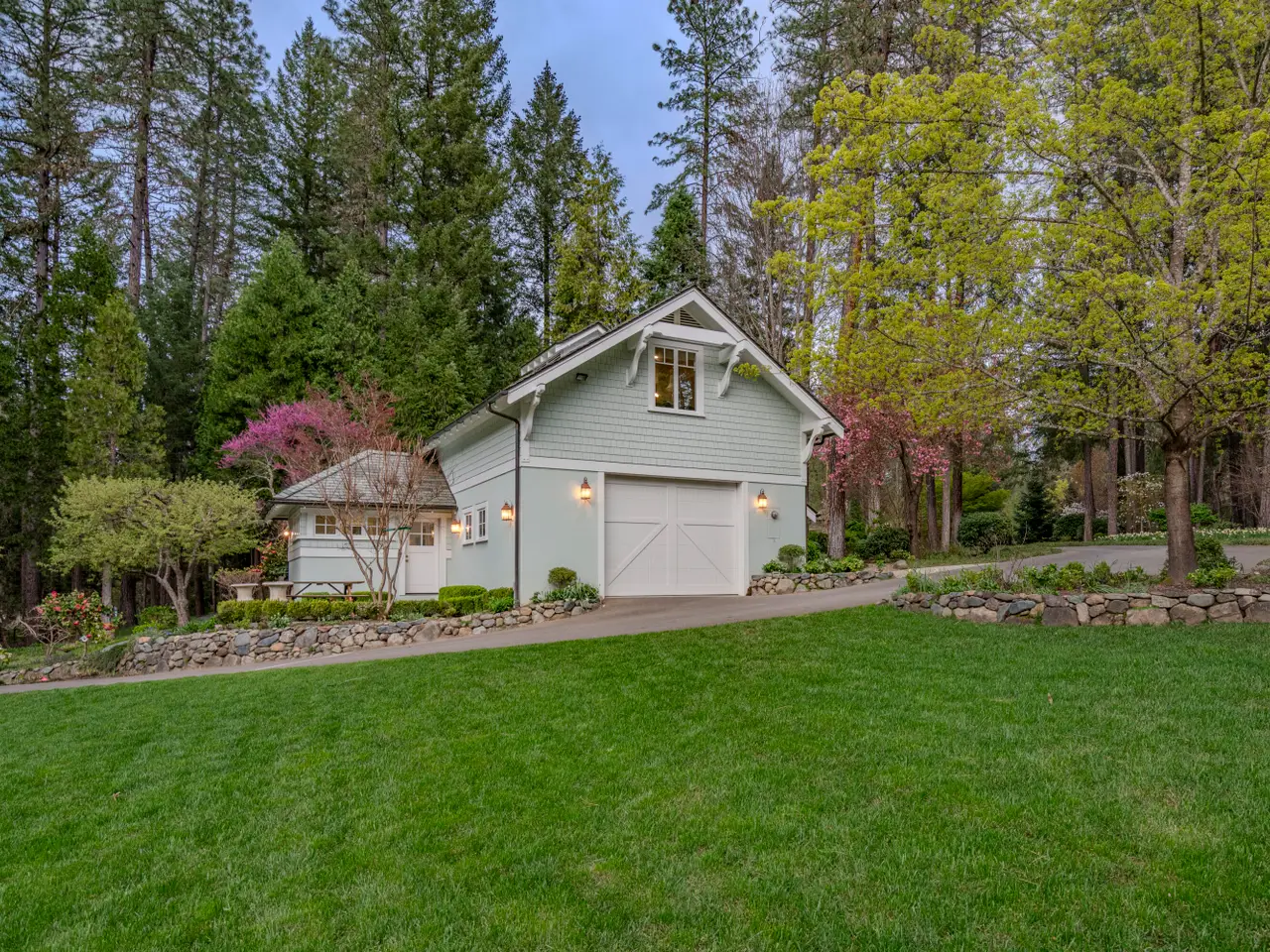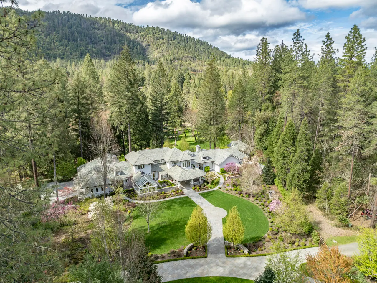 For the first time, this distinguished riverfront estate is made available for purchase. Greeted by a European-inspired bridge & water features, this exquisite English Country estate is elevated above & within the Wild & Scenic section of the Rogue River. Designed by Mike Casella, it blends Arts & Crafts details with Victorian elegance. Highest quality materials & craftsmanship throughout including imported slate roof, hand-carved Carrara marble fireplaces, & custom millwork. A well-appointed chef's kitchen, butler's pantry, root cellar, conservatory, library, main level primary suite with baja & steam showers, dressing room w/ extensive built-ins, and three vanities. Lush and irrigated, year-round color with 1000's of plantings. Numerous water features, 15000 SF garden w/ orchard, berries & vines. Detached gym/home office, finished 3 car garage, barn w/guest quarters, and private riverfront park.