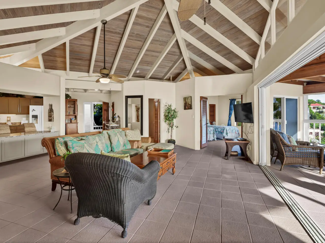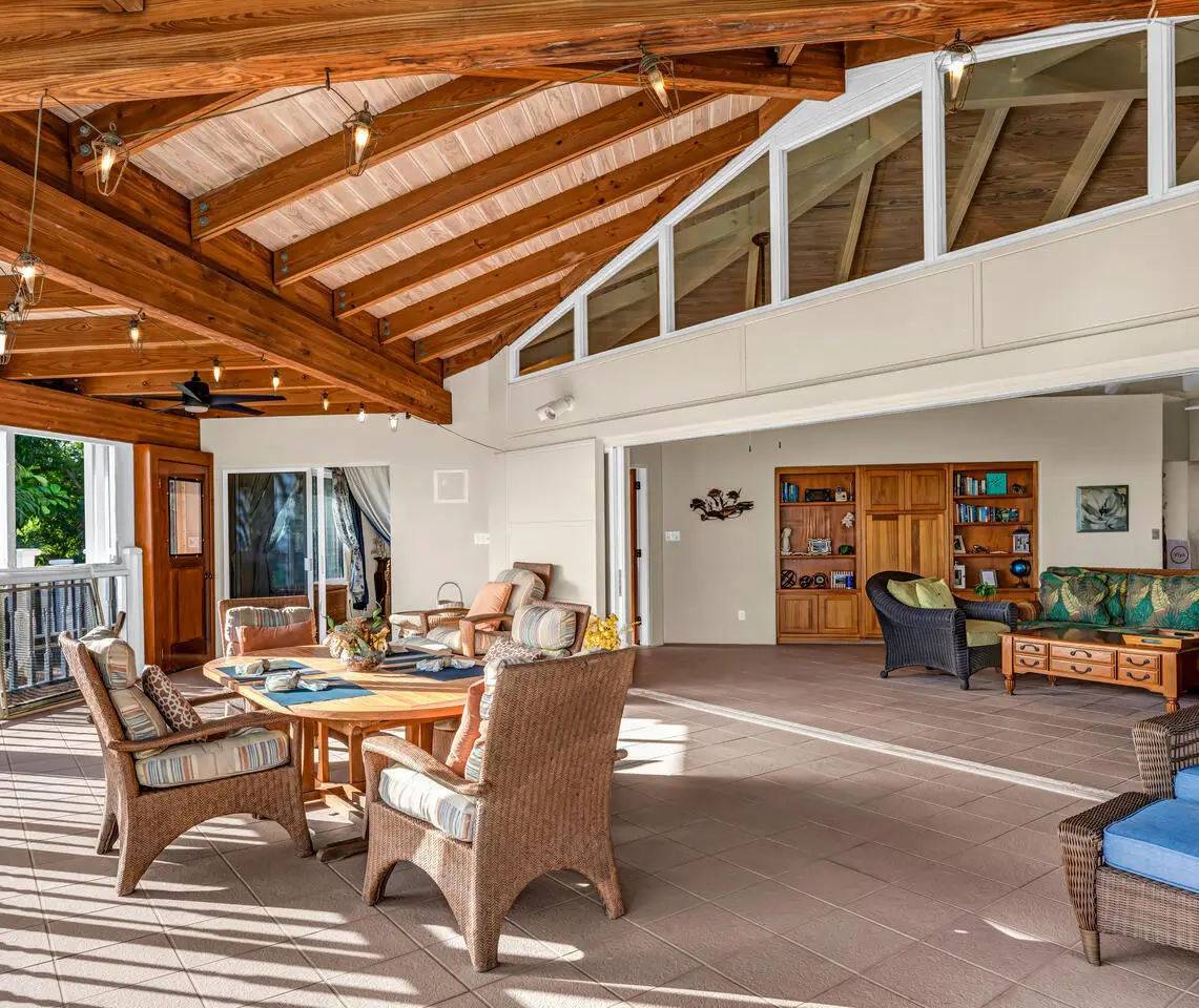 Harts Delight is a stunning villa with numerous amenities and a serene setting on the South Shore of St. John. A spacious, open upper level features high vaulted ceilings in the spacious great room which opens onto a large screened-in porch area, and a deck with captivating views of Hart Bay. Two air-conditioned bedrooms, each offering privacy are situated on opposite sides of the great room. The pool area is ideal for lounging and adjoins a lower level porch for dining and relaxation. On the lower level with its own private entrance is a one bedroom apartment for added flexibility as income producing rental, caretakers unit, or guest quarters.