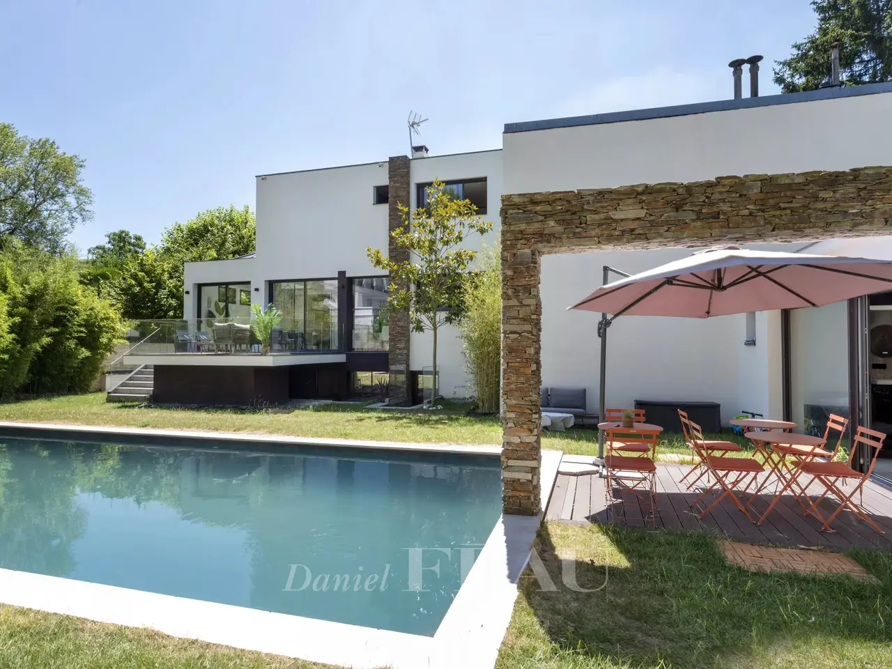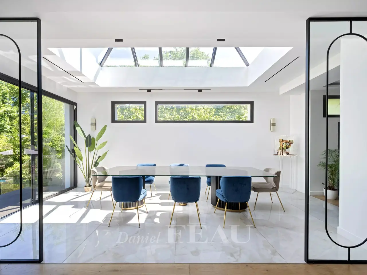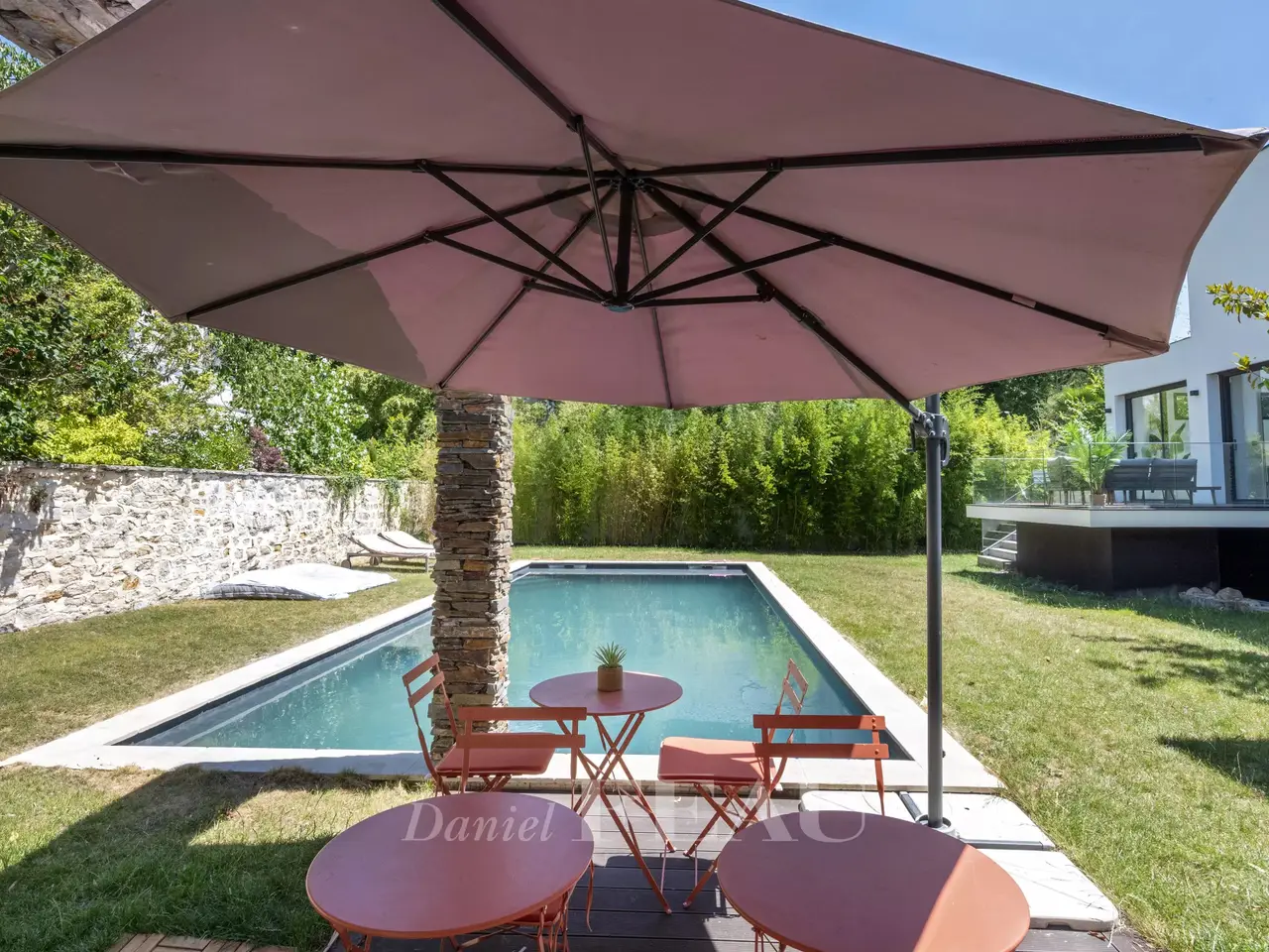 Contemporary Architect-Designed House in La Varenne Saint-Hilaire – Just Steps from the Banks of the Marne Located in the sought-after neighborhood of La Varenne Saint-Hilaire, just a few steps from the banks of the Marne River, this architect-designed house, built in 2018, combines raw concrete and schist for a strikingly contemporary aesthetic. With approximately 400 m² (4,305 sq ft) of living space spread over three levels, this exceptional property sits on a nearly 800 m² (8,611 sq ft) plot, with a 145 m² (1,560 sq ft) building footprint. It also includes a fully equipped 50 m² (538 sq ft) pool house (25 m² on the garden level and 25 m² upstairs). Layout of the spaces: Garden level: Entrance hall with built-in storage Dual-aspect kitchen facing Boulevard de la Marne, with direct access to a first terrace Spacious and bright living room opening directly onto a second terrace and the garden Lounge/study with garden views and direct access Guest toilet with storage Fully equipped technical room: home automation system, distribution panels, thermodynamic water heater, underfloor heating (present on all three levels), centralized air conditioning First floor (sleeping area): 5 bedrooms, including: A master suite with walk-in closet, en-suite bathroom, and access to a private terrace with panoramic Marne views Two bedrooms with private shower rooms Two additional bedrooms with direct access to the terrace 4 bathrooms and 3 separate toilets Pool House (total of 50 m² / 538 sq ft): Open kitchen and living area Bedroom, bathroom, and toilet Natural light-filled basement: Gym with garden access Office with large window overlooking the garden (can serve as an extra bedroom), with adjoining shower room Large storage room with built-in closets Children’s playroom Secondary refrigerator and laundry area Double garage with storage and electric vehicle charging station Outdoor features and amenities: 3 terraces, including one with unobstructed views of the Marne Heated swimming pool (11 x 4.5 m / depth: 1.45 m) with heat pump Landscaped, private garden with no overlooking neighbors This recent home combines contemporary design, functionality, and comfort in a quiet, green setting, just steps from the Marne and the conveniences of La Varenne. The building complies with RT2012 energy regulations.