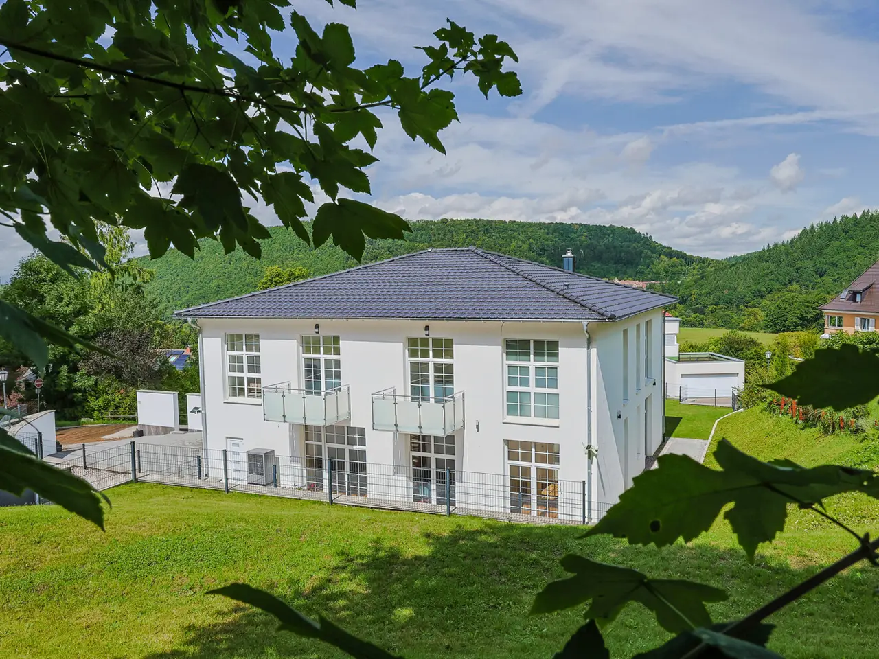 This impressive villa in the picturesque spa town of Badenweiler offers you an incomparable living experience on a living space of 340 m² and a spacious plot of 1592 m². A harmonious interplay of space and light unfolds over two floors. The eight rooms of this modern property invite you to realize your personal wishes and enjoy life to the full. The open-plan living area creates an inviting atmosphere, while two balconies allow you to enjoy the fresh air and the breathtaking natural surroundings of the villa. Another highlight of this villa is the cozy fireplace, which not only provides warmth, but also creates a cozy atmosphere on cold evenings. Security is a top priority here thanks to the alarm system, which gives you a reassuring feeling of security. This luxurious residential property is ideal for families or discerning couples looking for something special. The well thought-out north-facing orientation of this spacious plot guarantees a perfect balance of sun and shade. Especially in summer, you will always be woken by the sun in the bedrooms in the morning and can admire the sunset from the terrace or living room in the evening. Half of the house's spacious terrace provides shade, while the other half offers a sunny area for playing. In addition, the spacious rear plot provides a quiet retreat to enjoy the sun undisturbed.