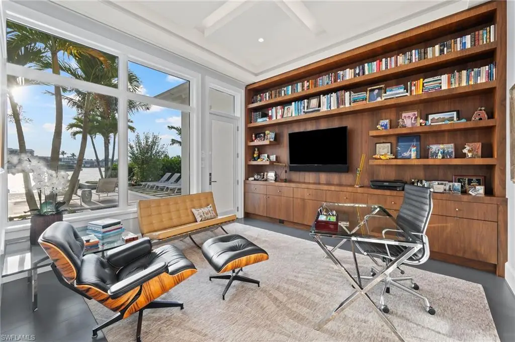 Welcome to your dream retreat in the heart of Coquina Sands - one of Naples' most desirable neighborhoods. Thoughtfully designed by acclaimed architect Stofft Cooney and built by the renowned Toscana Homes, this elevated custom estate (built at over 10 feet) is a boater's dream, offering direct bay access and everything you need for the ultimate waterfront lifestyle. The private dock is fully equipped with a boat lift, kayak launch, water and power hookups, Snook lights, and a fish cleaning station - perfect for sunset cruises or catching dinner right from your backyard. With nearly 1,900 sq ft of open-air deck space, an oversized infinity-edge pool with multi-color lighting, spa, fire pit, and lush landscaping featuring rare tropical trees, the outdoor setting is nothing short of spectacular. Inside, the home makes a striking first impression with a reflection pool and dramatic bay views from the moment you enter. Wide-plank wood flooring flows into the expansive great room, featuring a sleek linear fireplace and two climate-controlled wine cellars holding up to 1,000 bottles. Entertain with ease at the bar with beverage fridge or cook in the show-stopping kitchen with hidden breakfast bar, Sub-Zero and Wolf appliances, steam oven, and high-end European cabinetry. Wake to stunning water views in the main-level master suite, which offers dual walk-in closets, a steam shower, and two water closets. A second bedroom is also downstairs, while the upper level includes three additional bedrooms - or two and a media/game room - all with balcony access and more incredible bay views. Additional features include electric screens and shutters, a summer kitchen, Vantage lighting system, 6 zone Sonos system, electric window shades, built-in audio, 55 solar panels, a full-home generator, and a durable metal roof. This exceptional residence combines expert craftsmanship with unbeatable location and waterfront luxury - a true boater's paradise in the heart of Naples.