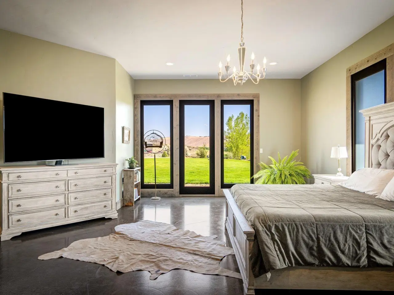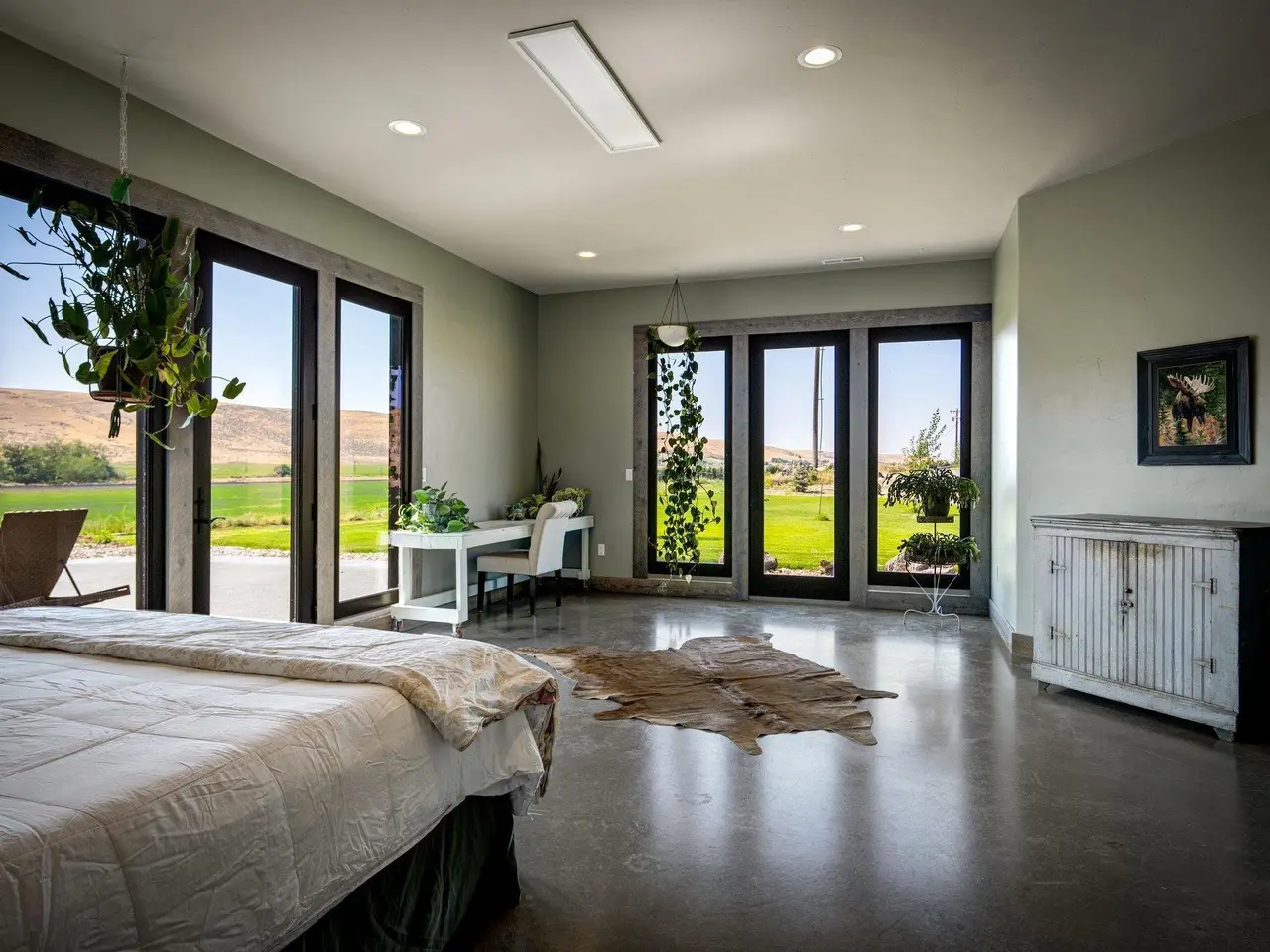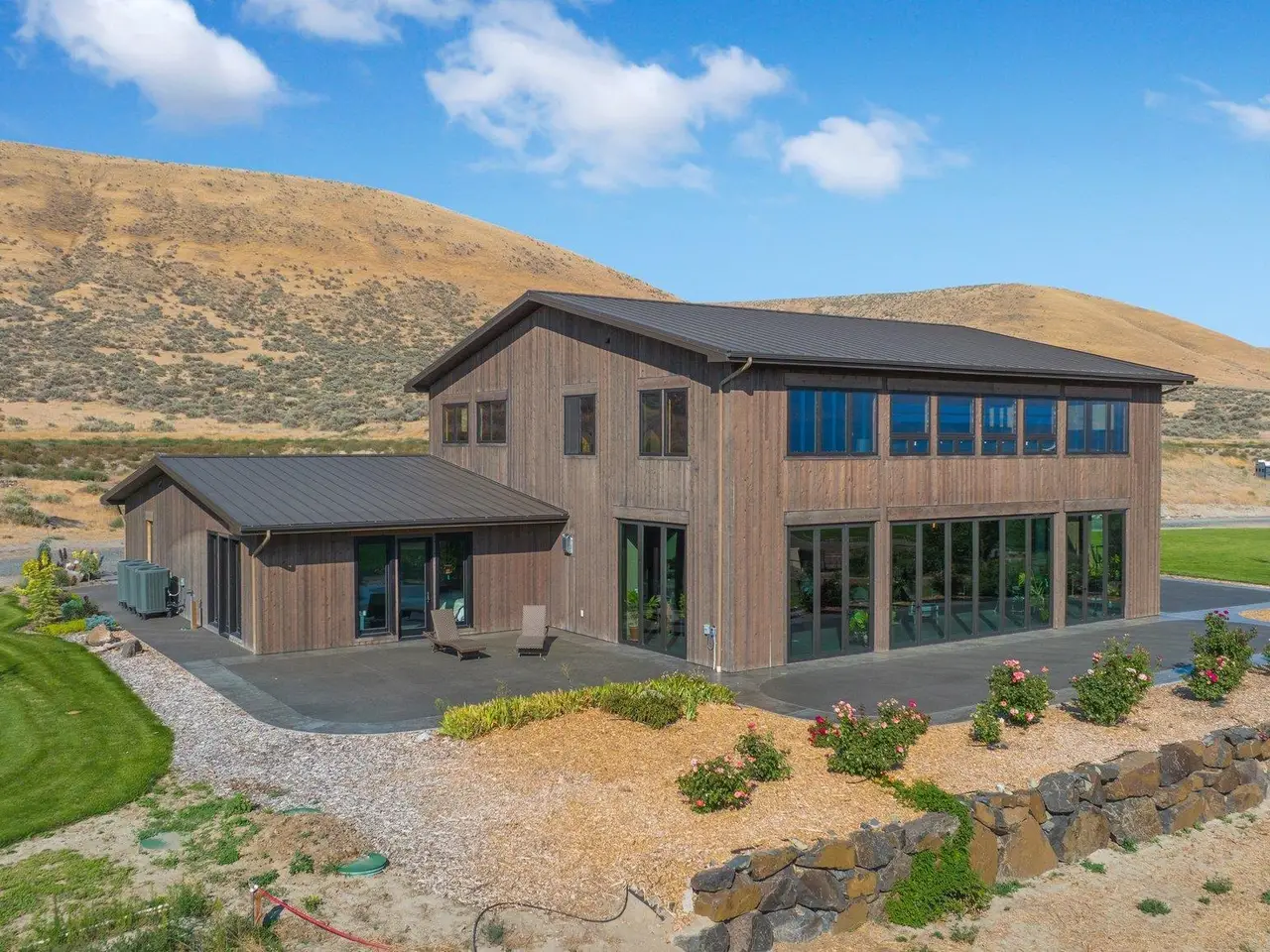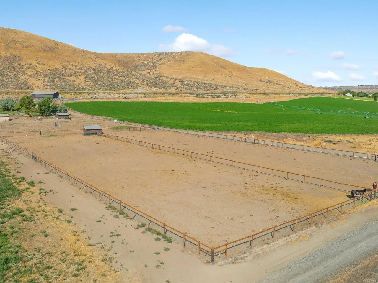 Embrace the rustic charm of country living on this expansive view property that encapsulates the heart and soul of farm life. A span of approximately 46 acres offers both a haven for a myriad of farming and equestrian pursuits, and luxurious countryside dwelling. Surrounded by unparalleled 360-degree views of Badger Canyon is the 7,500 square foot estate home, exuding rustic elegance and offering a seamless blend of character and comfort. The main level spans 5,000 square feet, with an unfinished upper level adding another 2,500 square feet. Two separate two-car garages provide 1,250 square feet of automotive heaven. Unlock a world of indoor-outdoor living with over sixty linear feet of floor-to-ceiling glass panoramic doors and an expansive wrap-around concrete patio. Crafted from Montana Timber Products Ranchwood circle sawn cedar siding, the home effortlessly blends into the surrounding landscape. Step inside and discover the blend of natural elements and modern amenities that make this home so extraordinary. A custom Schonbek crystal chandelier suspended from the twelve-foot ceilings adds elegance and serenity, while the exposed timber and iron beams and hand-stained finished concrete flooring evoke a sense of timelessness and strength to the expansive open-concept design. The kitchen is a chef's dream, with custom soft-closed cabinetry and book-matched backsplash all topped with Brazilian Zumaia quartzite. A commanding seven-foot dual exhaust hood takes center stage, harmonizing with stonework and cabinetry. Designed for culinary enthusiasts and entertaining, the kitchen offers two of everything with dual islands, gas and electric ranges, dishwashers, and refrigerators, and can easily accommodate an entire family of chefs. Explore the 36'x72' workshop, featuring five bays including one pull-through, offering abundant space for diverse uses. Fully insulated and heated, with a RV water and electric hookup on site, and supported by two 200-amp service boxes. The land itself features 24 acres under a pivot, with ten acres in wheel lines, and an additional five acres in solid sets, all in alfalfa. At the heart of the farm, approximately three acres are a dedicated equine facility, featuring five-foot pressure treat and no-climb fencing, a 220'x210' watered riding arena, and a feed and tack shed. For the horses, there are two large turnout areas and four 50'x50' paddocks, each with water, electricity, and matted shelters. Make an appointment today to see the endless possibilities firsthand.
