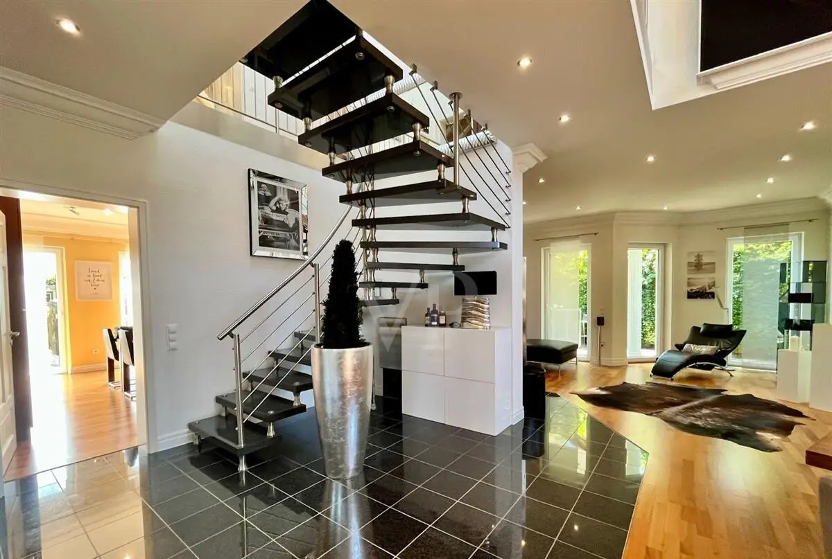 Arrive. Breathe a sigh of relief. Be at home. In the middle of a quiet, discreet residential area, a place awaits you that is more than just a home - it is a lifestyle. This exclusive residence combines architectural elegance with luxurious comfort and noticeable attention to detail. A harmonious interplay of nature, style and privacy unfolds on a plot of around 1,500 m². Spacious living space of approx. 212 m² welcomes you with open wooden beam ceilings, elegant stucco work, warm parquet flooring and high-quality granite. Light, air and space flow into one another - supported by timeless architecture and high-quality materials. WELLNESS & OUTDOOR LIVING IN A CLASS OF ITS OWN: An outdoor area newly created in 2021 that looks like a private resort: an infinity pool with surrounding granite, heated by an air heat pump and powered by solar energy. An outdoor shower surrounded by greenery. A modern CUBE sauna - as a retreat & haven of peace. Copper guttering, natural slate, stainless steel fireplace, custom-made fixtures and fittings and an exclusive fitted kitchen complete the ensemble. A double garage as well as a separate garage and a further building plot create space - for ideas, projects or simply to enjoy. There is also the option of acquiring another property adjacent to the house plot, so that it can also be used for living and working, multi-generational living or for renting out. A place for people who are looking for something special. And want to find it.